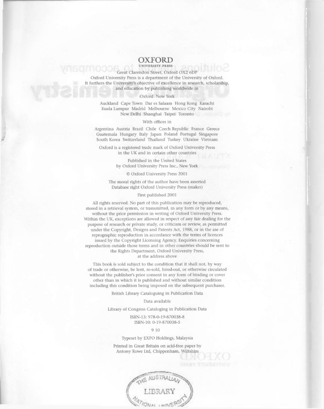 OXFORD UNIVERSITY PRESS Clarendon Street, Oxford OX2 6DP Oxford University Press is a department of the University of Oxford. It furthers the University's objective of excellence in research, scholarship, and education by publishing worldwide in Oxford New York Auckland Cape Town Dar es Salaam Hong Kong Karachi Kuala Lumpur Madrid Melbourne Mexico City Nairobi New Delhi Shanghai Taipei Toronto With offices in Argentina Austria Brazil Chile Czech Republic France Greece Guatemala Hungary Italy Japan Poland Portugal Singapore South Korea Switzerland Thailand Turkey Ukraine Vietnam Oxford is a registered trade mark of Oxford University Press in the UK and in certain other countries Published in the United States by Oxford University Press Inc., New York © Oxford University Press 2001 The moral rights of the author have been asserted Database right Oxford University Press (maker) First published 2001 All rights reserved. No part of this publication may be reproduced, stored in a retrieval system, or transmitted, in any form or by any means, without the prior permission in writing of Oxford University Press. Within the UK, exceptions are allowed in respect of any fair dealing for the purpose of research or private study, or criticism or review, as permitted under the Copyright, Designs and Patents Act, 1988, or in the ase of reprographic reproduction in accordance with the terms of licences issued by the Copyright Licensing Agency. Enquiries concerning reproduction outside those terms and in other countries should be sent to the Rights Department, Oxford University Press, at the address above This book is sold subject to the condition that it shall not, by way of trade or otherwise, be lent, re-sold, hired-out, or otherwise circulated without the publisher's prior consent in any form of binding or cover other than in which it is published and without similar condition including this condition being imposed on the subsequent purchaser. British Library Cataloguing in Publication Data Data available Library of Congress Cataloging in Publication Data ISBN-13: 978-0-19-870038-8 ISBN-10: 0-19-870038-5 9 10 Typeset by EXPO Holdings, Malaysia Printed in Great Britain on acid-free paper by Antony Rowe Ltd, Chippenham, Wiltshire THE AUSTRALIAN LIBRARY NATIONAL