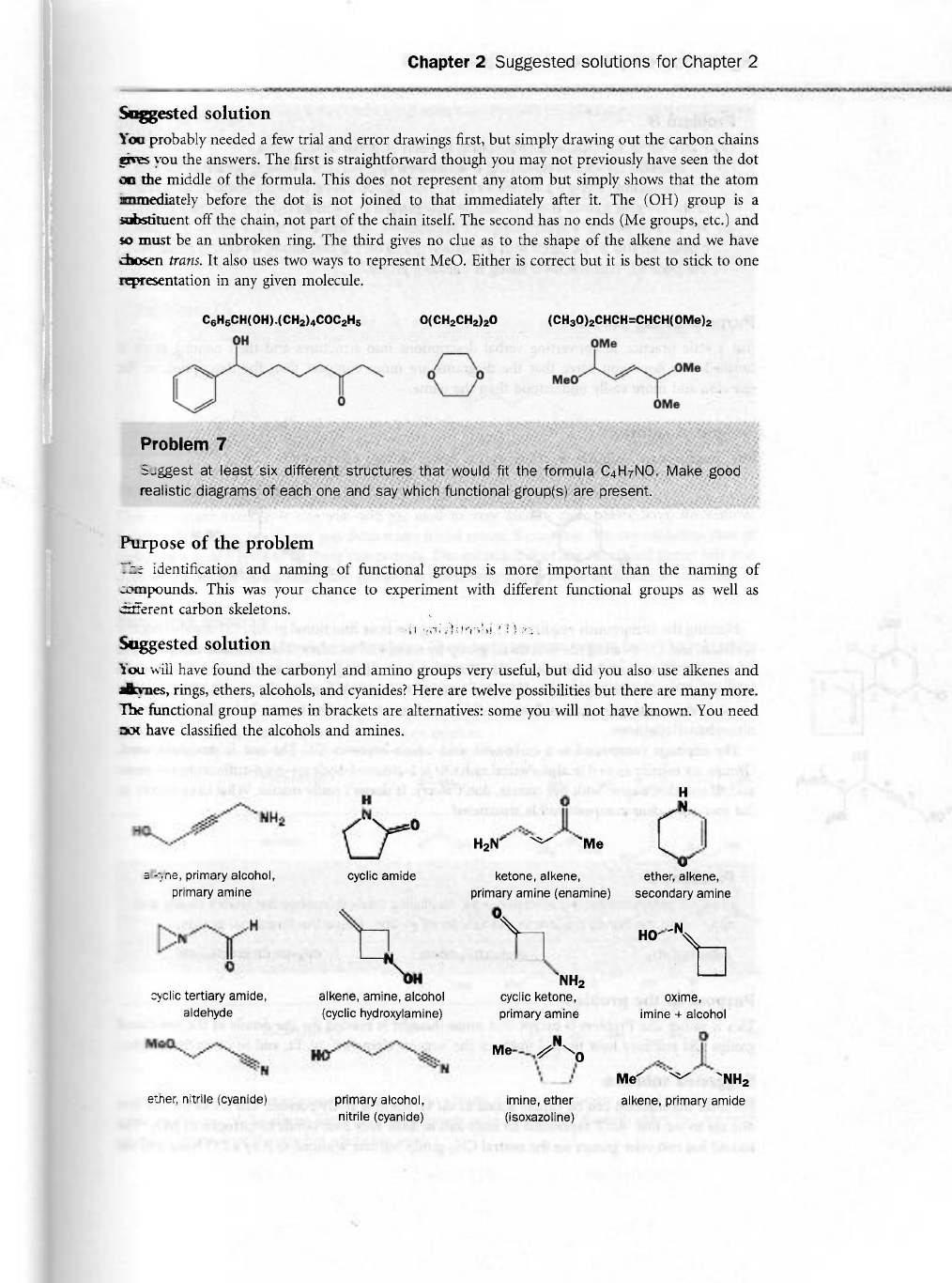 Chapter 2 Suggested solutions for Chapter 2 Suggested solution You probably needed a few trial and error drawings first, but simply drawing out the carbon chains gives you the answers. The first is straightforward though you may not previously have seen the dot on the middle of the formula. This does not represent any atom but simply shows that the atom immediately before the dot is not joined to that immediately after it. The (OH) group is a ostituent off the chain, not part of the chain itself. The second has no ends (Me groups, etc.) and so must be an unbroken ring. The third gives no clue as to the shape of the alkene and we have chosen trans. It also uses two ways to represent MeO. Either is correct but it is best to stick to one representation in any given molecule. O(CH₂CH₂)₂O OMe OMe 0 0 MeO 0 OMe Problem 7 Suggest at least six different structures that would fit the formula Make good realistic diagrams of each one and say which functional group(s) are present. Purpose of the problem The identification and naming of functional groups is more important than the naming of compounds. This was your chance to experiment with different functional groups as well as different carbon skeletons. Suggested solution You will have found the carbonyl and amino groups very useful, but did you also use alkenes and rings, ethers, alcohols, and cyanides? Here are twelve possibilities but there are many more. The functional group names in brackets are alternatives: some you will not have known. You need have classified the alcohols and amines. H H N NH₂ N 0 Me 0 primary alcohol, cyclic amide ketone, alkene, ether, alkene, primary amine primary amine (enamine) secondary amine 0 H N N Ho N NH₂ cyclic tertiary amide, alkene, amine, alcohol cyclic ketone, oxime, aldehyde (cyclic hydroxylamine) primary amine imine + alcohol N Me 0 N N Me ether, nitrile (cyanide) primary alcohol, imine, ether alkene, primary amide nitrile (cyanide) (isoxazoline)