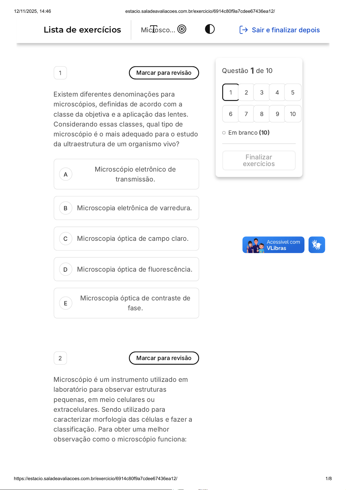 A B C D E 1 Marcar para revisão Existem diferentes denominações para microscópios, definidas de acordo com a classe da objetiva e a aplicação das lentes. Considerando essas classes, qual tipo de microscópio é o mais adequado para o estudo da ultraestrutura de um organismo vivo? Microscópio eletrônico de transmissão. Microscopia eletrônica de varredura. Microscopia óptica de campo claro. Microscopia óptica de fluorescência. Microscopia óptica de contraste de fase. 2 Marcar para revisão Microscópio é um instrumento utilizado em laboratório para observar estruturas pequenas, em meio celulares ou extracelulares. Sendo utilizado para caracterizar morfologia das células e fazer a classificação. Para obter uma melhor observação como o microscópio funciona: Questão 1 de 10 Em branco (10) 1 2 3 4 5 6 7 8 9 10 Finalizar exercícios Lista de exercícios Microsco… Sair e finalizar depois 12/11/2025, 14:46 estacio.saladeavaliacoes.com.br/exercicio/6914c80f9a7cdee67436ea12/ https://estacio.saladeavaliacoes.com.br/exercicio/6914c80f9a7cdee67436ea12/ 1/8 A B C D E Emitindo uma luz para local e melhorando a iluminação. Através de jogos de espelho em seu sistema que ajuda da informação da imagem passada. Ampliação da imagem pela combinação de suas lentes oculares e objetivas. Ampliação da imagem através do jogo de espelhos com influência da luz emitida. Através do jogo de espelhos emitindo a imagem para a lentes ocular. 3 Marcar para revisão Dependendo do tipo de amostra e necessidade do pesquisador, há um tipo de microscopia que é a mais indicada. Sabe-se que o HER-2, fator de crescimento epidermal, é altamente expresso nas células cancerígeras, podendo ser localizado no citoplasma e próximo ao núcleo celular. No caso de um diagnóstico a partir de duas biópsias de pacientes suspeitos, que seja necessário localizar essa molécula no interior das células, qual tipo de microscopia você utilizaria? 12/11/2025, 14:46 estacio.saladeavaliacoes.com.br/exercicio/6914c80f9a7cdee67436ea12/ https://estacio.saladeavaliacoes.com.br/exercicio/6914c80f9a7cdee67436ea12/ 2/8 A B C D E A B C Microscopia de polarização Microscopia eletrônica de varredura Microscopia de contraste de fase Microscopia de contraste interferencial diferencial Microscopia de fluorescência 4 Marcar para revisão O microscópio tem a capacidade de aumentar a imagem pequenas, que estão sendo visualizadas com seu potencial de resolução. Essa função acontece por características da luz e das lentes ópticas e objetivas. Além dessas características há fenômenos físicos que ajudam a melhorar resolução, como a capacidade das ondas contornar o obstáculo, para processo de formação da imagem e resolução para lente. De acordo com contexto de qual fenômeno físico o texto está se referindo: Reflexão Absorção Refração 12/11/2025, 14:46 estacio.saladeavaliacoes.com.br/exercicio/6914c80f9a7cdee67436ea12/ https://estacio.saladeavaliacoes.com.br/exercicio/6914c80f9a7cdee67436ea12/ 3/8 D E A B C Difração Espalhamento 5 Marcar para revisão Na microscopia de fluorescência, utiliza-se um tipo específico de filtro, conhecido como espelho dicroico. Esse espelho: permite que comprimentos de onda acima de 750 nm passem por ele e ao mesmo tempo reflete todos os comprimentos de onda abaixo de 750 nm. permite que uma luz de determinado comprimento de onda o atravesse enquanto reflete as demais. decompõe a luz em três faixas específicas de comprimentos de onda s dentro das cores azul, verde e vermelho do espectro da luz visível. 12/11/2025, 14:46 estacio.saladeavaliacoes.com.br/exercicio/6914c80f9a7cdee67436ea12/ https://estacio.saladeavaliacoes.com.br/exercicio/6914c80f9a7cdee67436ea12/ 4/8 D E A B C D E é capaz de separar a luz emitida em dois feixes enviando-os em direções diferentes de modo a serem detectados por fotodetectores específicos. recebe dois feixes de ondas de posições diferentes dentro dos microscópios e tem a propriedade de combiná-los em um único feixe para que a amostra seja iluminada de forma homogênea. 6 Marcar para revisão Sobre os conceitos básicos da microscopia de luz, temos as seguintes afirmativas abaixo: I - A magnificação indica quantas vezes a objetiva é capaz de ampliar a imagem. II - Óleo, água e glicerina são meios de imersão utilizados na microscopia. III - O diafragma do condensador regula a quantidade de luz que entra no condensador, permitindo o ajuste da ampliação. Qual alternativa está correta? Somente a afirmativa I Somente a afirmativa II Somente as afirmativas I e II Somente as afirmativas I e III Somente as afirmativas III e II 12/11/2025, 14:46 estacio.saladeavaliacoes.com.br/exercicio/6914c80f9a7cdee67436ea12/ https://estacio.saladeavaliacoes.com.br/exercicio/6914c80f9a7cdee67436ea12/ 5/8 A B C D E 7 Marcar para revisão Um técnico de laboratório recebeu uma lâmina de tecido cerebral corado com hematoxilina-eosina. Em seguida, utilizando um microscópio de campo claro, deu início à avaliação com a objetiva de 40x. Marque a opção correta da utilização do microscópio. O técnico utilizou o micrométrico para o ajuste "grosseiro" e depois o macrométrico para o ajuste "fino". Foi utilizado glicerol como meio de imersão. Para locomover a lâmina para direita ou esquerda, o técnico utilizou o charriot. Com o objetivo de aumentar a luminosidade, o técnico ajustou a platina. Utilizou o condensador com o objetivo de aumentar a resolução da imagem. 8 Marcar para revisão A microscopia de campo claro comum é altamente difundida e aplicada no campo da pesquisa e das análises clínicas. Sobre essa modalidade de observação em microscopia de luz é correto afirmar que: 12/11/2025, 14:46 estacio.saladeavaliacoes.com.br/exercicio/6914c80f9a7cdee67436ea12/ https://estacio.saladeavaliacoes.com.br/exercicio/6914c80f9a7cdee67436ea12/ 6/8 A B C D E A B C Permite a visualização de células e organismos vivos, não sen