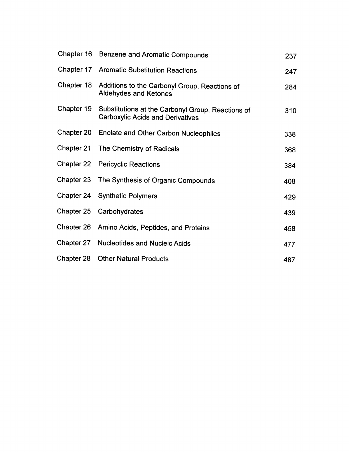 Chapter 16 Benzene and Aromatic Compounds 237 Chapter 17 Aromatic Substitution Reactions 247 Chapter 18 Additions to the Carbonyl Group, Reactions of 284 Aldehydes and Ketones Chapter 19 Substitutions at the Carbonyl Group, Reactions of 310 Carboxylic Acids and Derivatives Chapter 20 Enolate and Other Carbon Nucleophiles 338 Chapter 21 The Chemistry of Radicals 368 Chapter 22 Pericyclic Reactions 384 Chapter 23 The Synthesis of Organic Compounds 408 Chapter 24 Synthetic Polymers 429 Chapter 25 Carbohydrates 439 Chapter 26 Amino Acids, Peptides, and Proteins 458 Chapter 27 Nucleotides and Nucleic Acids 477 Chapter 28 Other Natural Products 487