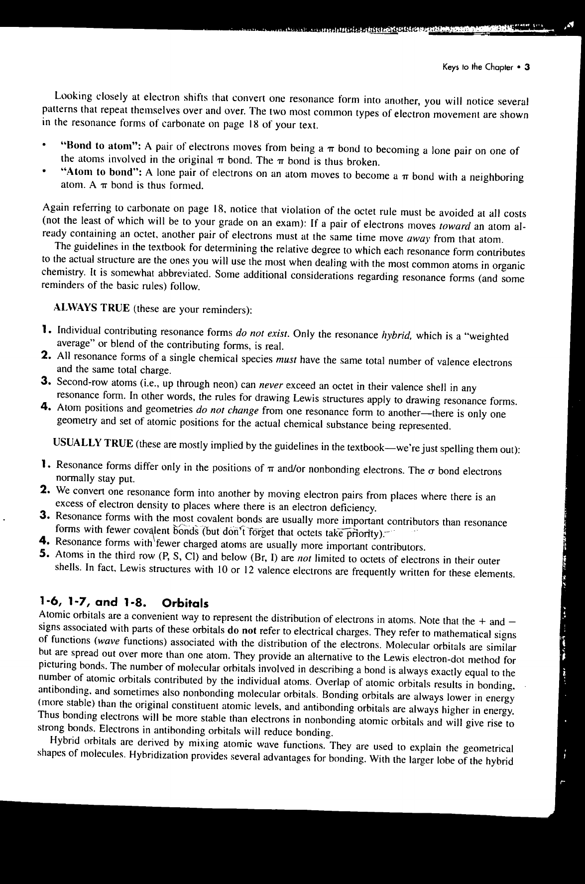 Keys to the Chapter 3 Looking closely at electron shifts that convert one resonance form into another, you will notice several patterns that repeat themselves over and over. The two most common types of electron movement are shown in the resonance forms of carbonate on page 18 of your text. "Bond to atom": A pair of electrons moves from being a bond to becoming a lone pair on one of the atoms involved in the original bond. The bond is thus broken. "Atom to bond": A lone pair of electrons on an atom moves to become a bond with a neighboring atom. A TT bond is thus formed. Again referring to carbonate on page 18, notice that violation of the octet rule must be avoided at all costs (not the least of which will be to your grade on an exam): If a pair of electrons moves toward an atom al- ready containing an octet, another pair of electrons must at the same time move away from that atom. The guidelines in the textbook for determining the relative degree to which each resonance form contributes to the actual structure are the ones you will use the most when dealing with the most common atoms in organic chemistry. It is somewhat abbreviated. Some additional considerations regarding resonance forms (and some reminders of the basic rules) follow. ALWAYS TRUE (these are your reminders): 1. Individual contributing resonance forms do not exist. Only the resonance hybrid, which is a "weighted average" or blend of the contributing forms, is real. 2. All resonance forms of a single chemical species must have the same total number of valence electrons and the same total charge. 3. Second-row atoms (i.e., up through neon) can never exceed an octet in their valence shell in any resonance form. In other words, the rules for drawing Lewis structures apply to drawing resonance forms. 4. Atom positions and geometries do not change from one resonance form to another-there is only one geometry and set of atomic positions for the actual chemical substance being represented. USUALLY TRUE (these are mostly implied by the guidelines in the textbook-we're just spelling them out): 1. Resonance forms differ only in the positions of and/or nonbonding electrons. The σ bond electrons normally stay put. 2. We convert one resonance form into another by moving electron pairs from places where there is an excess of electron density to places where there is an electron deficiency. 3. Resonance forms with the most covalent bonds are usually more important contributors than resonance forms with fewer covalent bonds (but don't forget that octets take priority). 4. Resonance forms with fewer charged atoms are usually more important contributors. 5. Atoms in the third row (P, S, Cl) and below (Br, I) are not limited to octets of electrons in their outer shells. In fact, Lewis structures with 10 or 12 valence electrons are frequently written for these elements. 1-6, 1-7, and 1-8. Orbitals Atomic orbitals are a convenient way to represent the distribution of electrons in atoms. Note that the + and signs associated with parts of these orbitals do not refer to electrical charges. They refer to mathematical signs of functions (wave functions) associated with the distribution of the electrons. Molecular orbitals are similar but are spread out over more than one atom. They provide an alternative to the Lewis electron-dot method for picturing bonds. The number of molecular orbitals involved in describing a bond is always exactly equal to the number of atomic orbitals contributed by the individual atoms. Overlap of atomic orbitals results in bonding. and sometimes also nonbonding molecular orbitals. Bonding orbitals are always lower in energy (more stable) than the original constituent atomic levels, and antibonding orbitals are always higher in energy. Thus bonding electrons will be more stable than electrons in nonbonding atomic orbitals and will give rise to strong bonds. Electrons in antibonding orbitals will reduce bonding. Hybrid orbitals are derived by mixing atomic wave functions. They are used to explain the geometrical shapes of molecules. Hybridization provides several advantages for bonding. With the larger lobe of the hybrid
