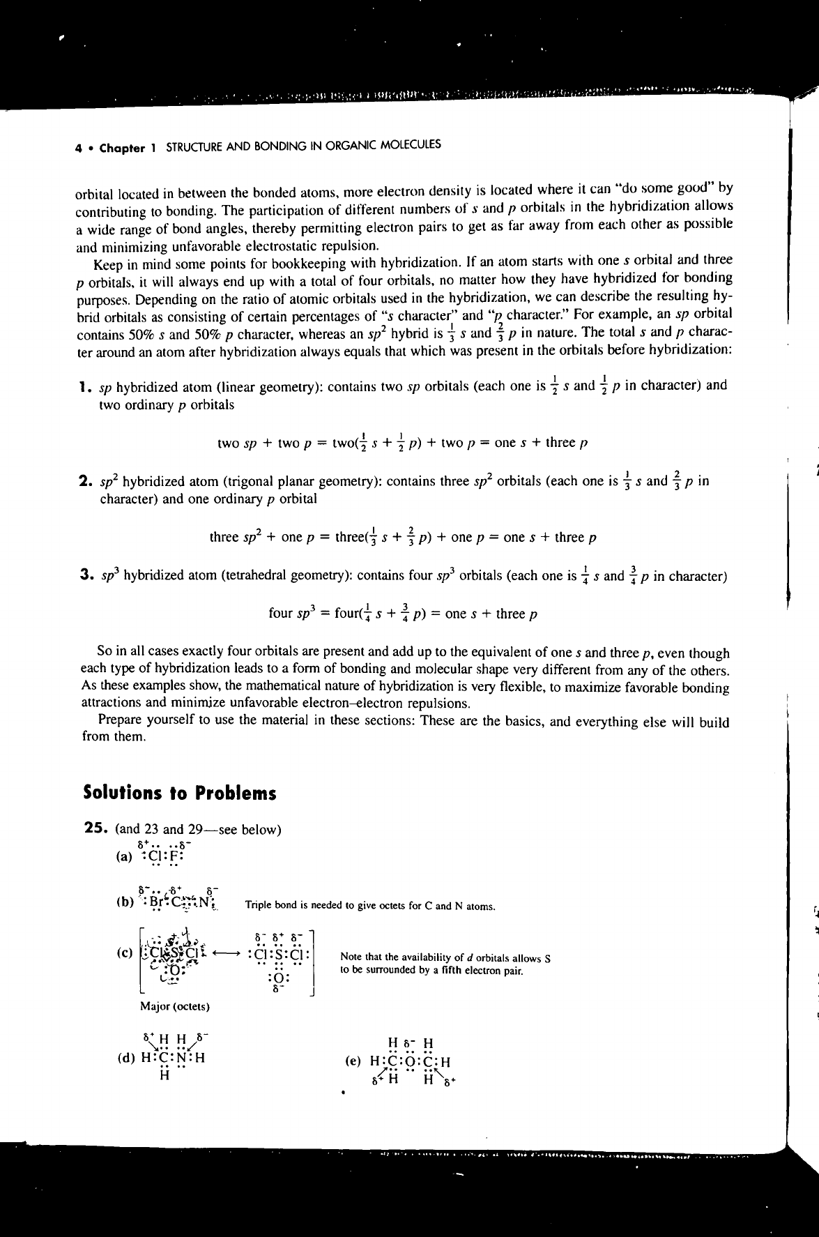 4 Chapter 1 STRUCTURE AND BONDING IN ORGANIC MOLECULES orbital located in between the bonded atoms, more electron density is located where it can "do some good" by contributing to bonding. The participation of different numbers of and p orbitals in the hybridization allows a wide range of bond angles, thereby permitting electron pairs to get as far away from each other as possible and minimizing unfavorable electrostatic repulsion. Keep in mind some points for bookkeeping with hybridization. If an atom starts with one orbital and three orbitals, it will always end up with a total of four orbitals, no matter how they have hybridized for bonding purposes. Depending on the ratio of atomic orbitals used in the hybridization, we can describe the resulting hy- brid orbitals as consisting of certain percentages of "s character" and "p character." For example, an sp orbital contains 50% and 50% character, whereas an sp² hybrid is 3 s and 3 p in nature. The total S and p charac- ter around an atom after hybridization always equals that which was present in the orbitals before hybridization: 1. sp hybridized atom (linear geometry): contains two sp orbitals (each one is 1/2 and 1/2 in character) and two ordinary p orbitals two sp + two p = two + p) + two p = one + three p 2 2. sp² hybridized atom (trigonal planar geometry): contains three sp² orbitals (each one is 1/3 s and 2/3 p in character) and one ordinary p orbital three + one p = three + p) + one p = one + three p 3. sp³ hybridized atom (tetrahedral geometry): contains four sp³ orbitals (each one is 1/4 and 3/4 4 p in character) four sp³ = + p) = one + three p So in all cases exactly four orbitals are present and add up to the equivalent of one S and three p, even though each type of hybridization leads to a form of bonding and molecular shape very different from any of the others. As these examples show, the mathematical nature of hybridization is very flexible, to maximize favorable bonding attractions and minimize unfavorable electron-electron repulsions. Prepare yourself to use the material in these sections: These are the basics, and everything else will build from them. Solutions to Problems 25. (and 23 and below) δ⁺ (a) (b) Br Triple bond is needed to give octets for C and N atoms. is δ⁺ (c) :CI:S:CI: Note that the availability of d orbitals allows S to be surrounded by a fifth electron pair. :0: is Major (octets) (d) H:C:N:H (e) H H H