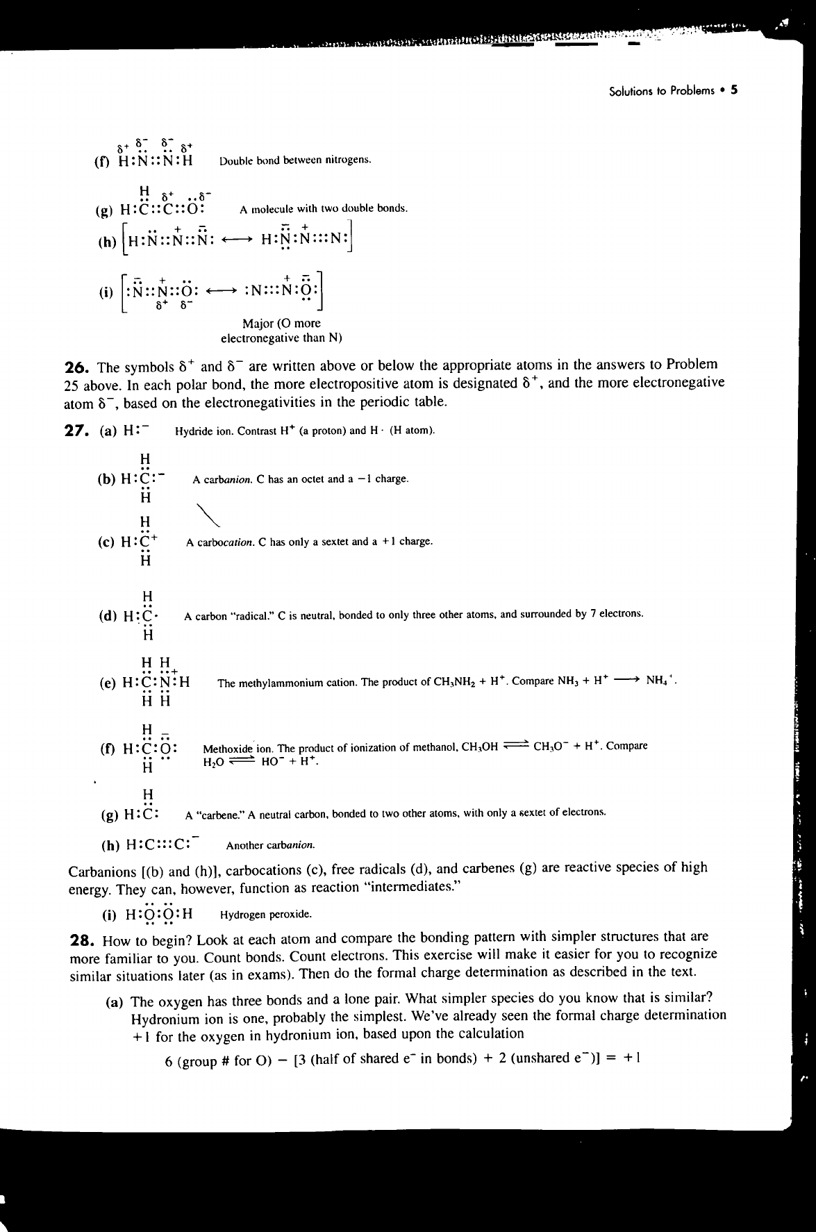Solutions to Problems 5 δ⁺ (f) H:N::N:H Double bond between nitrogens. H δ⁺ (g) H:C::C::0: A molecule with two double bonds. + (h) H:N::N::N: H:N:N:::N: (i) Major (O more electronegative than N) 26. The symbols δ⁺ and δ⁻ are written above or below the appropriate atoms in the answers to Problem 25 above. In each polar bond, the more electropositive atom is designated δ⁺, and the more electronegative atom δ⁻, based on the electronegativities in the periodic table. 27. (a) H:- Hydride ion. Contrast (a proton) and H (H atom). H (b) H:C:- A carbanion. C has an octet and a - 1 charge. H H (c) A carbocation. C has only a sextet and a +1 charge. H H (d) A carbon "radical." C is neutral, bonded to only three other atoms, and surrounded by 7 electrons. H HH (e) H:C:N:H The methylammonium cation. The product of CH₃NH₂ + Compare + HH H (f) H:C:O: Methoxide ion. The product of ionization of methanol, CH₃O⁻ + Compare H H2O + H (g) H:C: A "carbene." A neutral carbon, bonded to two other atoms, with only a sextet of electrons. (h) Another carbanion. Carbanions [(b) and (h)], carbocations (c), free radicals (d), and carbenes (g) are reactive species of high energy. They can, however, function as reaction "intermediates." (i) Hydrogen peroxide. 28. How to begin? Look at each atom and compare the bonding pattern with simpler structures that are more familiar to you. Count bonds. Count electrons. This exercise will make it easier for you to recognize similar situations later (as in exams). Then do the formal charge determination as described in the text. (a) The oxygen has three bonds and a lone pair. What simpler species do you know that is similar? Hydronium ion is one, probably the simplest. We've already seen the formal charge determination +1 for the oxygen in hydronium ion, based upon the calculation 6 (group # for O) - [3 (half of shared e- in bonds) + 2 (unshared e⁻)] = +1