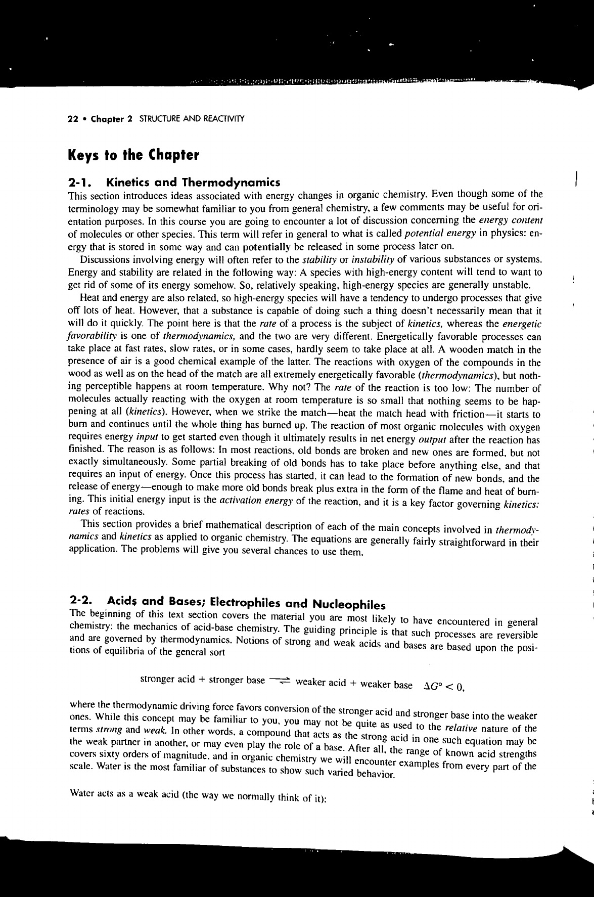 22 Chapter 2 STRUCTURE AND REACTIVITY Keys to the Chapter 2-1. Kinetics and Thermodynamics This section introduces ideas associated with energy changes in organic chemistry. Even though some of the terminology may be somewhat familiar to you from general chemistry, a few comments may be useful for ori- entation purposes. In this course you are going to encounter a lot of discussion concerning the energy content of molecules or other species. This term will refer in general to what is called potential energy in physics: en- ergy that is stored in some way and can potentially be released in some process later on. Discussions involving energy will often refer to the stability or instability of various substances or systems. Energy and stability are related in the following way: A species with high-energy content will tend to want to get rid of some of its energy somehow. So, relatively speaking, high-energy species are generally unstable. Heat and energy are also related, so high-energy species will have a tendency to undergo processes that give off lots of heat. However, that a substance is capable of doing such a thing doesn't necessarily mean that it will do it quickly. The point here is that the rate of a process is the subject of kinetics, whereas the energetic favorability is one of thermodynamics, and the two are very different. Energetically favorable processes can take place at fast rates, slow rates, or in some cases, hardly seem to take place at all. A wooden match in the presence of air is a good chemical example of the latter. The reactions with oxygen of the compounds in the wood as well as on the head of the match are all extremely energetically favorable (thermodynamics), but noth- ing perceptible happens at room temperature. Why not? The rate of the reaction is too low: The number of molecules actually reacting with the oxygen at room temperature is so small that nothing seems to be hap- pening at all (kinetics). However, when we strike the match-heat the match head with friction-it starts to burn and continues until the whole thing has burned up. The reaction of most organic molecules with oxygen requires energy input to get started even though it ultimately results in net energy output after the reaction has finished. The reason is as follows: In most reactions, old bonds are broken and new ones are formed. but not exactly simultaneously. Some partial breaking of old bonds has to take place before anything else, and that requires an input of energy. Once this process has started, it can lead to the formation of new bonds, and the release of energy-enough to make more old bonds break plus extra in the form of the flame and heat of burn- ing. This initial energy input is the activation energy of the reaction, and it is a key factor governing kinetics: rates of reactions. This section provides a brief mathematical description of each of the main concepts involved in thermody- namics and kinetics as applied to organic chemistry. The equations are generally fairly straightforward in their application. The problems will give you several chances to use them. 2-2. Acids and Bases; Electrophiles and Nucleophiles The beginning of this text section covers the material you are most likely to have encountered in general chemistry: the mechanics of acid-base chemistry. The guiding principle is that such processes are reversible and are governed by thermodynamics. Notions of strong and weak acids and bases are based upon the posi- tions of equilibria of the general sort stronger acid + stronger base weaker acid + weaker base where the thermodynamic driving force favors conversion of the stronger acid and stronger base into the weaker ones. While this concept may be familiar to you, you may not be quite as used to the relative nature of the terms strong and weak. In other a compound that acts as the strong acid in one such equation may be the weak partner in another, or may even play the role of a base. After all, the range of known acid strengths covers sixty orders of magnitude, and in organic chemistry we will encounter examples from every part of the scale. Water is the most familiar of substances to show such varied behavior. Water acts as a weak acid (the way we normally think of it):