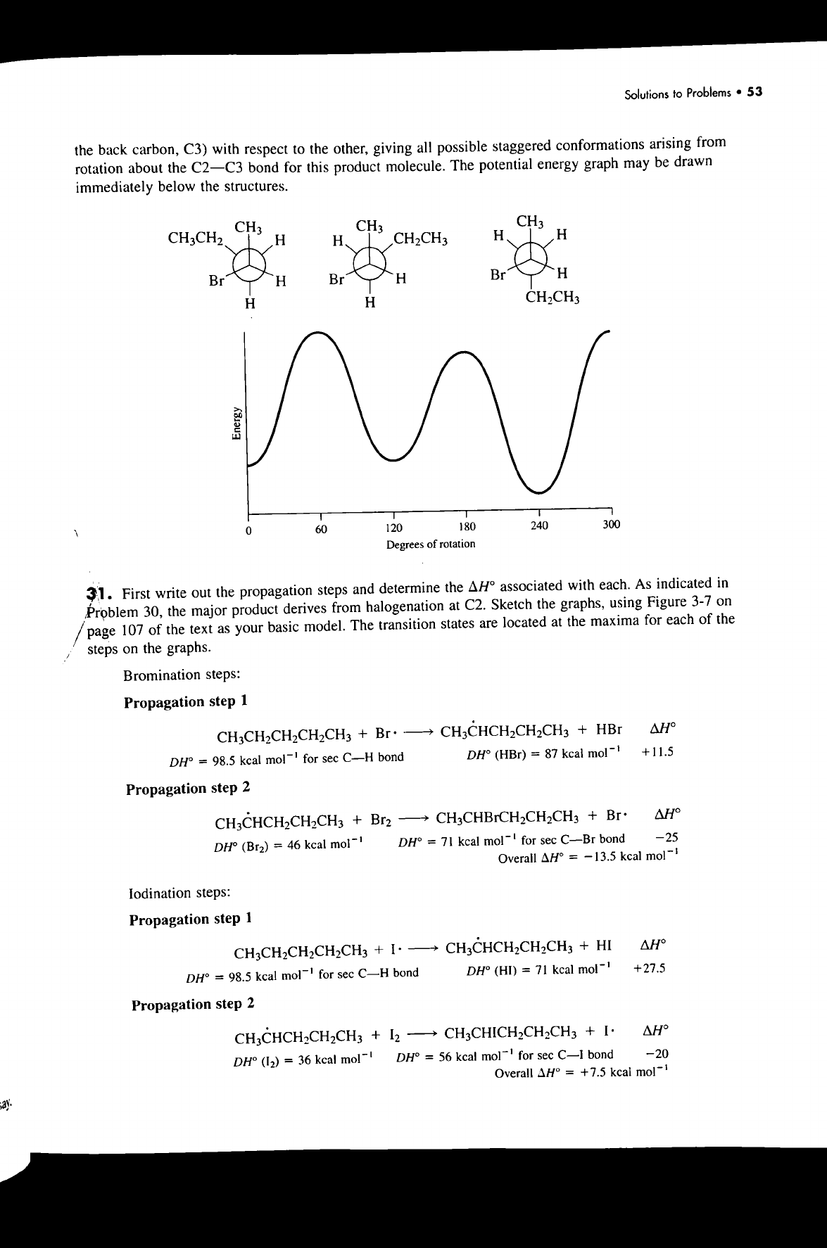 Solutions to Problems 53 the back carbon, C3) with respect to the other, giving all possible staggered conformations arising from rotation about the C2-C3 bond for this product molecule. The potential energy graph may be drawn immediately below the structures. CH₃ CH₃ CH₃ CH₃CH₂ H H CH₂CH₃ H H Br H Br H Br H H H CH₂CH₃ Energy 0 60 120 180 240 300 Degrees of rotation 31. First write out the propagation steps and determine the associated with each. As indicated in Problem 30, the major product derives from halogenation at C2. Sketch the graphs, using Figure 3-7 on page 107 of the text as your basic model. The transition states are located at the maxima for each of the steps on the graphs. Bromination steps: Propagation step 1 CH₃CH₂CH₂CH₂CH₃ + CH₃CHCH₂CH₂CH₃ + HBr DH° = 98.5 kcal mol⁻¹ for sec C-H bond DH° (HBr) = 87 kcal +11.5 Propagation step 2 CH₃CHCH₂CH₂CH₃ + Br₂ + Br. DH° (Br₂) = 46 kcal mol⁻¹ DH° = 71 kcal for sec C-Br bond -25 Overall = 13.5 kcal Iodination steps: Propagation step 1 CH₃CH₂CH₂CH₂CH₃ + CH₃CHCH₂CH₂CH₃ + HI DH° = 98.5 kcal mol⁻ for sec C-H bond DH° (HI) = 71 kcal mol⁻¹ +27.5 Propagation step 2 + I₂ CH₃CHICH₂CH₂CH₃ + DH° = 36 kcal mol⁻¹ DH° = 56 kcal mol⁻¹ for sec bond -20 Overall = +7.5 kcal mol⁻¹
