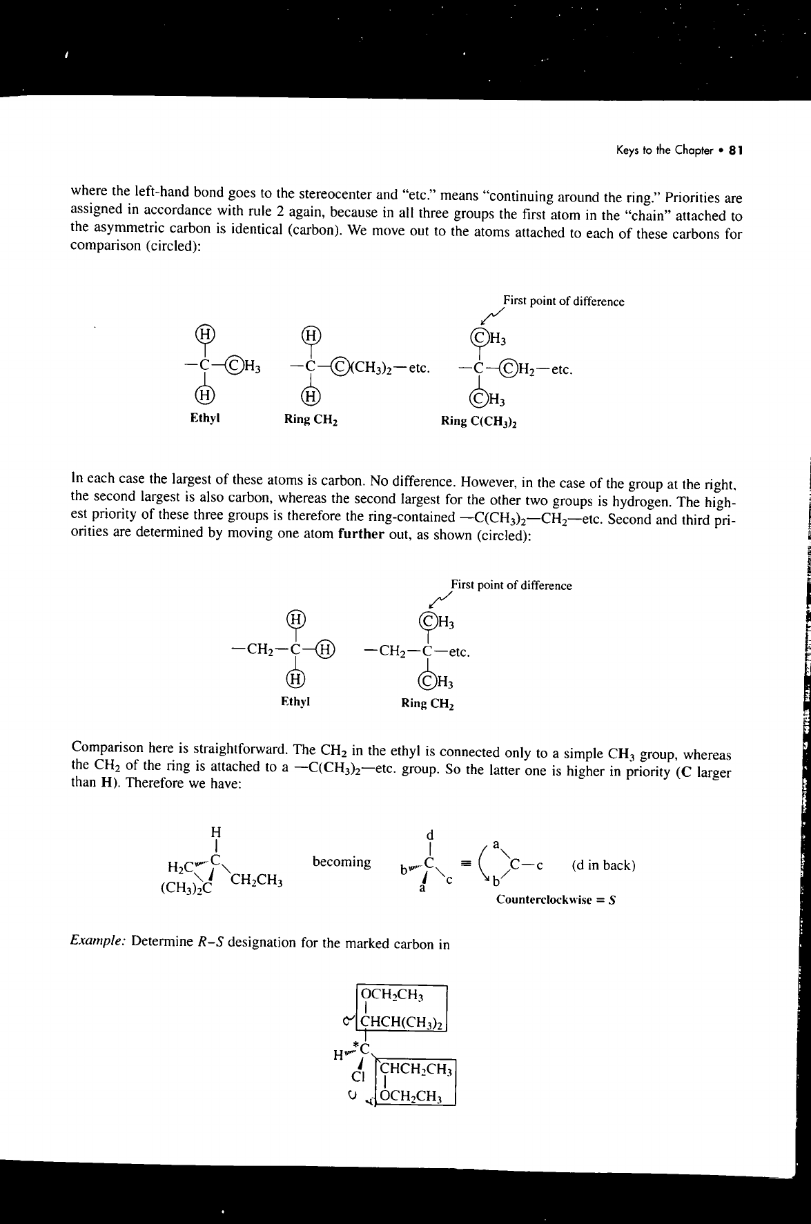 Keys to the Chapter 81 where the left-hand bond goes to the stereocenter and "etc." means "continuing around the ring." Priorities are assigned in accordance with rule 2 again, because in all three groups the first atom in the "chain" attached to the asymmetric carbon is identical (carbon). We move out to the atoms attached to each of these carbons for comparison (circled): First point of difference H H C H₃ C C H₃ C C C C H₂ etc. H H C H₃ Ethyl Ring CH₂ Ring C(CH₃)₂ In each case the largest of these atoms is carbon. No difference. However, in the case of the group at the right, the second largest is also carbon, whereas the second largest for the other two groups is hydrogen. The high- est priority of these three groups is therefore the ring-contained Second and third pri- orities are determined by moving one atom further out, as shown (circled): First point of difference H C H₃ CH₂ C H CH₂ C etc. H C H₃ Ethyl Ring CH₂ Comparison here is straightforward. The CH₂ in the ethyl is connected only to a simple CH₃ group, whereas the CH₂ of the ring is attached to a group. So the latter one is higher in priority (C larger than H). Therefore we have: H d a C becoming C III C c (d in back) b CH₂CH₃ b (CH₃)₂C a Counterclockwise = S Example: Determine R-S designation for the marked carbon in CHCH(CH₃)₂ * C H CHCH₂CH₃ CI