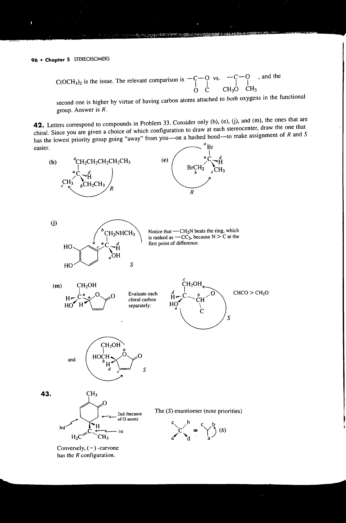 96 Chapter 5 STEREOISOMERS C(OCH₃)₂ is the issue. The relevant comparison is C O , and the C CH₃ second one is higher by virtue of having carbon atoms attached to both oxygens in the functional group. Answer is R. 42. Letters correspond to compounds in Problem 33. Consider only (b), (e), (j), and (m), the ones that are chiral. Since you are given a choice of which configuration to draw at each stereocenter, draw the one that has the lowest priority group going "away" from you-on a hashed bond-to make assignment of R and S easier. a Br (b) (e) * C d H * C d BrCH₂ b c CH₃ H CH₃ c bCH₂CH₃ R R (j) b CH₂NHCH₃ Notice that CH₂N beats the ring, which is ranked as CC₃, because N>C at the * C d HO first point of difference. c H OH a HO S c (m) CH₂OH CH₂OH d C * H Evaluate each * C b O CHCO > chiral carbon H CH H separately: HO a C S CH₂OH a HOCH O and b H d c S 43. CH₃ 2nd (because The (S) enantiomer (note priorities) of 0 atom) c b 3rd H b C 1st C III (S) CH₃ a a Conversely, (-) -carvone has the R configuration.