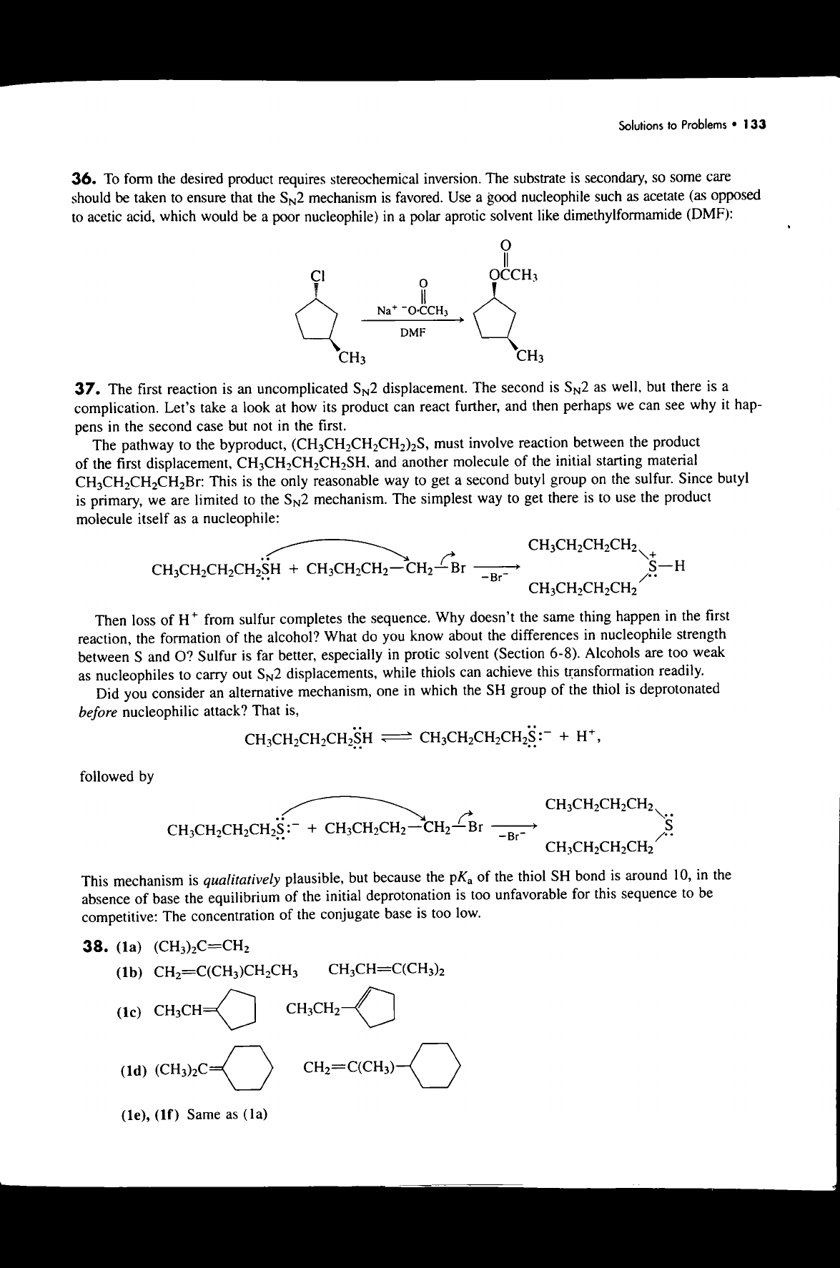 Solutions to Problems 133 36. To form the desired product requires stereochemical inversion. The substrate is secondary, so some care should be taken to ensure that the SN2 mechanism is favored. Use a good nucleophile such as acetate (as opposed to acetic acid, which would be a poor nucleophile) in a polar aprotic solvent like dimethylformamide (DMF): CI OCCH₃ 0 DMF CH₃ CH₃ 37. The first reaction is an uncomplicated displacement. The second is as well, but there is a complication. Let's take a look at how its product can react further, and then perhaps we can see why it hap- pens in the second case but not in the first. The pathway to the byproduct, (CH₃CH₂CH₂CH₂)₂S, must involve reaction between the product of the first displacement, and another molecule of the initial starting material CH₃CH₂CH₂CH₂Br: This is the only reasonable way to get a second butyl group on the sulfur. Since butyl is primary, we are limited to the mechanism. The simplest way to get there is to use the product molecule itself as a nucleophile: CH₃CH₂CH₂CH₂ + S-H CH₃CH₂CH₂CH₂ Then loss of from sulfur completes the sequence. Why doesn't the same thing happen in the first reaction, the formation of the alcohol? What do you know about the differences in nucleophile strength between S and O? Sulfur is far better, especially in protic solvent (Section 6-8). Alcohols are too weak as nucleophiles to carry out SN2 displacements, while thiols can achieve this transformation readily. Did you consider an alternative mechanism, one in which the SH group of the thiol is deprotonated before nucleophilic attack? That is, CH₃CH₂CH₂CH₂S: followed by CH₃CH₂CH₂CH₂ + CH₃CH₂CH₂CH₂ This mechanism is qualitatively plausible, but because the of the thiol SH bond is around 10, in the absence of base the equilibrium of the initial deprotonation is too unfavorable for this sequence to be competitive: The concentration of the conjugate base is too low. 38. (1a) (CH₃)₂C=CH₂ (1b) (1c) CH₃CH₂ (1d) (CH₃)₂C= CH₂=C(CH₃) (1e), (1f) Same as