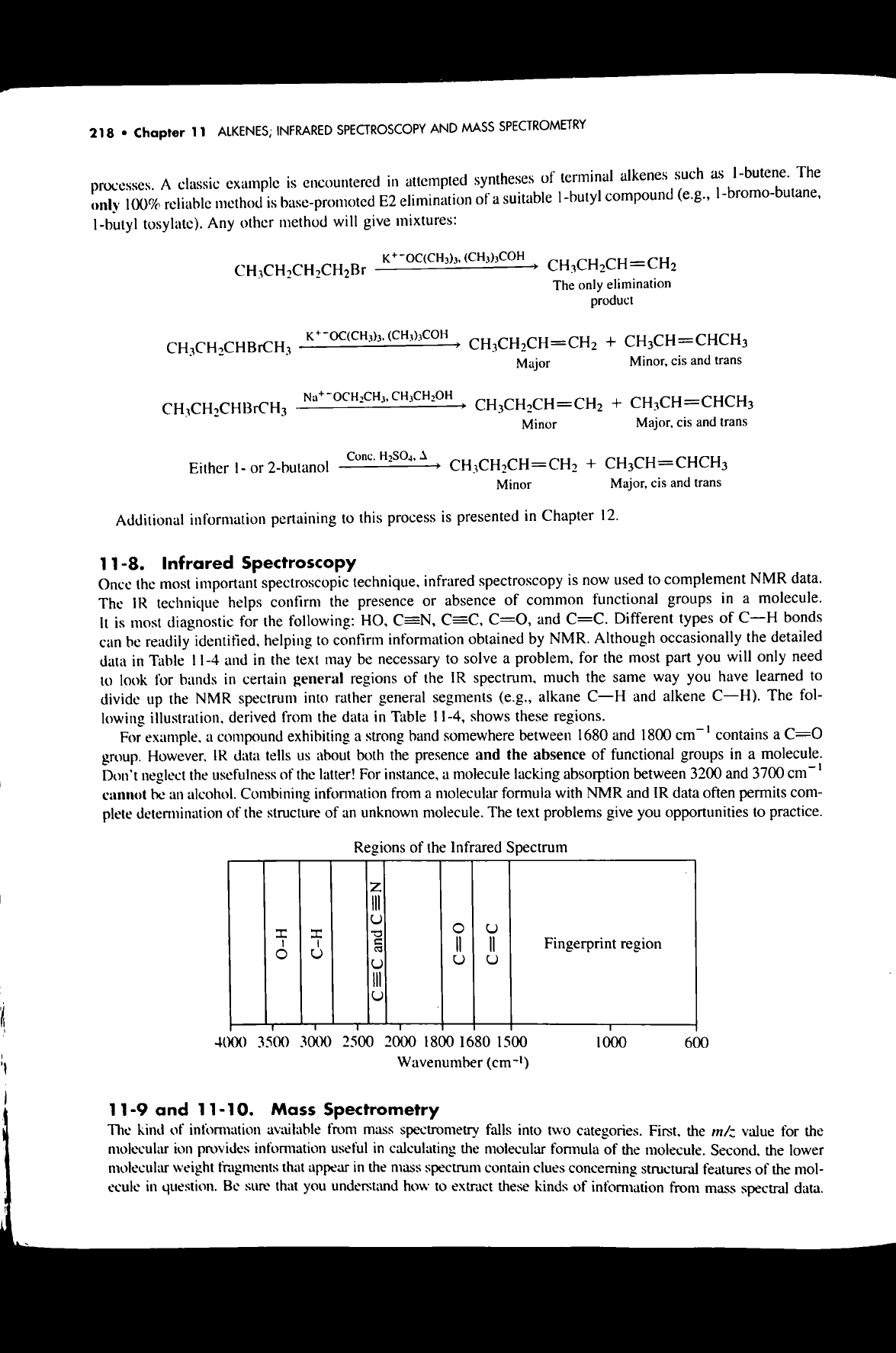 218 Chapter 11 ALKENES; INFRARED SPECTROSCOPY AND MASS SPECTROMETRY processes. A classic example is encountered in attempted syntheses of terminal alkenes such as 1-butene. The only 100% reliable method is base-promoted E2 elimination of a suitable 1-butyl compound (e.g., 1-bromo-butane, 1-butyl tosylate). Any other method will give mixtures: The only elimination product (CH₃)₃COH + Major Minor, cis and trans CH₃CH₂CH=CH₂ + Minor Major, cis and trans Conc. Either or 2-butanol + Minor Major, cis and trans Additional information pertaining to this process is presented in Chapter 12. 11-8. Infrared Spectroscopy Once the most important spectroscopic technique, infrared spectroscopy is now used to complement NMR data. The IR technique helps confirm the presence or absence of common functional groups in a molecule. It is most diagnostic for the following: HO, C=N, C=C, C=0, and C=C. Different types of C-H bonds can be readily helping to confirm information obtained by NMR. Although occasionally the detailed data in Table 11-4 and in the text may be necessary to solve a problem, for the most part you will only need to look for bands in certain general regions of the IR spectrum, much the same way you have learned to divide up the NMR spectrum into rather general segments (e.g., alkane C-H and alkene C-H). The fol- lowing derived from the data in Table 11-4, shows these regions. For example, a compound exhibiting a strong band somewhere between 1680 and 1800 cm⁻¹ contains a group. However, IR data tells us about both the presence and the absence of functional groups in a molecule. Don't neglect the usefulness of the latter! For instance, a molecule lacking absorption between 3200 and 3700 cm⁻¹ cannot be an alcohol. Combining information from a molecular formula with NMR and IR data often permits com- plete determination of the structure of an unknown molecule. The text problems give you opportunities to practice. Regions of the Infrared Spectrum O-H C-H and Fingerprint region 4000 3500 3000 2500 2000 1800 1680 1500 1000 600 Wavenumber (cm⁻¹) 11-9 and 11-10. Mass Spectrometry The kind of information available from mass spectrometry falls into two categories. the m/z value for the molecular ion provides information useful in calculating the molecular formula of the molecule. Second. the lower molecular weight fragments that appear in the mass spectrum contain clues concerning structural features of the mol- ecule in question. Be sure that you understand how to extract these kinds of information from mass spectral data.