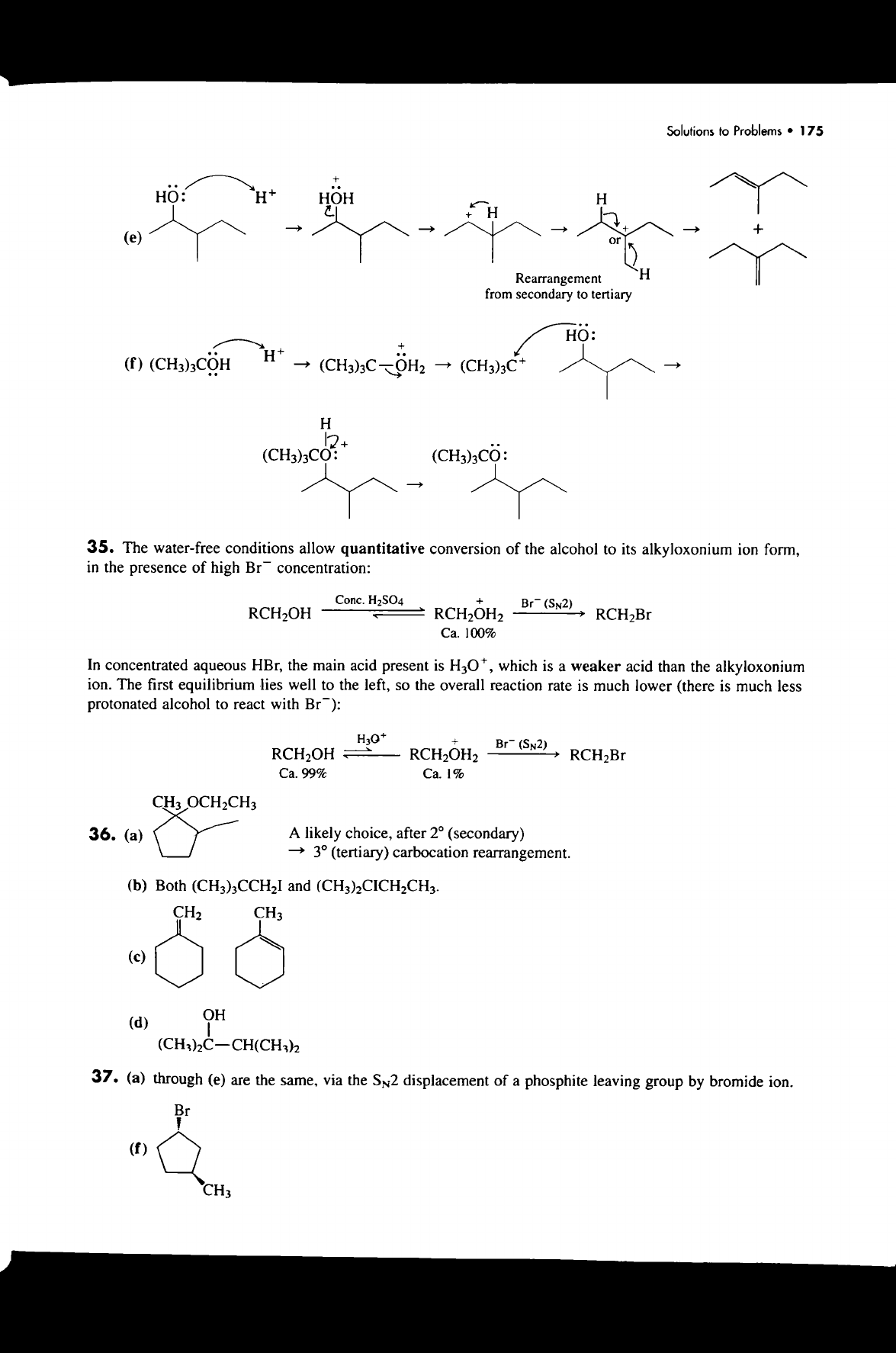 Solutions to Problems 175 :+ + HO: H⁺ HOH H C + H + + (e) or Rearrangement H from secondary to tertiary HO: +: + + (f) (CH₃)₃COH (CH₃)₃C H 12+ (CH₃)₃CO: (CH₃)₃CO: 35. The water-free conditions allow quantitative conversion of the alcohol to its alkyloxonium ion form, in the presence of high Br⁻ concentration: RCH₂OH Conc. RCH₂OH₂ + Br⁻ (SN2) RCH₂Br Ca. 100% In concentrated aqueous HBr, the main acid present is which is a weaker acid than the alkyloxonium ion. The first equilibrium lies well to the left, so the overall reaction rate is much lower (there is much less protonated alcohol to react with Br⁻): RCH₂OH RCH₂OH₂ + Br⁻ (SN2) RCH₂Br Ca. 99% Ca. 1% CH₃ 36. (a) A likely choice, after 2° (secondary) 3° (tertiary) carbocation rearrangement. (b) Both (CH₃)₃CCH₂I and (CH₃)₂CICH₂CH₃. CH₂ CH₃ (c) OH (d) 37. (a) through (e) are the same, via the SN2 displacement of a phosphite leaving group by bromide ion. Br (f) CH₃