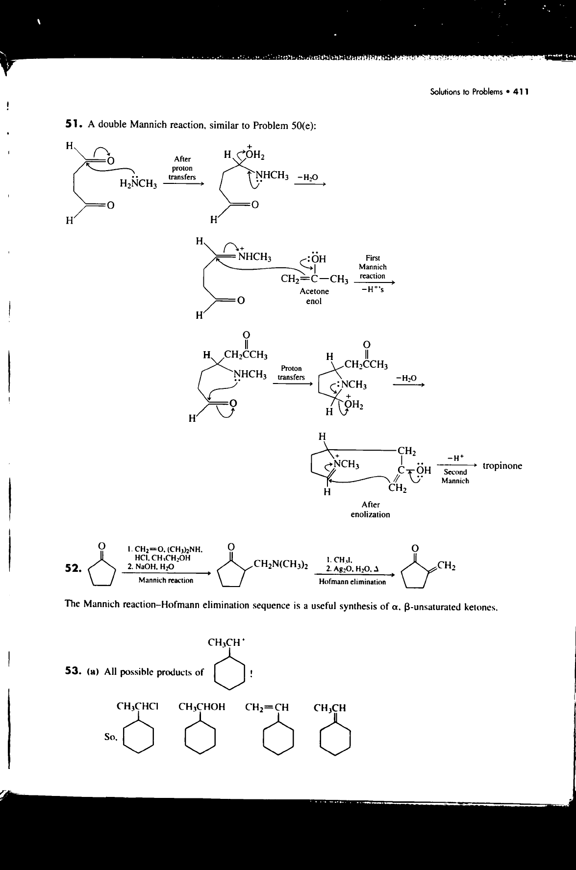 Solutions to Problems . 411 51. A double Mannich reaction, similar to Problem 50(e): H + After H OH₂ proton transfers NHCH₃ H₂NCH₃ H H H + NHCH₃ OH First Mannich reaction Acetone -H⁺'s enol H O O H CH₂CCH₃ H Proton CH₂CCH₃ transfers -H₂O :NCH3 + OH₂ H H H CH₂ + -H+ NCH₃ C OH tropinone Second Mannich H CH₂ After enolization O 1. 1. 52. 2. NaOH. CH₂N(CH₃)₂ 2. 1 CH₂ Mannich reaction Hofmann elimination The Mannich reaction-Hofmann elimination sequence is a useful synthesis of α. ketones. 53. (a) All possible products of ! CH₃CHOH CH₂=CH So,