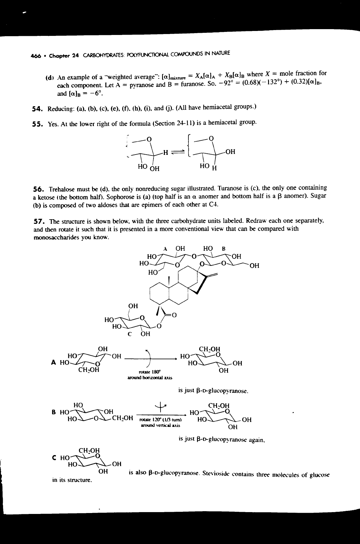 466 Chapter 24 CARBOHYDRATES: POLYFUNCTIONAL COMPOUNDS IN NATURE (d) An example of a "weighted average": = + where X = mole fraction for each component. Let A = pyranose and B = furanose. -92° = (0.68)( 132°) + and = -6°. 54. Reducing: (a), (b), (c), (e), (f), (h), (i), and (j). (All have hemiacetal groups.) 55. Yes. At the lower right of the formula (Section 24-11) is a hemiacetal group. H OH HO OH HO H 56. Trehalose must be (d). the only nonreducing sugar illustrated. Turanose is (c), the only one containing a ketose (the bottom half). Sophorose is (a) (top half is an anomer and bottom half is a ß anomer). Sugar (b) is composed of two aldoses that are epimers of each other at C4. 57. The structure is shown below, with the three carbohydrate units labeled. Redraw each one separately, and then rotate it such that it is presented in a more conventional view that can be compared with monosaccharides you know. A OH HO B HO OH HO 0 OH HO OH HO 0 0 C OH OH HO OH A 0 HO OH CH₂OH rotate 180° OH around horizontal axis is just B-D-glucopyranose. B HO OH HO CH₂OH rotate 120° (1/3 turn) HO OH around vertical axis OH is just again. HO OH OH is also B-D-glucopyranose. Stevioside contains three molecules of glucose in its structure.