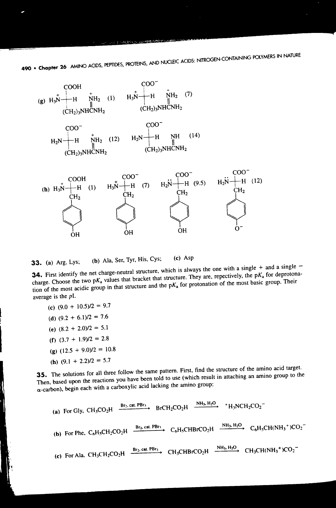 490 Chapter 26 AMINO ACIDS, PEPTIDES, PROTEINS, AND NUCLEIC ACIDS: POLYMERS IN NATURE COOH + + + + (g) H NH₂ (1) H NH₂ (7) (CH₂)₃NHCNH₂ (CH₂)₃NHCNH₂ + H NH₂ (12) H₂N H NH (14) (CH₂)₃NHCNH₂ (CH₂)₃NHCNH₂ COOH coo- + + (h) H (1) H (7) H (9.5) H (12) CH₂ CH₂ CH₂ CH₂ OH OH OH 33. (a) Arg, Lys; (b) Ala, Ser, Tyr, His, Cys; (c) Asp 34. First identify the net charge-neutral structure, which is always the one with a single + and a single - charge. Choose the two values that bracket that structure. They are, repectively, the for deprotona- tion of the most acidic group in that structure and the pKₐ for protonation of the most basic group. Their average is the pl. (c) (9.0 + 10.5)/2 = 9.7 (d) (9.2 + 6.1)/2 = 7.6 (e) (8.2 + 2.0)/2 = 5.1 (f) (3.7 + 1.9)/2 = 2.8 (g) (12.5 + 9.0)/2 = 10.8 (h) (9.1 + 2.2)/2 = 5.7 35. The solutions for all three follow the same pattern. First, find the structure of the amino acid target. based upon the reactions you have been told to use (which result in attaching an amino group to the α-carbon), begin each with a carboxylic acid lacking the amino group: cat. (a) For Gly, CH₃CO₂H BrCH₂CO₂H + (b) For cat. (c) For Ala. CH₃CH₂CO₂H cat. PBr₃ CH₃CHBrCO₂H