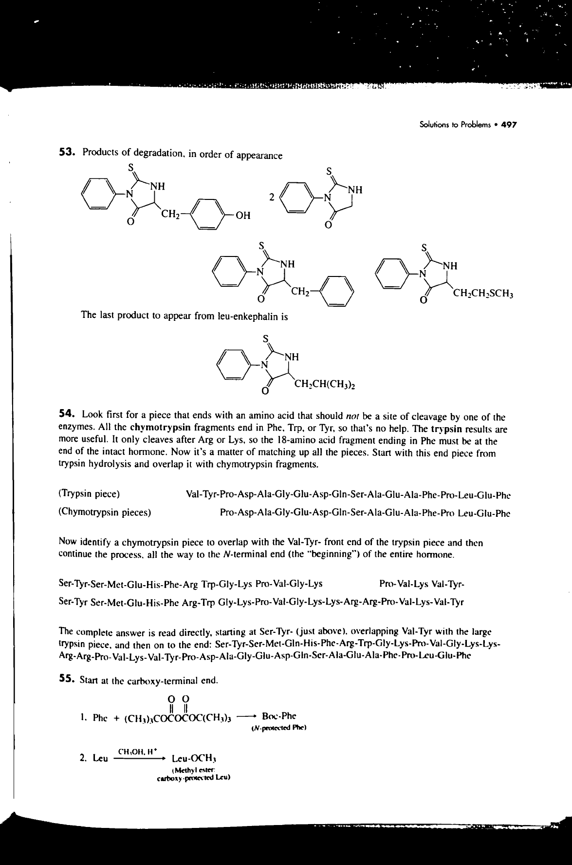 Solutions to Problems 497 53. Products of degradation. in order of appearance S S NH NH N 2 N CH₂ OH 0 S S NH NH N N CH₂ CH₂CH₂SCH₃ 0 The last product to appear from leu-enkephalin is S NH N CH₂CH(CH₃)₂ 54. Look first for a piece that ends with an amino acid that should not be a site of cleavage by one of the enzymes. All the chymotrypsin fragments end in Trp, or Tyr, so that's no help. The trypsin results are more useful. It only cleaves after Arg or Lys, so the 18-amino acid fragment ending in Phe must be at the end of the intact hormone. Now it's a matter of matching up all the pieces. Start with this end piece from trypsin hydrolysis and overlap it with chymotrypsin fragments. (Trypsin piece) (Chymotrypsin pieces) Pro-Asp-Ala-Gly-Glu-Asp-GIn-Ser-Ala-Glu-Ala-Phe-Pro Leu-Glu-Phe Now identify a chymotrypsin piece to overlap with the Val-Tyr- front end of the trypsin piece and then continue the all the way to the N-terminal end (the "beginning") of the entire hormone. Ser-Tyr-Ser-Met-Glu-His-Phe-Arg Trp-Gly-Lys Pro-Val-Gly-Lys Pro-Val-Lys Val-Tyr- Ser-Tyr Ser-Met-Glu-His-Phe Arg-Trp The complete answer is read directly, starting at Ser-Tyr- (just above). overlapping Val-Tyr with the large trypsin and then on to the end: 55. Start at the carboxy-terminal end. 0 Phe + Boc-Phe (N-protected H* 2. Leu Leu-OCH3 (Methyl ester: carboxy-protected Leu)