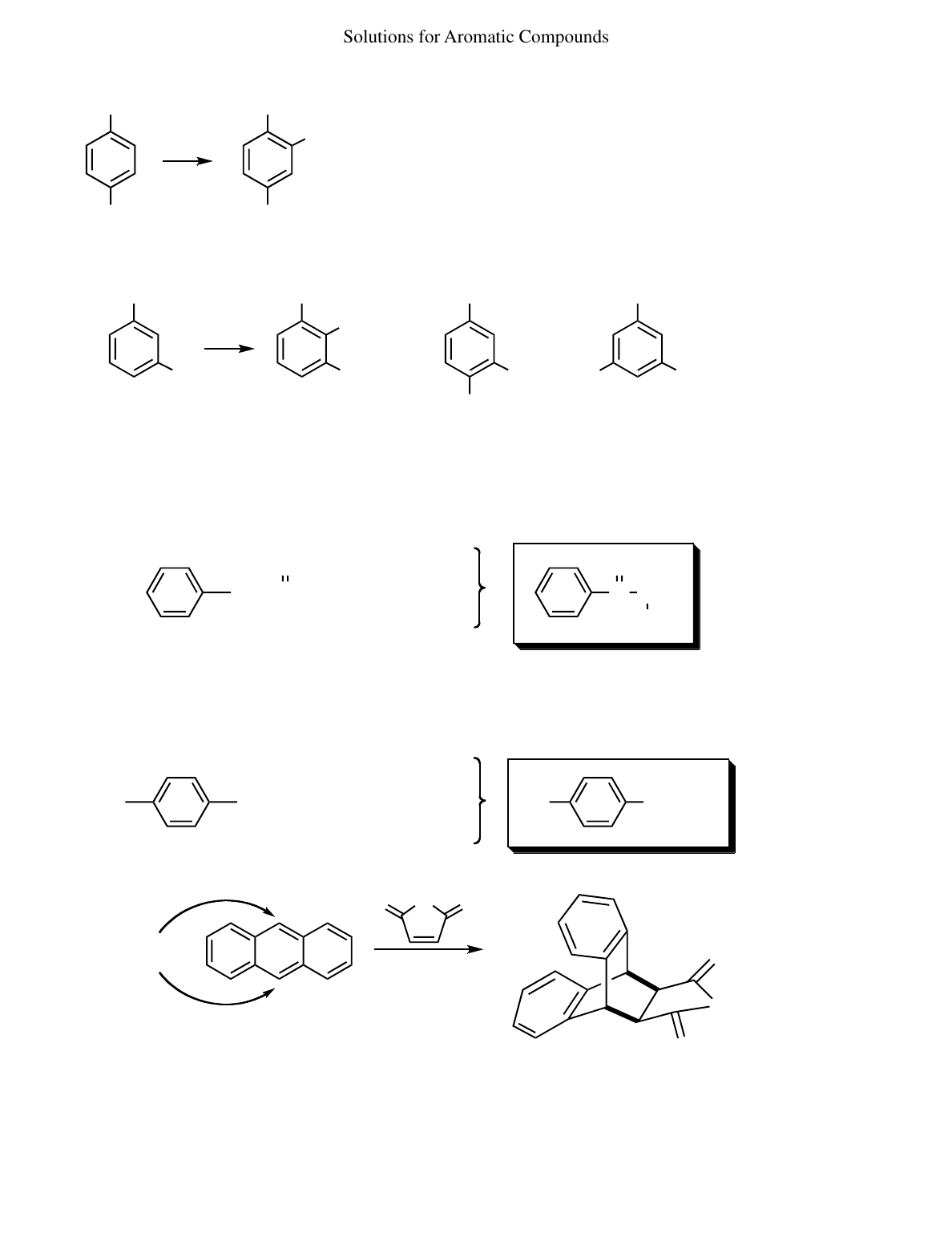 Solutions for Aromatic Compounds Br Br CH3 CH3 CH3 CH3 NO2 NO2 Br Br NO2 Br Br O2N Br Br + + (c) The original compound had to have been meta-dibromobenzene as this is the only dibromo isomer that gives three mononitrated products. only 1 isomer (b) 37 continued C O OO O C O CH2 Cl O O O CH2CH3Br + CH2 + Cl (a) The formula C8H7OCl has five elements of unsaturation, probably a benzene ring (4) plus either a double bond or a ring. The IR suggests a conjugated carbonyl at 1690 cm–1 and an aromatic ring at 1602 cm–1. The NMR shows a total of five aromatic protons, indicating a monosubstituted benzene. A 2H singlet at δ 4.7 is a deshielded methylene. 38 + (b) The mass spectral evidence of molecular ion peaks of 1 : 1 intensity at 184 and 186 shows the presence of a bromine atom. The m/z 184 minus 79 for bromine gives a mass of 105 for the rest of the molecule, which is about a benzene ring plus two carbons and a few hydrogens. The NMR shows four aromatic hydrogens in a typical para pattern (two doublets), indicating a para-disubstituted benzene. The 2H quartet and 3H triplet are characteristic of an ethyl group. + Br + CH2CH3 39 like the ends of a conjugated diene (a) (b) Diels-Alder product new sigma bonds shown in bold 377
