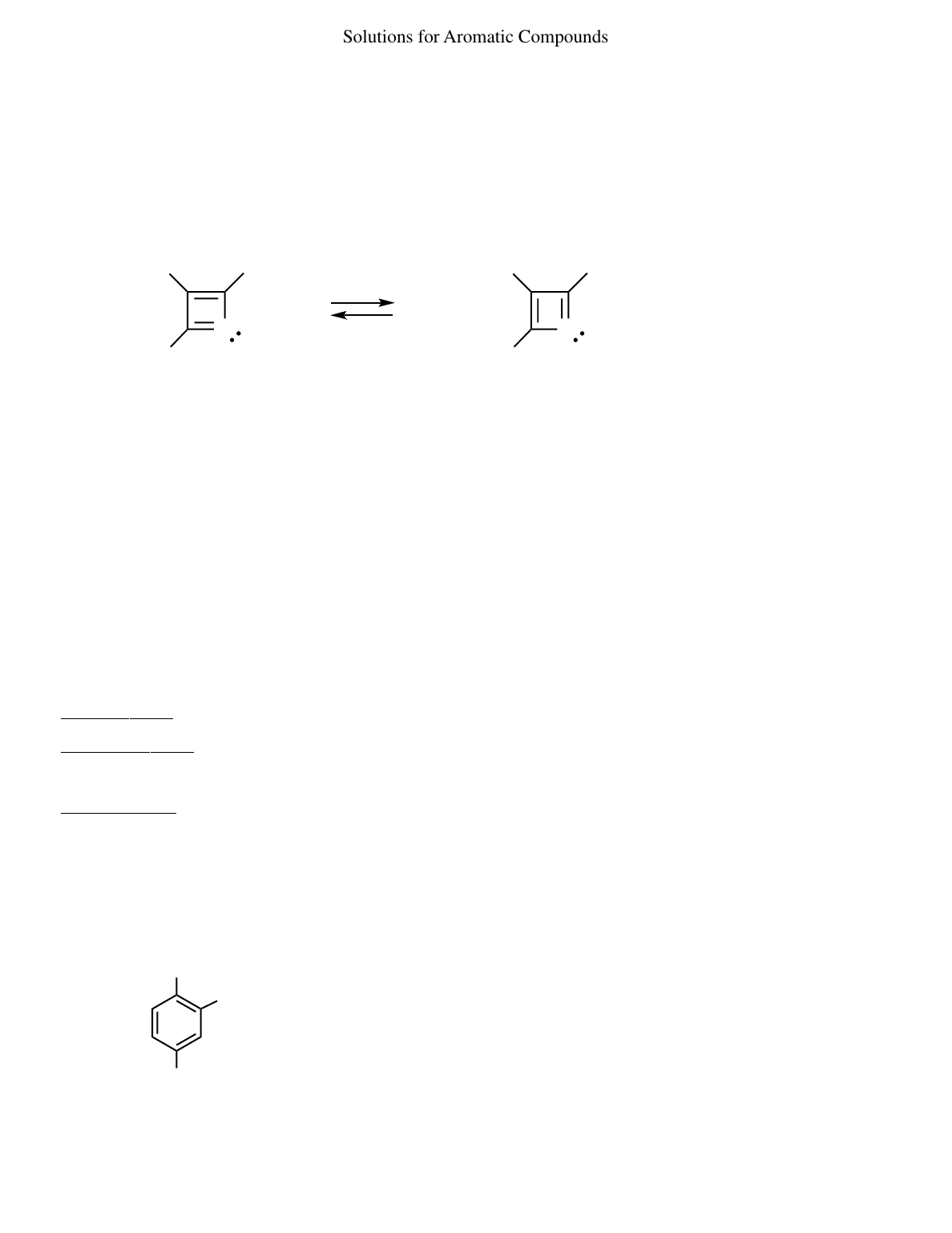 Solutions for Aromatic Compounds N C(CH3)3(CH3)3C (CH3)3C (CH3)3C (CH3)3C C(CH3)3 N Analysis of structure 1 shows the three tert-butyl groups in unique environments in relation to the nitrogen. We would expect three different signals in the NMR, as is observed at –110° C. Why do signals coalesce as the temperature is increased? Two of the tert-butyl groups become equivalent—which two? Most likely, they are a and c that become equivalent as they are symmetric around the nitrogen. But they are not equivalent in structure 1—what is happening here? What must happen is an equilibration between structures 1 and 2, very slow at –110° C, but very fast at room temperature, faster than the NMR can differentiate. So the signal that has coalesced is an average of a and a' and c and c'. (This type of low-temperature NMR experiment is also used to differentiate axial and equatorial hydrogens on a cyclohexane.) The NMR data prove that 1 is not aromatic, and that 1 and 2 are isomers, not resonance forms. If 1 were aromatic, then a and c would have identical NMR signals at all temperatures. c' b' a' c b a 21 (d) (c) Yes, the nitrogen should be basic. The pair of electrons on the nitrogen is in an sp2 orbital parallel to the ring and is perpendicular to the π system. It cannot be part of the π system as that would require two p orbitals occupying the same space. (b) This molecule is electronically equivalent to cyclobutadiene. Cyclobutadiene is unstable and undergoes a Diels-Alder reaction with another molecule of itself. The tert-butyl groups prevent dimerization by blocking approach of any other molecule. (a) Antiaromatic—only 4 π electrons.44 X Z Y 45 Mass spectrum: Molecular ion at 150; base peak at 135, M − 15, is loss of methyl. Infrared spectrum: The broad peak at 3500 cm–1 is OH; thymol must be an alcohol. The peak at 1620 cm–1 suggests an aromatic compound. NMR spectrum: The singlet at δ 4.8 is OH; it disappears upon shaking with D2O. The 6H doublet at δ 1.2 and the 1H multiplet at δ 3.2 are an isopropyl group, apparently on the benzene ring. A 3H singlet at δ 2.3 is a methyl group, also on the benzene ring. Analysis of the aromatic protons suggests the substitution pattern. The three aromatic hydrogens confirm that there are three substituents. The singlet at δ 6.6 is a proton between two substituents (no neighboring Hs). The doublets at δ 6.75 and δ 7.1 are ortho hydrogens, splitting each other. + CH3 + OH + CH(CH3)2 continued on next page 380