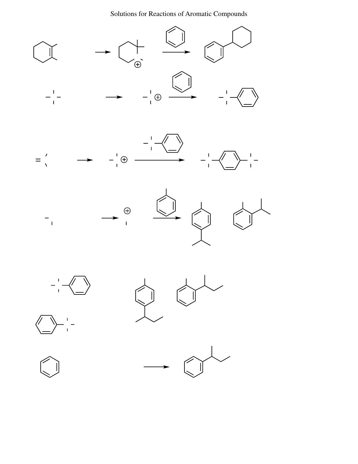 Solutions for Reactions of Aromatic Compounds H H C CH3 CH3 CH3 OH C H H H C CH3 CH3 CH3 C CH3 CH3 CH3 + BF3 (b) + HF (a) 16 CH2 C CH3 CH3 C CH3 CH3 CH3 C CH3 CH3 CH3 HO CHCH3 CH3 CHCH3 CH3 CH3 CH3 C CH3 CH3 CH3 C CH3 CH3 CH3 CH3 ++ BF3(d) + HF (c) C CH3 CH3 CH3 CH3 C CH(CH3)2 CH3 CH3 AlCl3 CH3 + (d) (c) No reaction: nitrobenzene is too deactivated for the Friedel- Crafts reaction to succeed. (b)(a) 17 In (a), (b), and (d), the electrophile has rearranged. plus poly-alkylation products 18 (a) + CH3CH2CH2CH2Br (b) Gives desired product: activated ring plus 3° carbon in the electrophile gives para as the major product. (c) Gives desired product plus ortho isomer; use excess bromobenzene to avoid overalkylation. (d) No reaction; benzamide is too deactivated for a Friedel-Crafts reaction. (e) Gives desired product: methyl is slightly activating; putting three deactivating nitro groups requires forcing conditions, and great care to avoid detonation! BOOM! rearranged rearranged rearranged rearranged—not the desired product 392