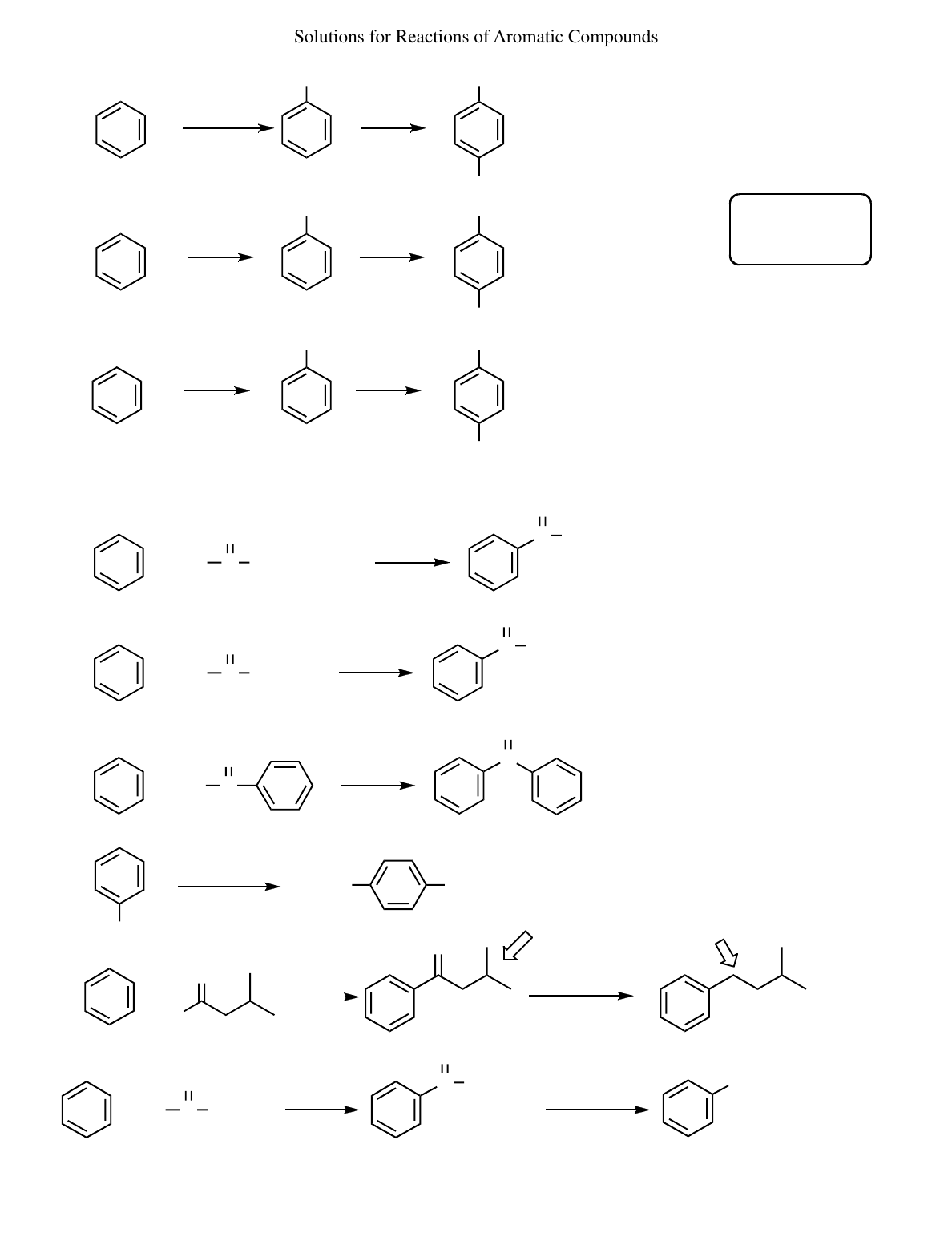 Solutions for Reactions of Aromatic Compounds CH3I AlCl3 AlCl3 (CH3)3CCl CH3 C(CH3)3 SO3 H2SO4 HNO3 H2SO4 CH3 SO3H C(CH3)3 NO2 (Separate from ortho.) 19 (a) (excess) (excess) (b) (Separate from ortho, although steric hindrance would prevent much ortho substitution.) CH3I AlCl3 CH3 Cl2 AlCl3 Cl CH3 (Separate from ortho.) (c) (excess) C C(CH3)3 O Cl Cl C O CH2CH(CH3)2 C C(CH3)3 O C O CH2CH(CH3)2 (b) + 1) AlCl3 2) H2O workup 2) H2O workup 1) AlCl3+ (a) 20 Friedel-Crafts alkylation is typically followed by a water workup to remove AlCl or other catalyst.3 Zn(Hg), HCl OCH3 Cl C O C(CH3)3 Cl C O H3CO CHO C O C(CH3)3 C O CH2C(CH3)3 AlCl3/CuCl CO, HCl(d) 2) H2O workup 1) AlCl3 + (c) 2) H2O workup 1) AlCl3 + (f) (e) 2) H2O workup 1) AlCl3 + Cl O O Zn(Hg), HCl Making a new bond from benzene to a 1° carbon requires Friedel-Crafts acylation followed by reduction. Clemmensen Clemmensen The sequence of reactions is important. 393