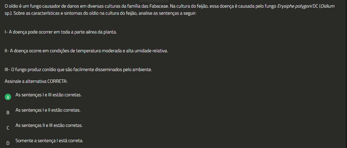 0 oídio é um fungo causador de danos em diversas culturas da família das Fabaceae. Na cultura do feijão, essa doença é causada pelo fungo Erysiphe polygoniDC (Oidium sp.). Sobre as características e sintomas do oídio na cultura do feijão, analise as sentenças a seguir: I- A doença pode ocorrer em toda a parte aérea da planta. II- A doença ocorre em condições de temperatura moderada e alta umidade relativa. III- 0 fungo produz conídio que são facilmente disseminados pelo ambiente. Assinale a alternativa CORRETA: A As sentenças le III estão corretas. As sentenças e II estão corretas. As sentenças e III estão corretas. D Somente a sentença está correta.