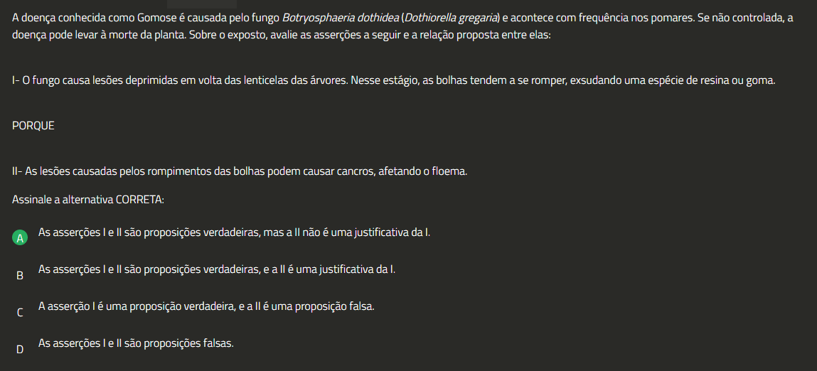 A doença conhecida como Gomose é causada pelo fungo Botryosphaeria dothidea (Dothiorella gregaria) e acontece com frequência nos pomares. Se não controlada, a doença pode levar à morte da planta. Sobre 0 exposto, avalie as asserções a seguir e a relação proposta entre elas: I- 0 fungo causa lesões deprimidas em volta das lenticelas das árvores. Nesse estágio, as bolhas tendem a se romper, exsudando uma espécie de resina ou goma. PORQUE II- As lesões causadas pelos rompimentos das bolhas podem causar cancros, afetando 0 floema. Assinale a alternativa CORRETA: A As asserções le II são proposições verdadeiras, mas a II não é uma justificativa da I. As asserções I e II são proposições verdadeiras, e a II é uma justificativa da I. A asserção I é uma proposição verdadeira, e a II é uma proposição falsa. D As asserções I e são proposições falsas.
