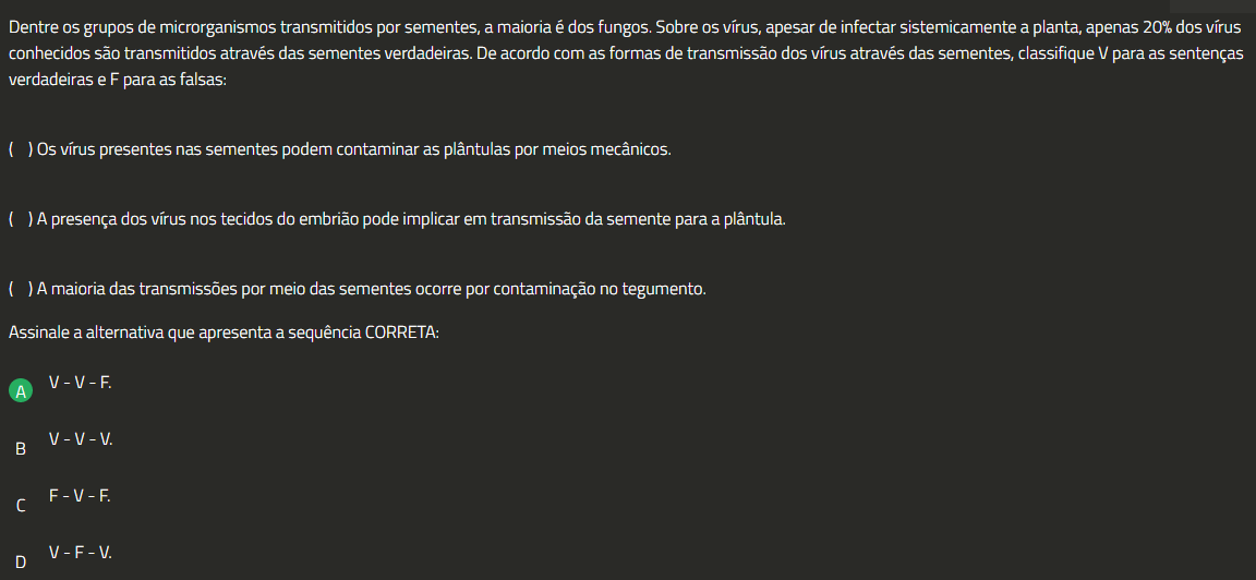 Dentre grupos de microrganismos transmitidos por sementes, a maioria é dos fungos. Sobre vírus, apesar de infectar sistemicamente a planta, apenas 20% dos vírus conhecidos são transmitidos através das sementes verdadeiras. De acordo com as formas de transmissão dos vírus através das sementes, classifique V para as sentenças verdadeiras e F para as falsas: Os vírus presentes nas sementes podem contaminar as plântulas por meios mecânicos. presença dos vírus nos tecidos do embrião pode implicar em transmissão da semente para a plântula. maioria das transmissões por meio das sementes ocorre por contaminação no tegumento. Assinale a alternativa que apresenta a sequência CORRETA: V-V-F. A V-F-V. D