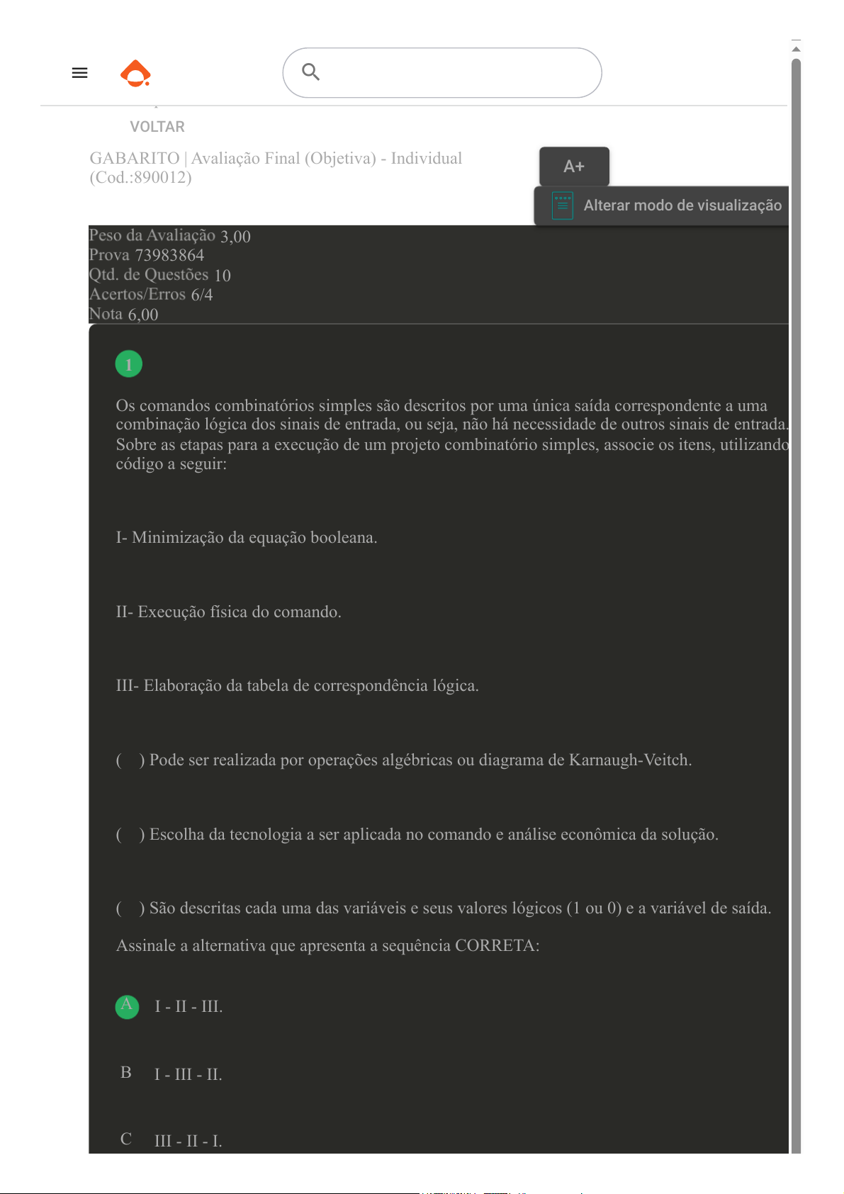 16/11/2023, 14:29 Avaliação Final (Objetiva) - Individual Prova Impressa GABARITO | Avaliação Final (Objetiva) - Individual (Cod.:890012) 3,00 73983864 10 6/4 6,00 Os comandos combinatórios simples são descritos por uma única saída correspondente a uma combinação lógica dos sinais de entrada, ou seja, não há necessidade de outros sinais de entrada. Sobre as etapas para a execução de um projeto combinatório simples, associe os itens, utilizando código a seguir: I- Minimização da equação booleana. II- Execução física do comando. III- Elaboração da tabela de correspondência lógica. ( ) Pode ser realizada por operações algébricas ou diagrama de Karnaugh-Veitch. ( ) Escolha da tecnologia a ser aplicada no comando e análise econômica da solução. ( ) São descritas cada uma das variáveis e seus valores lógicos (1 ou 0) e a variável de saída. Assinale a alternativa que apresenta a sequência CORRETA: A I - II - III. B I - III - II. C III - II - I. VOLTAR A+ Alterar modo de visualização 1 O que você está buscando? 17/11/2025, 09:42 Avaliação Final (Objetiva) - Individual - Práticas de Acionamentos | Passei Direto https://www.passeidireto.com/arquivo/130399192/avaliacao-final-objetiva-individual-praticas-de-acionamentos?mgm=HRWxk93ufO3EqykfIL3%2… 2/12 https://www.passeidireto.com/ about:blank C As sentenças I, II e III estão corretas. D Somente a sentença II está correta. O que você está buscando? 17/11/2025, 09:42 Avaliação Final (Objetiva) - Individual - Práticas de Acionamentos | Passei Direto https://www.passeidireto.com/arquivo/130399192/avaliacao-final-objetiva-individual-praticas-de-acionamentos?mgm=HRWxk93ufO3EqykfIL3%2… 4/12 https://www.passeidireto.com/