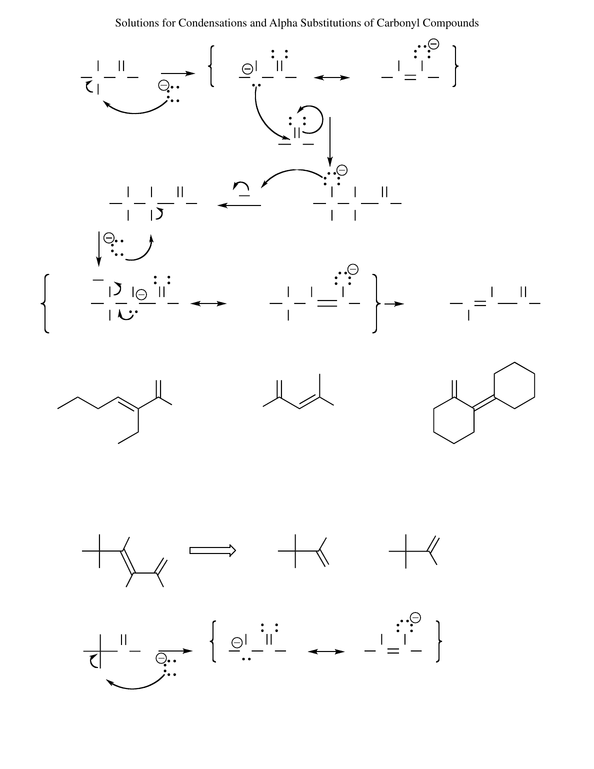 Solutions for Condensations and Alpha Substitutions of Carbonyl Compounds OH OH H3C C H C O HC H O C H H3CH3C C H H C O H C H O CH3CH2 HO H CH3CH2 C O C H H CH3 C H O C O HC CH3 H C H HO CH3CH2 C O HC CH3 C H HO CH3CH2CH3CH2 C O C H CH3 C H OH C O HC CH3 C H CH3CH2 Ph Ph O O H O (c)(b)(a) 23 24 The carbon-carbon double bond is the new bond in each case. E + ZE + Z OH H H C H O H H3C CH3 CH3 H H H O C H O C H H CH3 CH3 H3C H O H C H C O H H H H O H Step 2: nucleophile generation + Step 1: carbon skeletons (a) 25 (2,2-Dimethylpropanal has no α-hydrogen.) continued on next page 557