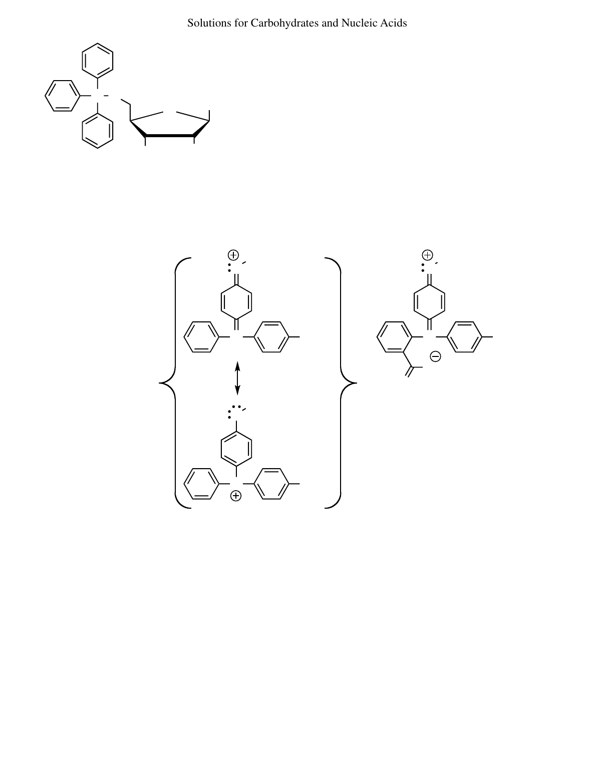 Solutions for Carbohydrates and Nucleic Acids 74 base OH OH O OC (a) phenolphthalein (b) Trityl groups are specific for 1° alcohols for steric reasons: the trityl group is so big that even a 2° alcohol is too crowded to react at the central carbon. It is possible for a trityl to go on a 2° alcohol, but the reaction is exceedingly slow and in the presence of a 1° alcohol, the reaction is done at the 1° alcohol long before the 2° alcohol gets started. (c) Reactions happen faster when the product or intermediate is stabilized. Each OCH3 group stabilizes the carbocation by resonance as shown here; two OCH3 groups stabilize more than just one, increasing the rate of removal. The color comes from the extended conjugation through all three rings and out onto the OCH3 groups. Compare the DMT structure with that of phenolphthalein, the most common acid base indicator, that turns pink in its ring open form shown here. Phenolphthalein is simply another trityl group with different substituents. C O CH3 OCH3 One of the major resonance contributors shows the delocalization of the positive charge on the oxygen. C O H OH O O C O CH3 OCH3 One of the resonance contributors shows the delocalization of the positive charge onto the central carbon. plus many more resonance forms 628