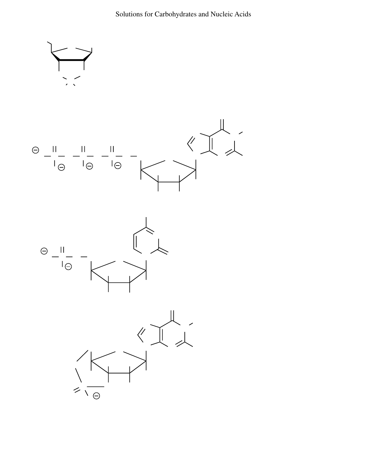 Solutions for Carbohydrates and Nucleic Acids 68 continued (e) base O O O HO C H3C CH3 Only the 2'- and 3'-OH groups are close enough to form this cyclic acetal (ketal) from acetone, called an acetonide. N H HH OHO H CH2 O N H O NH2 N N O P O O N NN N NH2 O H OCH2 H OH OH H H O H P O O O P O O O P O O O N N NH2 OP O O O O H CH2 HH HOH H O (c) (b) (a) 69 624