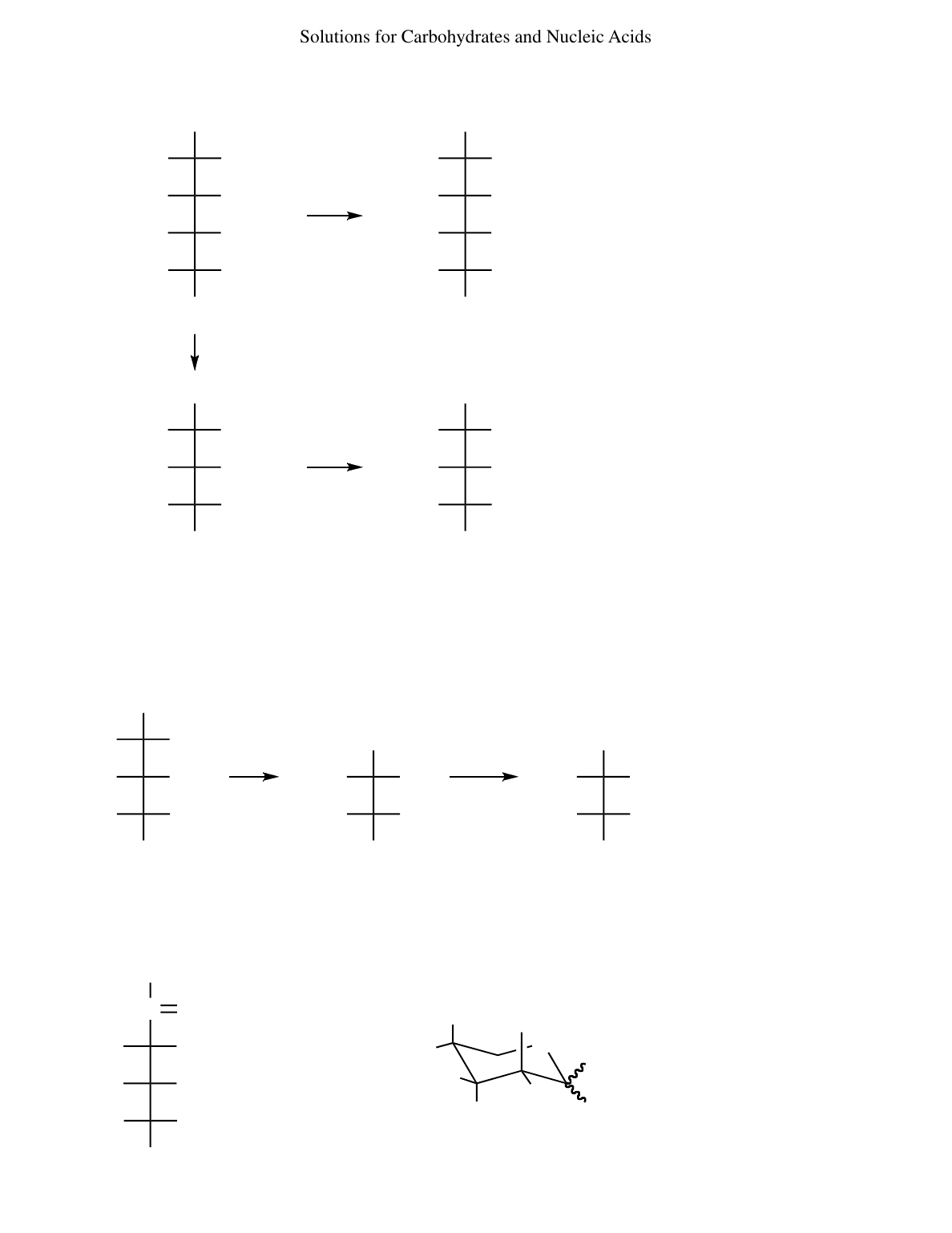 Solutions for Carbohydrates and Nucleic Acids 65 continued X: CH2OH H OH HO H CHO HO H CH2OH H OH HO H CHO H OH HO H HHO CHO HHO OHH CH2OH HNO3 HNO3 HHO CHO OHH CH2OH HHO OHH COOH HHO OHH COOH COOH H OH HO H COOH HO H HNO3 COOH H OH COOH HO H The other aldohexose that gives an optically inactive aldaric acid is D-allose, with all OH groups on the right side of the Fischer projection. Ruff degradation followed by nitric acid gives an optically inactive aldaric acid, however, so X cannot be D-allose. (c) X is D-galactose. Ruff optically inactive optically active (d) The optically active, five-carbon aldaric acid comes from the optically active pentose, not from the optically inactive, six-carbon aldaric acid. The principle is not violated. (e) Ruff D-threose (S,S)-tartaric acid optically active CH2OH H OH HO H C CH2OH O HO H CH2OH H HO OH HO O OH H H 66 Tagatose is a monosaccharide, a ketohexose, that is found in the pyranose form. (a) (b) 1 2 34 5 6 622