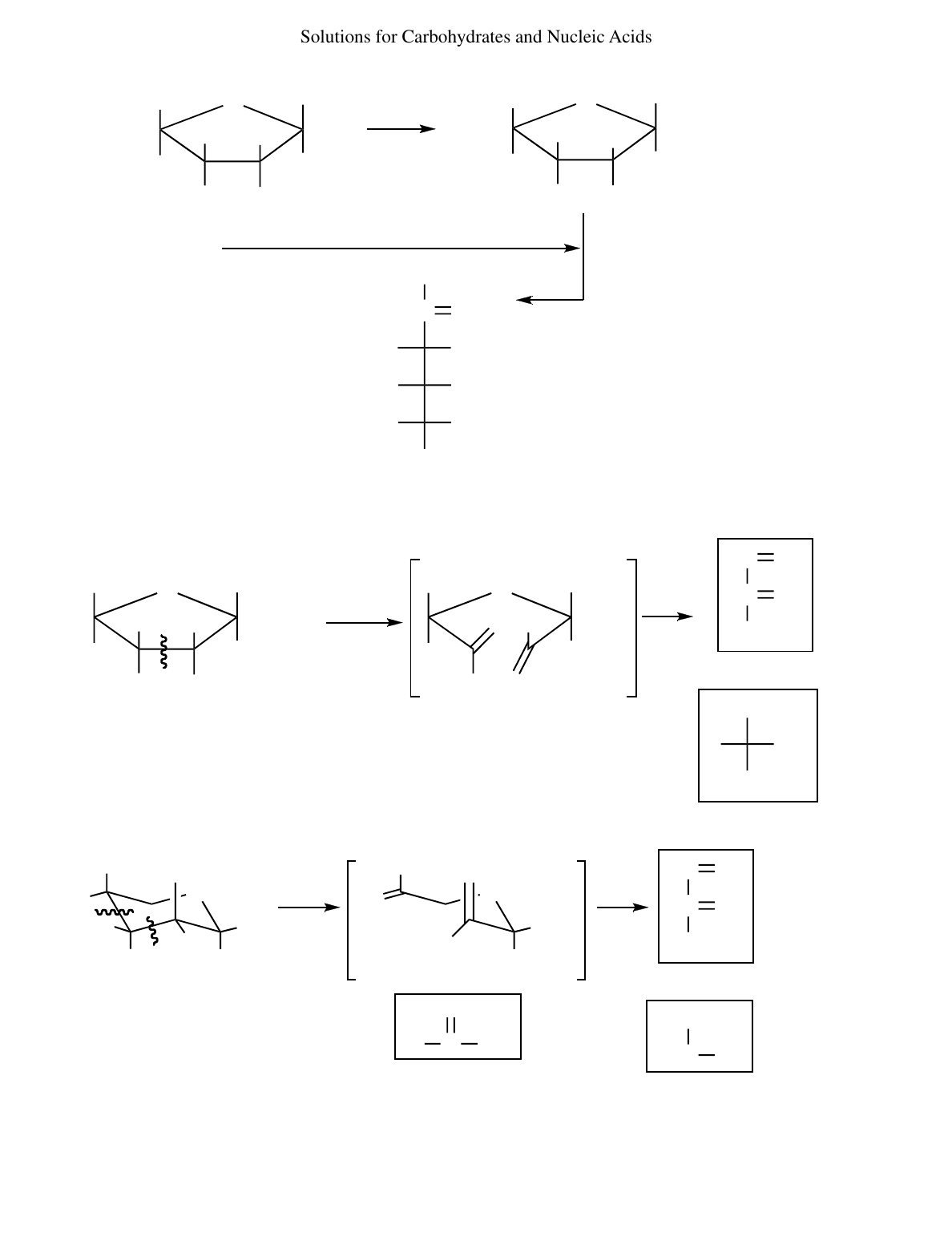 Solutions for Carbohydrates and Nucleic Acids CH2OCH3 OCH3 CH3OH HOCH3 H CH3OH2C O H3O+ Ag2OOHOH2C H OH H H HO OH CH2OH OCH3H OHH CH2OCH3 HCH3O C O CH2OCH3 D-fructose CH3OH + (c) Determining that the open chain form of fructose is a ketone at C-2 with a free OH at C-5 shows that fructose exists as a furanose hemiacetal. (b) acidic hydrolysis (a) 40 1 1 2 3 6 4 5 2 3 4 5 6 CH2OH C O HC O H3O+ CH2OH H OH CHO O CH2OH OCH3 H OH H CH2OH O CH2OH C O HC O HIO4 H3O+ H2C OH CHO OCH3 O O OH CH2OH H OCH2OH H OH H H HO OCH3 CH2OH C OH O H 2 HIO4 H H OCH3 HO O OH OH H CH2OH formic acid 41 (a) methyl β-D-fructopyranoside + + methyl β-D-fructofuranoside D-glyceraldehyde (b) + Production of one equivalent of formic acid, and two fragments containing two and three carbons respectively, proves that the glycoside was in a six-membered ring. 1 2 34 5 6 1 2 34 5 6 1 2 3 4 5 6 1 234 5 6 1 23 4 5 6 1 2 3 5 6 excess CH3I 613