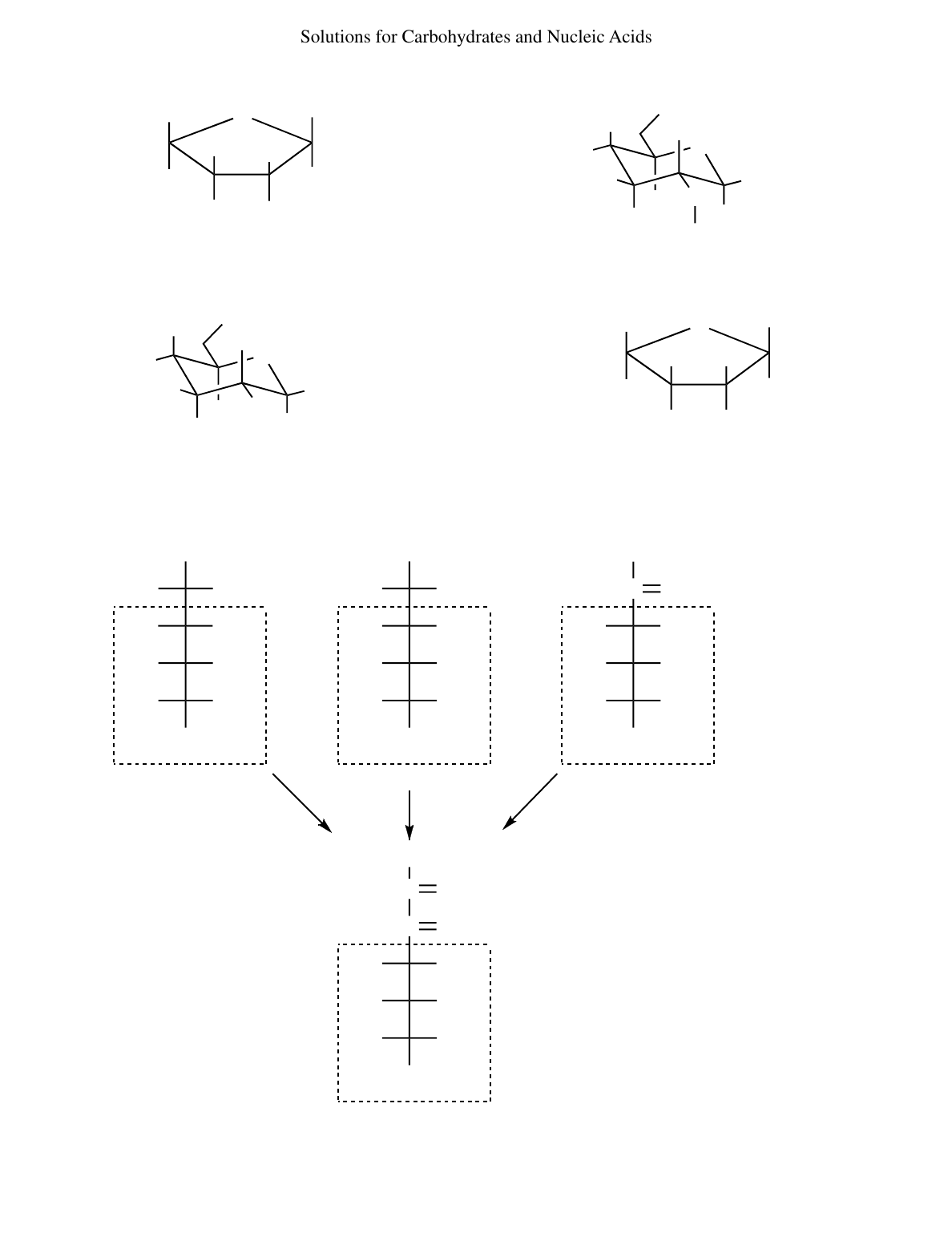 Solutions for Carbohydrates and Nucleic Acids OCH3OH2C H OCH3 H H CH3O CH2OCH3 OCH3 AcO AcO OAc H AcO O H H H H OAc OHH OHH CHO HHO OHH CH2OH CH2OH H OH HO H CHO HO H H OH PhNHNH2 H+ OHH C O CH2OH HHO OHH CH2OH NNHPhC CH2OH H OH HO H C NNHPh H OH H O CH3O OCH3 OCH3 H O H H H CH3O H CH3 H OAc HH OAcAcO H AcOH2C O(b)(a) 31 Excess acetic anyhydride is needed to acetylate all OH groups. (b)(a) 30 Excess CH I is needed to form methyl ethers at all OH groups.3 D-fructoseD-mannoseD-glucose (a) The part of each structure in the box is common to all three monosaccharides. 32 607