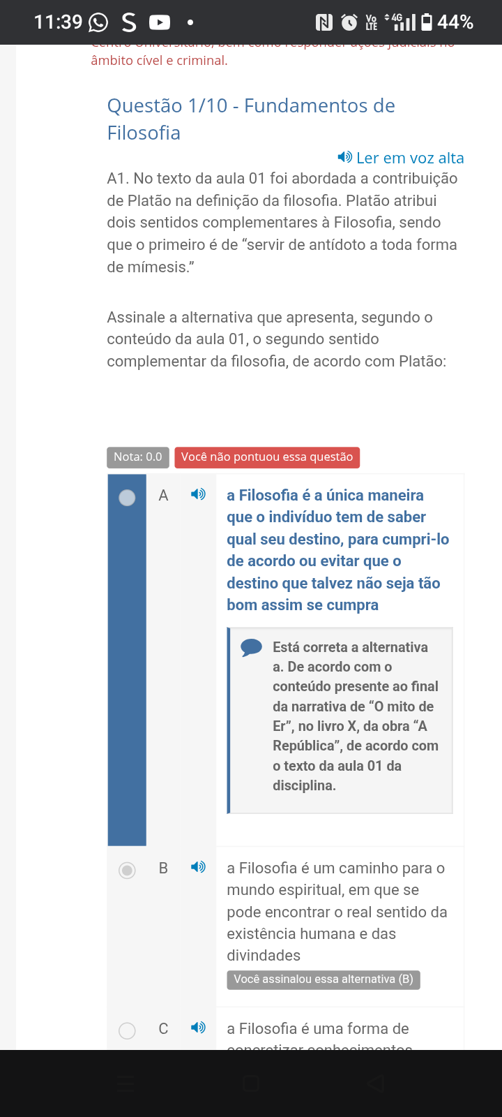 11:39 S N 44% âmbito cível e criminal. Questão 1/10 Fundamentos de Filosofia Ler em voz alta A1. No texto da aula 01 foi abordada a contribuição de Platão na definição da filosofia. Platão atribui dois sentidos complementares à Filosofia, sendo que primeiro é de "servir de antídoto a toda forma de mímesis." Assinale a alternativa que apresenta, segundo conteúdo da aula 01, segundo sentido complementar da filosofia, de acordo com Platão: Nota: 0.0 Você não pontuou essa questão A a Filosofia é a única maneira que indivíduo tem de saber qual seu destino, para cumpri-lo de acordo ou evitar que destino que talvez não seja tão bom assim se cumpra Está correta a alternativa a. De acordo com conteúdo presente ao final da narrativa de mito de Er", no livro X, da obra "A de acordo com texto da aula 01 da disciplina. a Filosofia é um caminho para mundo espiritual, em que se pode encontrar real sentido da existência humana e das divindades Você assinalou essa alternativa (B) c a Filosofia é uma forma de