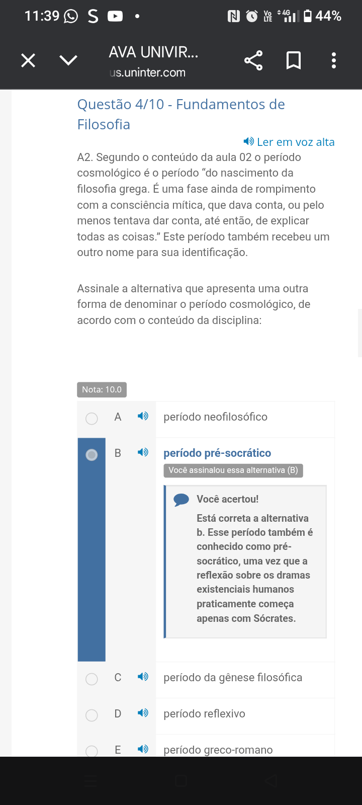 11:39 S N Vo LTE 44% AVA UNIVIR... X us.uninter.com Questão 4/10 Fundamentos de Filosofia Ler em alta A2. Segundo conteúdo da aula 02 período cosmológico é período "do nascimento da filosofia grega. É uma fase ainda de rompimento com a consciência mítica, que dava conta, ou pelo menos tentava dar conta, até então, de explicar todas as coisas." Este período também recebeu um outro nome para sua identificação. Assinale a alternativa que apresenta uma outra forma de denominar período cosmológico, de acordo com conteúdo da disciplina: Nota: 10.0 A período neofilosófico período pré-socrático Você assinalou essa alternativa (B) Você acertou! Está correta a alternativa b. Esse período também é conhecido como pré- socrático, uma vez que a reflexão sobre os dramas existenciais humanos praticamente começa apenas com Sócrates. período da gênese filosófica D período reflexivo E período greco-romano