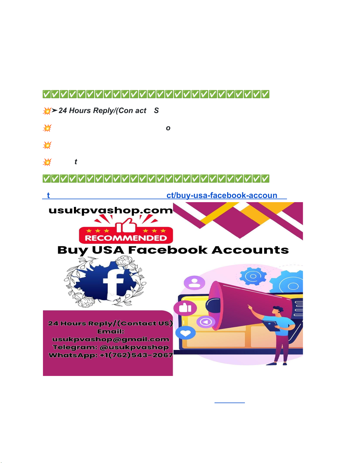 Top 13 Best Sites to Buy USA Facebook Accounts in 2025 Are you looking to boost your social media presence quickly and effectively? Buying USA Facebook accounts might be the solution you need. ✅✅✅✅✅✅✅✅✅✅✅✅✅✅✅✅✅✅✅✅✅✅✅✅✅✅ 💥➤24 Hours Reply/(Con act US) 💥➤Email: usukpvashop@gmail.com 💥➤Telegram: @usukpvashop 💥➤WhatsApp: +1(762)543-2067 ✅✅✅✅✅✅✅✅✅✅✅✅✅✅✅✅✅✅✅✅✅✅✅✅✅✅ https://usukpvashop.com/product/buy-usa-facebook-accounts/ Imagine having access to authentic profiles that help you reach your target audience faster and build trust instantly. You’ll discover why these accounts can be a https://usukpvashop.com/product/buy-usa-facebook-accounts/ https://usukpvashop.com/product/buy-usa-facebook-accounts/ game-changer for your marketing efforts and how to get them safely. Keep reading to find out how you can take your Facebook strategy to the next level. Benefits Of Usa Facebook Accounts Buying USA Facebook accounts offers several clear benefits for businesses and individuals. These accounts help reach specific groups of people. They also build trust and open new chances for marketing. Understanding these benefits helps make smart choices. Access To Targeted Audiences USA Facebook accounts connect users to local audiences. This helps advertisers focus on specific regions and interests. It saves time and increases the chance of success. Targeted ads reach the right people quickly. Enhanced Credibility Accounts from the USA appear more trustworthy to local users. This boosts brand reputation and user confidence. People tend to trust content from familiar sources. It helps build stronger customer relationships. Improved Marketing Opportunities USA accounts allow access to advanced marketing tools and features. This includes local promotions and partnerships. Marketers can test campaigns that fit the local market. It leads to better results and growth. Features Of Verified Accounts Verified Facebook accounts come with special features. These features make the accounts more reliable and safe. Buyers prefer verified accounts for trust and security. Understanding these features helps you choose the right account. Security Measures Verified accounts have strong security settings. They use two-factor authentication to protect access. This reduces the risk of hacking or unauthorized use. Facebook regularly monitors these accounts for suspicious activity. Security is a top priority for verified accounts. https://usukpvashop.com/product/buy-usa-facebook-accounts/ https://usukpvashop.com/product/buy-usa-facebook-accounts/ Verification Process The verification process confirms the account's authenticity. Facebook checks the identity of the person or business. It may require official documents like ID or business papers. Only genuine accounts receive the blue verification badge. This process ensures the account is real and trustworthy. ✅✅✅✅✅✅✅✅✅✅✅✅✅✅✅✅✅✅✅✅✅✅✅✅✅✅ 💥➤24 Hours Reply/(Con act US) 💥➤Email: usukpvashop@gmail.com 💥➤Telegram: @usukpvashop 💥➤WhatsApp: +1(762)543-2067 ✅✅✅✅✅✅✅✅✅✅✅✅✅✅✅✅✅✅✅✅✅✅✅✅✅✅ https://usukpvashop.com/product/buy-usa-facebook-accounts/ Trust Indicators Verified accounts display a blue checkmark next to the name. This mark shows Facebook has verified the account. It builds confidence among followers and friends. The badge signals legitimacy and helps avoid fake profiles. Trust indicators are crucial for social proof and credibility. How To Identify Secure Accounts Buying USA Facebook accounts requires caution. Secure accounts protect your data and avoid future problems. Knowing how to spot secure accounts saves time and risk. Check key details before buying. Profile Authenticity Checks Check the profile picture and cover photo. Real accounts have clear, natural images. Look for a complete profile with personal details. Fake accounts often lack friends or have random names. Verify if the account has a history of genuine posts. Activity History https://usukpvashop.com/product/buy-usa-facebook-accounts/ https://usukpvashop.com/product/buy-usa-facebook-accounts/ Review the timeline for regular posts and interactions. Secure accounts show consistent activity over time. Sudden bursts of activity or long inactivity can signal fake accounts. Check comments and likes for real engagement. Real users interact with friends, not just pages. Privacy Settings Check the privacy settings of the account. Secure accounts have balanced settings, not too open or too closed. Too many restrictions may hide important details. Open settings allow you to verify content easily. Adjust settings based on your needs after purchase. Where To Buy Usa Facebook Accounts Finding the right place to buy USA Facebook accounts can be tricky. Many options exist, but not all are safe or reliable. Choosing the right source protects your investment and keeps your data secure. This section covers trusted marketplaces, reputable sellers, and how to avoid scams. Trusted Marketplaces Trusted marketplaces offer verified accounts and secure payment methods. These platforms check sellers and accounts before listing. Popular sites have user reviews and ratings. This feedback helps buyers choose the best options. Always pick marketplaces with a strong reputation and clear policies. Reputable Sellers Reputable sellers provide detailed information about their accounts. They answer questions quickly and honestly. Look for sellers with high ratings and positive reviews. Repeat sellers often maintain quality to protect their reputation. Buying from such sellers reduces risks and improves satisfaction. Avoiding Scams Scams are common in this market. Avoid deals that seem too cheap or too good. Never share your personal information or passwords. Use secure payment methods that offer buyer protection. Trust 