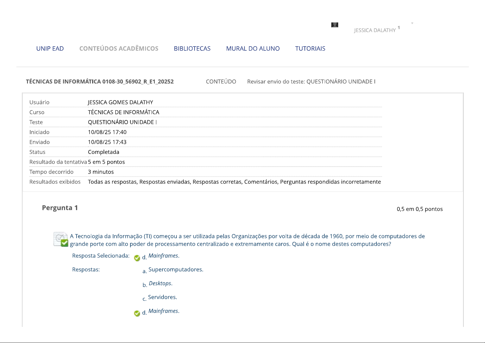 UNIP EAD CONTEÚDOS ACADÊMICOS BIBLIOTECAS MURAL DO ALUNO TUTORIAIS TÉCNICAS DE INFORMÁTICA 0108-30_56902_R_E1_20252 CONTEÚDO Revisar envio do teste: QUESTIONÁRIO UNIDADE I Usuário Curso TÉCNICAS DE INFORMÁTICA Teste QUESTIONÁRIO UNIDADE Iniciado 10/08/25 17:40 Enviado 10/08/25 17:43 Status Completada Resultado da tentativa 5 em 5 pontos Tempo decorrido 3 minutos Resultados exibidos Todas as respostas, Respostas enviadas, Respostas corretas, Comentários, Perguntas respondidas incorretamente Pergunta 1 0,5 em 0,5 pontos A Tecnologia da Informação (TI) começou a ser utilizada pelas Organizações por volta de década de 1960, por meio de computadores de grande porte com alto poder de processamento centralizado e extremamente caros. Qual é nome destes computadores? Resposta Selecionada: d. Mainframes. Respostas: a. Supercomputadores. b. Desktops. Servidores. d. Mainframes.e. Laptop. Comentário da Resposta: D resposta: Comentário: A informática, ou podemos assim dizer a Tecnologia da Informação (TI), começou a ser utilizada pelas Organizações por volta da década de 1960, a partir dos famosos Mainframes. Estes eram computadores de grande porte com alto poder de processamento centralizado e extremamente caros, além de se apresentarem com poucas opções tecnológicas. Pergunta 2 0,5 em 0,5 pontos A ferramenta do Google que apresenta por meio de gráficos e filtros a frequência em que determinados termos e palavras são procurados no buscador é conhecida como: Resposta Selecionada: e. Google Trends. Respostas: a. Google Docs. b. Google Forms. Google Drive. d. Google Topics. e. Google Trends. Comentário da Resposta: E resposta: Comentário: O Google Trends apresenta por meio de gráficos e filtros a frequência em que determinados termos e palavras são procurados no buscador. Pergunta 3 0,5 em 0,5 pontosA infraestrutura de TI é todo aparato que suporta funcionamento dos sistemas computacionais, considerada a base da construção de toda a Tecnologia da Informação. conjunto de componentes que proporciona a conectividade de dados, e imagem entre as pessoas, por meio de uma transmissão eletrônica de sinais integram o item: Resposta Selecionada: d. Telecomunicações. Respostas: a. Hardware. b. Software. Banco de Dados. d. Telecomunicações. e. Pessoas. Comentário da Resposta: D resposta: Comentário: último componente da infraestrutura de TI, mas não menos importante, são as redes de computadores e as telecomunicações. Elas consistem no conjunto de componentes que proporciona a conectividade de dados, voz e imagem entre as pessoas, por meio de uma transmissão eletrônica de sinais. Pergunta 4 0,5 em 0,5 pontos Analise as proposições a seguir sobre a evolução da Tecnologia e da Tecnologia da Informação: A evolução tecnológica vivenciada pela humanidade foi muito grande e ela coincide com o surgimento do primeiro computador com caraterísticas modernas. Próximo ao século XIX verifica-se já surgimento de tecnologias de comunicação, tais como telégrafo e telefone, além do uso acelerado da energia elétrica e da própria lâmpada. III No século impulsionada pela primeira e segunda grande guerra mundial, percebe-se grande evolução das tecnologias, principalmente das tecnologias de informação com características ainda rústicas. É correto que se afirma em: Resposta Selecionada: b. e III, apenas.Respostas: a. e II, apenas. b. e III, apenas. C. e III, apenas. d. I, apenas. e. II, apenas. Comentário da Resposta: resposta: Comentário: É importante destacar que a evolução tecnológica vivenciada pela humanidade foi muito grande, antes mesmo de existir primeiro computador com caraterísticas modernas. Por exemplo, as tecnologias de navegação e de guerra tão presentes na idade média, bem como as técnicas de construção civil e transporte, as evoluções na medicina, na logística de forma geral, dentre outros. Pergunta 5 0,5 em 0,5 pontos Analise as proposições a seguir sobre uso dos buscadores: I Os buscadores são fundamentais na navegação na Internet. É por meio dele que encontramos os conteúdos que desejamos. É possível, por meio do Google, encontrar preços de produtos utilizando a opção shopping nas buscas. III Infelizmente não há uma plataforma de busca de trabalhos acadêmicos no Google, sendo necessário recorrer à busca geral. É correto que se afirma em: Resposta Selecionada: a. le II, apenas. Respostas: a. le II, apenas. b. e III, apenas. e III, apenas. d. I, apenas.e. II, apenas. Comentário da Resposta: A resposta: Comentário: Outra opção interessante, principalmente para trabalhos acadêmicos, é a utilização do Google Acadêmico. Neste é possível pesquisar trabalhos acadêmicos, artigos científicos, monografias, dissertações, dentre outros. Podemos inclusive utilizar filtros para melhorar as nossas pesquisas por ano, por relevância e por idioma. Pergunta 6 0,5 em 0,5 pontos Analise as proposições a seguir: I - Um funcionário de uma empresa utilizou uma planilha eletrônica para criar uma tabela com dados relativos a custos. Um aluno efetuou a configuração do seu sistema operacional para corrigir uma falha no seu HD. III Um Instrutor de um treinamento utilizou PowerPoint para fazer a apresentação do curso para os funcionários de uma empresa. É possível afirmar que foi utilizado um software de aplicação em: Resposta Selecionada: le III, apenas. Respostas: a. e II, apenas. b. e III, apenas. le III, apenas. d. I, apenas. e. II, apenas. Comentário da Resposta: resposta: Comentário: Os softwares de sistemas comandam hardware, gerenciando e coordenando as suas funcionalidades, fazendo a interface entre as aplicações ( software de aplicação) e todo aparato de hardware. melhor exemplo de software de sistemas são os sistemas operacionais.Os softwares de aplicação interagem com os softwares de sistemas para utilizar os recursos de hardware necessários à sua operação e assim exercer as 