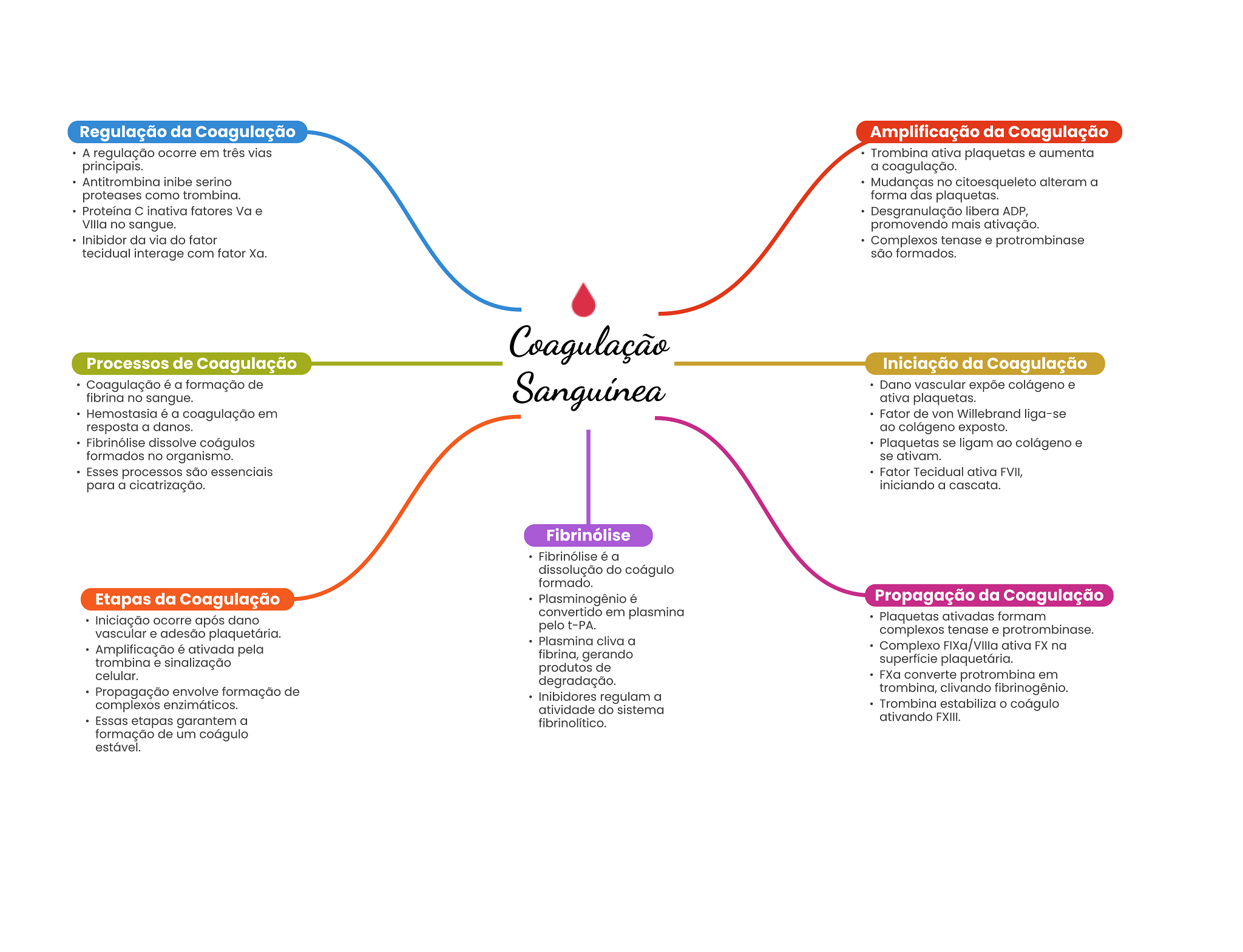 Regulação da Coagulação Amplificação da Coagulação A regulação ocorre em três vias Trombina ativa plaquetas e aumenta principais. a coagulação. Antitrombina inibe serino Mudanças no citoesqueleto alteram a proteases como trombina. forma das plaquetas. Proteína C inativa fatores Va e Desgranulação libera ADP, Villa no sangue. promovendo mais ativação. Inibidor da via do fator Complexos tenase e protrombinase tecidual interage com fator Xa. são formados. Coagulação Processos de Coagulação Iniciação da Coagulação Coagulação é a formação de Sanguínea Dano vascular expõe colágeno e fibrina no sangue. ativa plaquetas. Hemostasia é a coagulação em Fator de von Willebrand liga-se resposta a danos. ao colágeno exposto. Fibrinólise dissolve coágulos Plaquetas se ligam ao colágeno e formados no organismo. se ativam. Esses processos são essenciais Fator Tecidual ativa FVII, para a cicatrização. iniciando a cascata. Fibrinólise Fibrinólise é a dissolução do coágulo formado. Etapas da Coagulação Plasminogênio é Propagação da Coagulação convertido em plasmina Iniciação ocorre após dano Plaquetas ativadas formam pelo t-PA. vascular e adesão plaquetária. complexos tenase e protrombinase. Plasmina cliva a Amplificação é ativada pela Complexo ativa FX na fibrina, gerando trombina e sinalização plaquetária. produtos de celular. degradação. FXa converte protrombina em Propagação envolve formação de trombina, clivando fibrinogênio. Inibidores regulam a complexos enzimáticos. atividade do sistema Trombina estabiliza coágulo Essas etapas garantem a ativando FXIII. fibrinolítico. formação de um coágulo estável.