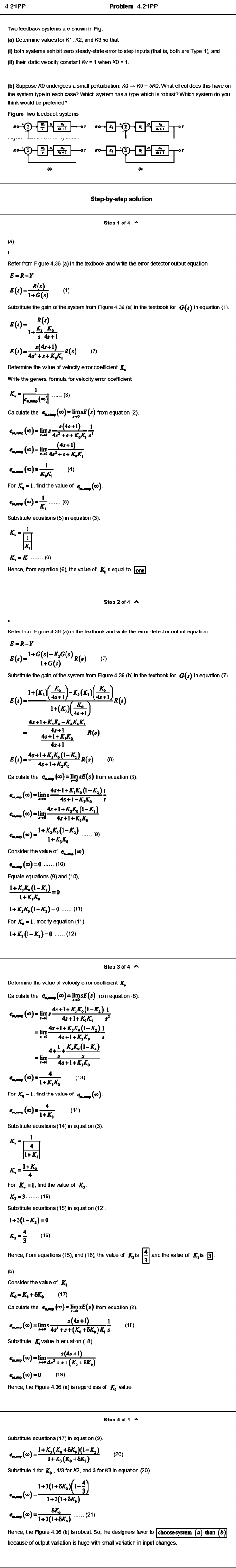 Problem 4.21 PP (a) Determine values for K^. K2, and K3 so that (i) both systems exhibit zero steady-state error to step inputs (that is. both are Type 1). and (ii) their static velocity constant /Cv = 1 when KO = 1. Two feedback systems are shown in Fig. (b) Suppose KQ undergoes a small perturbation: KQ-* + 5KQ. What effect does this have on the system type in each case? Which system has a type which is robust? Which system do you think would be preferred? Figure Two feedback systems h p '' ^ l - p ' ’ Step-by-step solution step 1 of 4 (a) Refer from Figure 4.36 (a) in the textbook and write the emor detector output equation. E ^ R - Y (1)E ( s U - ^ ^ ^ 1+G (s) Substitute the gain of the system from Figure 4.36 (a) in the textbook for G («) in equation (1). (2) ^ ' A s ^ + s + K ^ , ' ' Determine the value of velocity error coefficient K , ■ Write the general formula for velocity error coefficient. Calculate the ^ . ^ ( o o ) = U in s £ ( j) from equation (2). , . .. i ( 4 s + l ) 1 'b j-p V ) 4s^+s + K JC ^s' (4s+ \) ^ H = l i 2 1 z r’ - ^ 4 s ‘ + s + K ^ i (o o )s— !— . ’ K .K , (4) ForJS:.= l , find the value of (5) (® ) (oo) ■ — . Substitute equations (5) in equation (3). = ....... (6) Hence, from equation (6), the value of is equal to |pnel • Step 2 of 4 Refer from Figure 4.36 (a) in the textbook and write the emor detector output equation. E s R — Y Substitute the gain of the system from Figure 4.36 (b) in the textbook for in equation (7). --------------i 4 £ ± i £ _ i d £ ± y j t ( , ) ------------R(s) (8) 4J + 1 + C A 4s + l Calculate the from equation (8). 4 s+ i + a:,a:„ , , 4 j + i + i r A ( i - A : , ) ^ ( * ) = ------------- “4 1 + i + a:,* :. , X l i M M J Consider the value of ^ ( » ) • e . « , H = 0 (10) Equate equations (9) and (10), U K , K , ( \ - K , ) i+ A r , x . ( i - ^ : , ) = o (11) For AT̂ « i , modify equation (11). i + i : , ( i - a: , )= o ......(1 2 ) (9) Step 3 of 4 Determine the value of velocity error coefficient K, Calculate the from equation (8). ' ’ ,-M 4s + i + a:,k , *’ ■ — 4 s + i+ ^ r ,^ :. s ^ ̂ 1 ̂ K , K , ( \ - K , ) pH ' , H • lim — S ^.■M 4 ■ (13) F o r j r . = l , find the value of 4 ■.......... ....... (14) U K , ' ^ Substitute equations (14) in equation (3). a: . * \ U K , \ U K , For AT, a 1. find the value of K,- a: , = 3 ........ (15) Substitute equations (15) in equation (12). i+ 3 ( i - * r j ) = o .(16)K - 1« p - 3 Hence, from equations (15), and (16). the value (b) Consider the value of A^. K ^ ^ K ^ + 8 K ^ ...... (17) Calculate the ^ * pH = '™ » ^ W from equation (2). of ATjis and the value of AT, is [^ . .(18) ‘ i . * p l ) ‘™ * 4 i ’ + i+ (A r .+ S A r ,) iir , j Substitute AT| value in equation (18). •b » p v I « P 4 i ' + * + ( * ; ,+ 8 a:„) e . « p H = 0 (19) Hence, the Figure 4.36 (a) is regardless of K^ value. Step 4 of 4 Substitute equations (17) in equation (9). , . i + a: , ( a: . + 5 a: . ) ( i - a: , ) t _ (