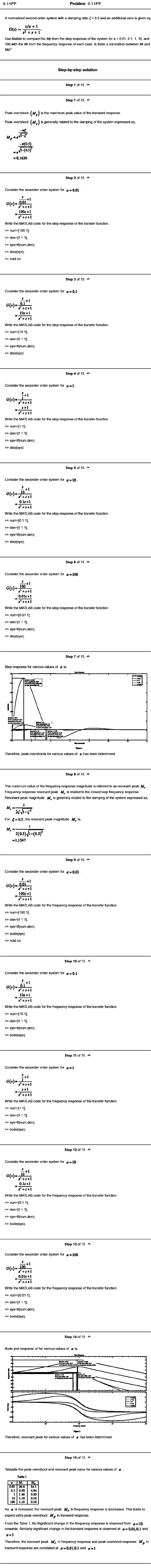 Use Matlab to compare the Mpfrom the step response of the system fora = 0.01,0.1,1.10, and