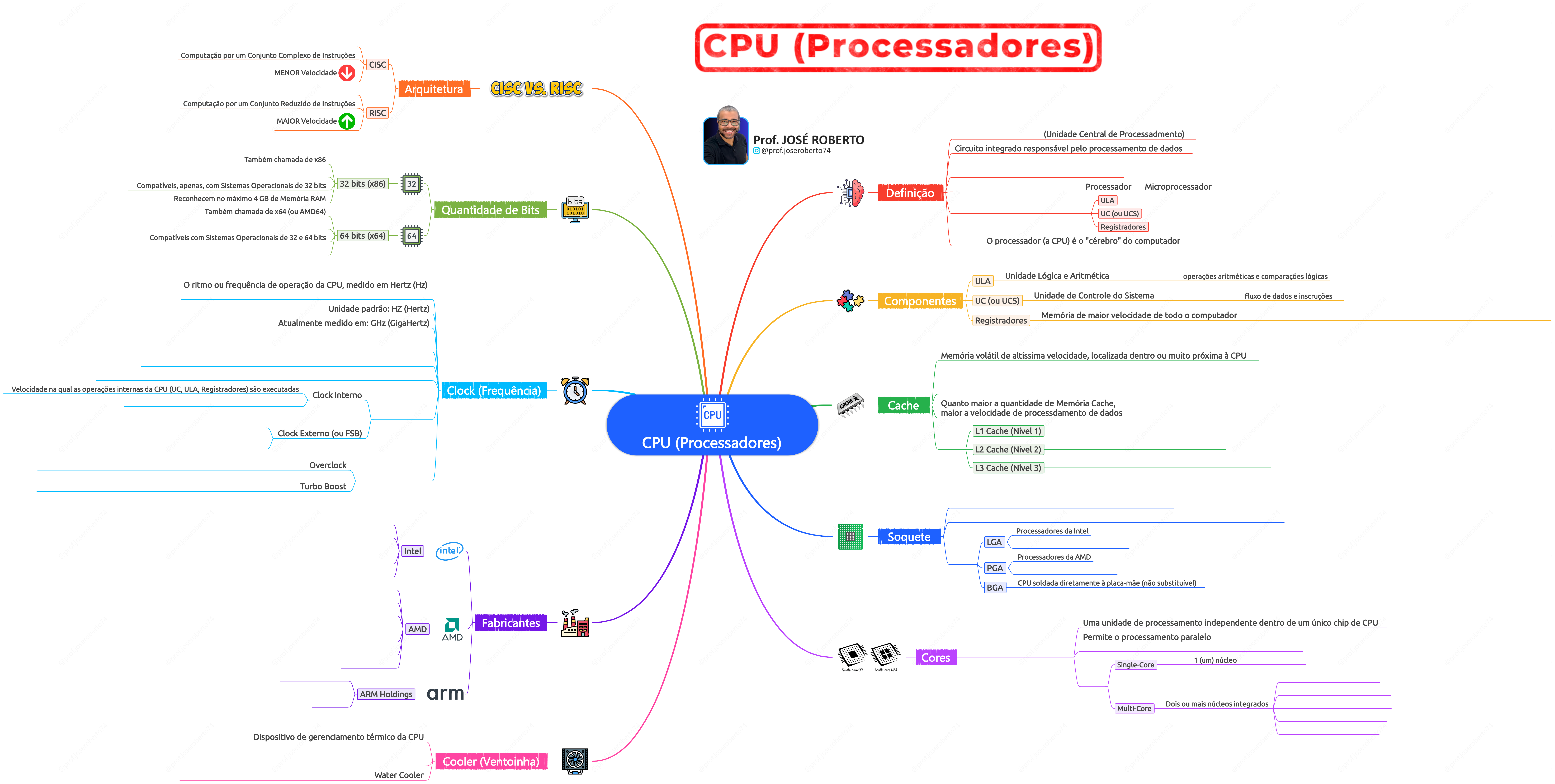CPU (Processadores) Definição Central Processing Unit (Unidade Central de Processadmento) Executa instruções do usuários e programas por meio de operações lógicas e aritméticas Também chamado pelas bancas de Processador ou Microprocessador Circuito integrado responsável pelo processamento de dados Composto por 3 (três) elementos ULA UC (ou UCS) Registradores Ou seja: O processador (a CPU) é o "cérebro" do computador Componentes ULA Unidade Lógica e Aritmética UC (ou UCS) Unidade de Controle do Sistema Registradores Memória de maior velocidade de todo o computador Responsável pelas operações aritméticas e comparações lógicas Gerência e coordena o fluxo de dados e inscruções Responsável por armazenae de forma temporária os proximos dados a serem processados Cache Memória volátil de altíssima velocidade, localizada dentro ou muito próxima à CPU Armazenar temporariamente dados e instruções frequentemente utilizados pela CPU, reduzindo o tempo de acesso à RAM e aumentando assim a velocidade de processamento Quanto maior a quantidade de Memória Cache, maior a velocidade de processdamento de dados Tipos L1 Cache (Nível 1) L2 Cache (Nível 2) L3 Cache (Nível 3) Soquete Conector físico na placa-mãe que acomoda o chip da CPU Fornece conexão elétrica e mecânica entre a CPU e a placa-mãe (e o restante do sistema) Tipos LGA Processadores da Intel Pinos de contato estão no soquete PGA Processadores da AMD Pinos de contato estão na CPU BGA CPU soldada diretamente à placa-mãe (não substituível) Cores Uma unidade de processamento independente dentro de um único chip de CPU Núcleos de Processamento Permite o processamento paralelo, aumentando a capacidade de execução simultânea de tarefas (threads) Tipos Single-Core Apenas 1 (um) núcleo de processamento Multi-Core Dois ou mais núcleos integrados Dual-Core Quad-Core Core 2 Duo Core 2 Quad Octa Core 2 (dois) núcleos 4 (quatro) núcleos 4 (quatro) núcleos 8 (oito) núcleos 8 (oito) núcleos Arquitetura CISC Complex Instruction Set Computer Computação por um Conjunto Complexo de Instruções MENOR Velocidade RISC Reduced Instruction Set Computer Computação por um Conjunto Reduzido de Instruções MAIOR Velocidade Quantidade de Bits Também chamada de x86 Compatíveis, apenas, com Sistemas Operacionais de 32 bits A palavra de processamento (tamanho do registrador e dos endereços) é de 32 bits Também chamada de x64 (ou AMD64) A palavra de processamento é de 64 bits Compatíveis com Sistemas Operacionais de 32 e 64 bits Reconhecem no máximo 4 GB de Memória RAM Reconhecem e trabalham com sistemas acima de 4 GB de Memória RAM Clock (Frequência) O ritmo ou frequência de operação da CPU, medido em Hertz (Hz) (MegaHertz - MHz ou GigaHertz - GHz) Quanto maior o Clock, maior a quantidade de ciclos executados por segundo Unidade padrão: HZ (Hertz) Atualmente medido em: GHz (GigaHertz) Sincroniza todas as operações internas da CPU. Um ciclo de clock executa uma ou mais micro-operações A velocidade do Clock afeta diretamente a performance e o desempenho do processador Tipos de Clock Clock Interno Clock Externo (ou FSB) Velocidade na qual as operações internas da CPU (UC, ULA, Registradores) são executadas Determina a velocidade de processamento de dados Velocidade de comunicação do barramento de dados externo da CPU, que a conecta à Placa-Mãe e aos demais componentes (RAM, Chipset) Define a velocidade de comunicação e transferência de dados com a Memória RAM e os demais componentes do sistema Alteração de Clock Overclock Turbo Boost Processo de forçar um componente de um computador a rodar numa freqüência, definida em hertz mais alta do que a especificada pelo fabricante Permite o aumento dinâmico da velocidade de clock da CPU, processo que é gerenciado pelo Sistema Operacional e que só corre quando necessário Fabricantes Celeron Pentium (Família) Core i3, i5, i7 e i9 Core Ultra Xeon Athlon Duron Semprom Turion Opteron Phenom Ryzen 3, 5, 7 e 9 Apple (Séries M e A) Qualcomm Snapdragon MediaTek Cooler (Ventoinha) Dispositivo de gerenciamento térmico da CPU Water Cooler Dissipar o calor gerado pelo processamento, garantindo que a CPU opere dentro dos limites de temperatura e evite o thermal throttling (redução de desempenho) Utiliza um fluido e um radiador para dissipação de calor Menor e mais rápida, dedicada a cada Core. Armazena dados e instruções Maior que L1, dedicada por Core ou compartilhada Maior e mais lenta, geralmente compartilhada por todos os Cores 32 bits (x86) 64 bits (x64) Intel AMD ARM Holdings