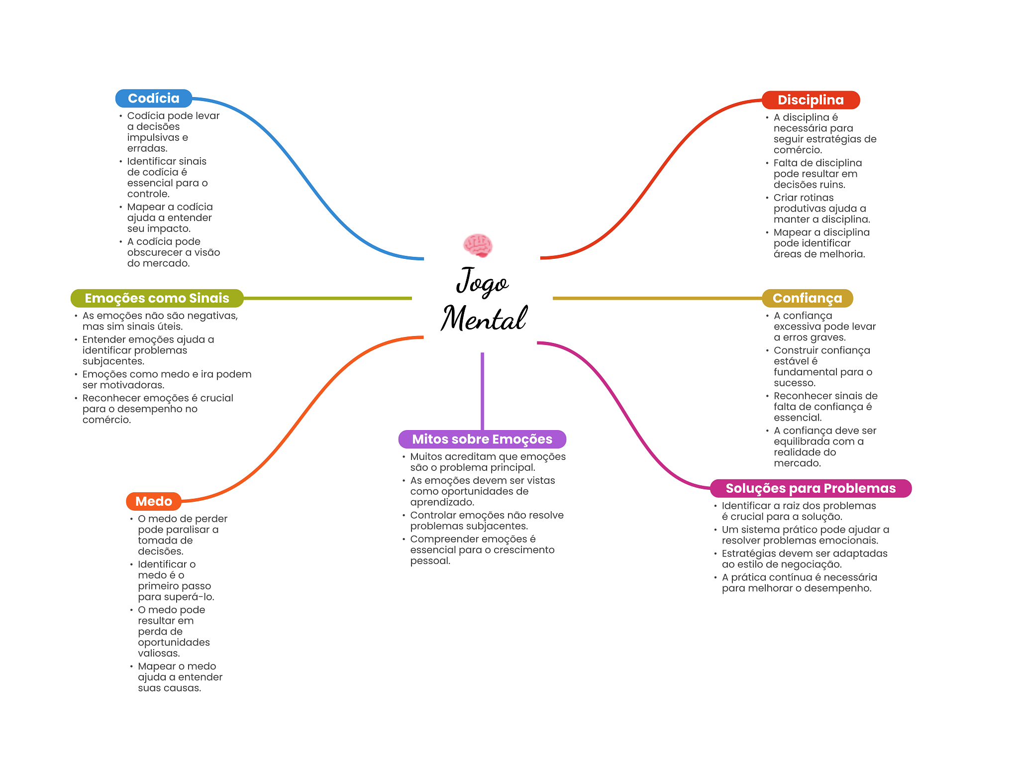 Codícia Disciplina Codícia pode levar A disciplina é a decisões necessária para impulsivas e seguir estratégias de erradas. comércio. Identificar sinais Falta de disciplina de codícia é pode resultar em essencial para decisões ruins. controle. Criar rotinas Mapear a codícia produtivas ajuda a ajuda a entender manter a disciplina. seu impacto. Mapear a disciplina A codícia pode pode identificar obscurecer a visão áreas de melhoria. do mercado. Jogo Emoções como Sinais Confiança As emoções não são negativas, mas sim sinais úteis. Mental A confiança excessiva pode levar Entender emoções ajuda a a erros graves. identificar problemas Construir confiança subjacentes. estável é Emoções como medo e ira podem fundamental para O ser motivadoras. sucesso. Reconhecer emoções é crucial Reconhecer sinais de para desempenho no falta de confiança é comércio. essencial. A confiança deve ser Mitos sobre Emoções equilibrada com a realidade do Muitos acreditam que emoções são problema principal. mercado. As emoções devem ser vistas como oportunidades de Soluções para Problemas Medo aprendizado. Identificar a raiz dos problemas medo de perder Controlar emoções não resolve é crucial para a solução. pode paralisar a problemas subjacentes. Um sistema prático pode ajudar a tomada de Compreender emoções é resolver problemas emocionais. decisões. essencial para crescimento Estratégias devem ser adaptadas Identificar pessoal. ao estilo de negociação. medo é A prática contínua é necessária primeiro passo para melhorar desempenho. para superá-lo. medo pode resultar em perda de oportunidades valiosas. Mapear medo ajuda a entender suas causas.