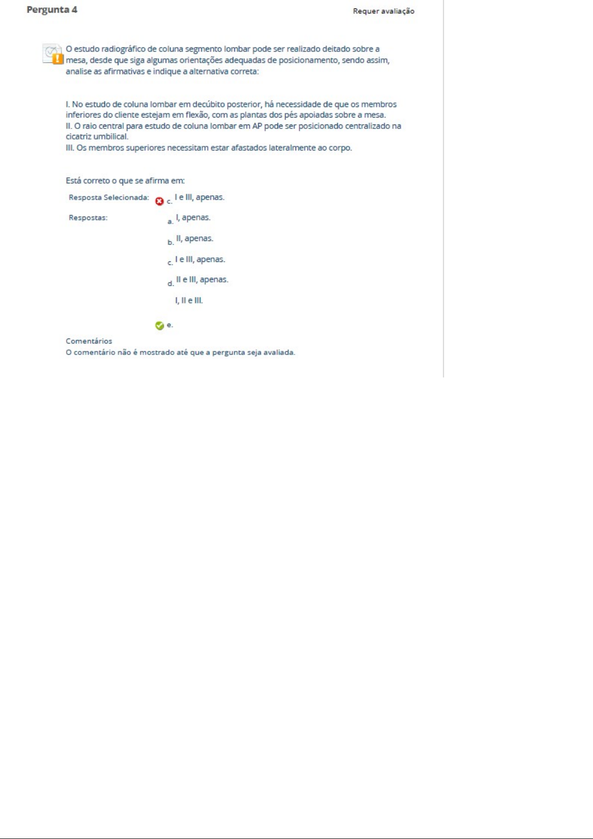 Pergunta 4 Requer avaliação estudo radiográfico de coluna segmento lombar pode ser realizado deitado sobre a ! mesa, desde que siga algumas orientações adequadas de posicionamento, sendo assim, analise as afirmativas e indique a alternativa correta: I. No estudo de coluna lombar em decúbito posterior, há necessidade de que os membros inferiores do cliente estejam em flexão, com as plantas dos pés apoiadas sobre a mesa. II. raio central para estudo de coluna lombar em AP pode ser posicionado centralizado na cicatriz umbilical. III. Os membros superiores necessitam estar afastados lateralmente ao corpo. Está correto o que se afirma em: Resposta Selecionada: le III, apenas. Respostas: a. I, apenas. b. II, apenas. le III, apenas. d. e III, apenas. I, II e III. e. Comentários comentário não é mostrado até que a pergunta seja avaliada.