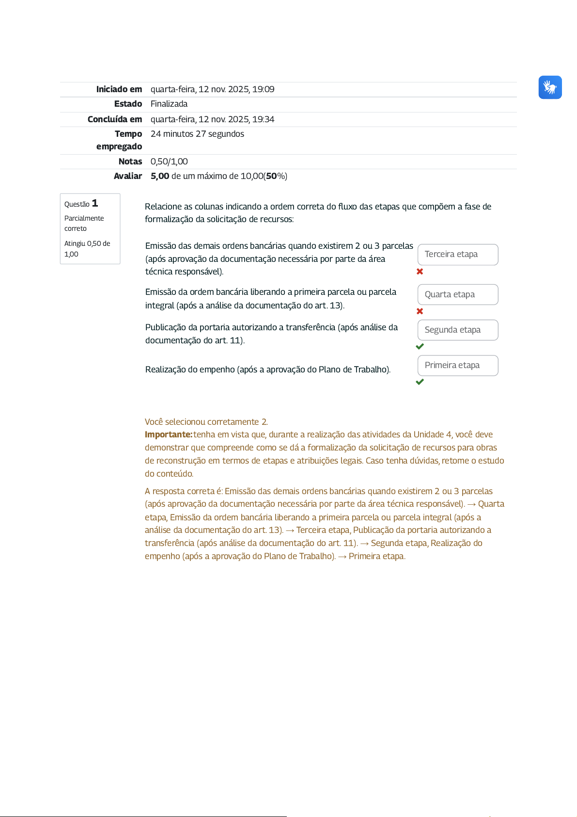 Questão 1 Parcialmente correto Atingiu 0,50 de 1,00 Iniciado em quarta-feira, 12 nov. 2025, 19:09 Estado Finalizada Concluída em quarta-feira, 12 nov. 2025, 19:34 Tempo empregado 24 minutos 27 segundos Notas 0,50/1,00 Avaliar 5,00 de um máximo de 10,00(50%) Relacione as colunas indicando a ordem correta do fluxo das etapas que compõem a fase de formalização da solicitação de recursos: Emissão das demais ordens bancárias quando existirem 2 ou 3 parcelas (após aprovação da documentação necessária por parte da área técnica responsável). Emissão da ordem bancária liberando a primeira parcela ou parcela integral (após a análise da documentação do art. 13). Publicação da portaria autorizando a transferência (após análise da documentação do art. 11). Realização do empenho (após a aprovação do Plano de Trabalho). Terceira etapa Quarta etapa Segunda etapa Primeira etapa Você selecionou corretamente 2. Importante: tenha em vista que, durante a realização das atividades da Unidade 4, você deve demonstrar que compreende como se dá a formalização da solicitação de recursos para obras de reconstrução em termos de etapas e atribuições legais. Caso tenha dúvidas, retome o estudo do conteúdo. A resposta correta é: Emissão das demais ordens bancárias quando existirem 2 ou 3 parcelas (após aprovação da documentação necessária por parte da área técnica responsável). → Quarta etapa, Emissão da ordem bancária liberando a primeira parcela ou parcela integral (após a análise da documentação do art. 13). → Terceira etapa, Publicação da portaria autorizando a transferência (após análise da documentação do art. 11). → Segunda etapa, Realização do empenho (após a aprovação do Plano de Trabalho). → Primeira etapa.