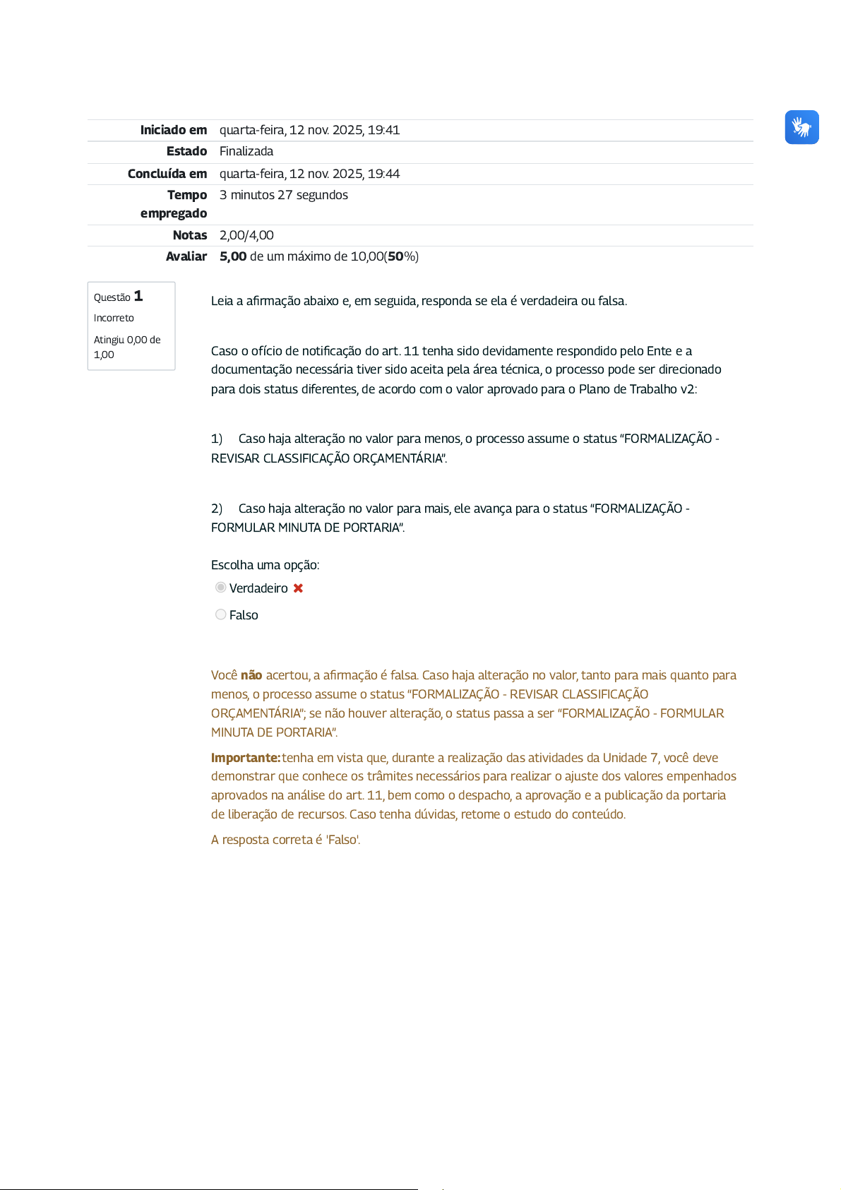 Questão 1 Incorreto Atingiu 0,00 de 1,00 Iniciado em quarta-feira, 12 nov. 2025, 19:41 Estado Finalizada Concluída em quarta-feira, 12 nov. 2025, 19:44 Tempo empregado 3 minutos 27 segundos Notas 2,00/4,00 Avaliar 5,00 de um máximo de 10,00(50%) Leia a afirmação abaixo e, em seguida, responda se ela é verdadeira ou falsa. Caso o ofício de notificação do art. 11 tenha sido devidamente respondido pelo Ente e a documentação necessária tiver sido aceita pela área técnica, o processo pode ser direcionado para dois status diferentes, de acordo com o valor aprovado para o Plano de Trabalho v2: 1) Caso haja alteração no valor para menos, o processo assume o status “FORMALIZAÇÃO - REVISAR CLASSIFICAÇÃO ORÇAMENTÁRIA”. 2) Caso haja alteração no valor para mais, ele avança para o status “FORMALIZAÇÃO - FORMULAR MINUTA DE PORTARIA”. Escolha uma opção: Verdadeiro Falso Você não acertou, a afirmação é falsa. Caso haja alteração no valor, tanto para mais quanto para menos, o processo assume o status “FORMALIZAÇÃO - REVISAR CLASSIFICAÇÃO ORÇAMENTÁRIA”; se não houver alteração, o status passa a ser “FORMALIZAÇÃO - FORMULAR MINUTA DE PORTARIA”. Importante: tenha em vista que, durante a realização das atividades da Unidade 7, você deve demonstrar que conhece os trâmites necessários para realizar o ajuste dos valores empenhados aprovados na análise do art. 11, bem como o despacho, a aprovação e a publicação da portaria de liberação de recursos. Caso tenha dúvidas, retome o estudo do conteúdo. A resposta correta é 'Falso'. Questão 2 Correto Atingiu 1,00 de 1,00 Questão 3 Correto Atingiu 1,00 de 1,00 Assinale a alternativa CORRETA. O processo é encaminhado para o cancelamento parcial quando: Escolha uma opção: a. o valor estipulado para o cumprimento do art. 11 é IGUAL ao aprovado no Plano de Trabalho v1. b. o valor estipulado para o cumprimento do art. 11 é INFERIOR ao aprovado no Plano de Trabalho v1. c. o valor estipulado para o cumprimento do art. 11 é SUPERIOR ao aprovado no Plano de Trabalho v1. d. o valor estipulado para o cumprimento do art. 11 é DIVERGENTE do aprovado no Plano de Trabalho v1, tanto para mais quanto para menos. Parabéns! Você acertou, a alternativa correta é a letra b, pois o processo é encaminhado para o cancelamento parcial quando o valor estipulado para o cumprimento do art. 11 é INFERIOR ao aprovado no Plano de Trabalho v1. Importante: tenha em vista que, durante a realização das atividades da Unidade 7, você deve demonstrar que conhece os trâmites necessários para realizar o ajuste dos valores empenhados aprovados na análise do art. 11, bem como o despacho, a aprovação e a publicação da portaria de liberação de recursos. Caso tenha dúvidas, retome o estudo do conteúdo. A resposta correta é: o valor estipulado para o cumprimento do art. 11 é INFERIOR ao aprovado no Plano de Trabalho v1. Assinale a alternativa CORRETA. O processo é encaminhado para o empenho complementar quando: Escolha uma opção: a. o valor estipulado para o cumprimento do art. 11 é IGUAL ao aprovado no Plano de Trabalho v1. b. o valor estipulado para o cumprimento do art. 11 é INFERIOR ao aprovado no Plano de Trabalho v1. c. o valor estipulado para o cumprimento do art. 11 é SUPERIOR ao aprovado no Plano de Trabalho v1. d. o valor estipulado para o cumprimento do art. 11 é DIVERGENTE do aprovado no Plano de Trabalho v1, tanto para mais quanto para menos. Parabéns! Você acertou, a alternativa correta é a letra c, pois o processo é encaminhado para o empenho complementar quando o valor estipulado para o cumprimento do art. 11 é SUPERIOR ao aprovado no Plano de Trabalho v1. Importante: tenha em vista que, durante a realização das atividades da Unidade 7, você deve demonstrar que conhece os trâmites necessários para realizar o ajuste dos valores empenhados aprovados na análise do art. 11, bem como o despacho, a aprovação e a publicação da portaria de liberação de recursos. Caso tenha dúvidas, retome o estudo do conteúdo. A resposta correta é: o valor estipulado para o cumprimento do art. 11 é SUPERIOR ao aprovado no Plano de Trabalho v1. Questão 4 Incorreto Atingiu 0,00 de 1,00 Leia a afirmação abaixo e, em seguida, responda se ela é verdadeira ou falsa. Uma vez autorizada a transferência de recursos e tendo sido feita a publicação no Diário Oficial da União, deve ser elaborada e aprovada a minuta de portaria para que, então, a portaria seja publicada. Escolha uma opção: Verdadeiro Falso Você não acertou, a afirmação é verdadeira. Autorizada a transferência de recursos, há a publicação no Diário Oficial da União, incluindo a vigência do instrumento de repasse. Em seguida, deve ser elaborada e aprovada a minuta de portaria para, então, haver a sua publicação. Importante: tenha em vista que, durante a realização das atividades da Unidade 7, você deve demonstrar que conhece os trâmites necessários para realizar o ajuste dos valores empenhados aprovados na análise do art. 11, bem como o despacho, a aprovação e a publicação da portaria de liberação de recursos. Caso tenha dúvidas, retome o estudo do conteúdo. A resposta correta é 'Verdadeiro'.