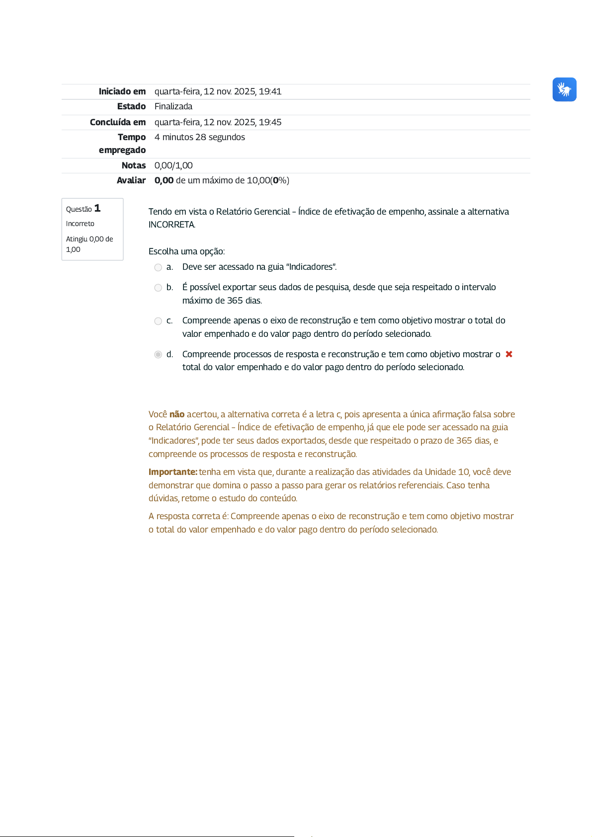 Questão 1 Incorreto Atingiu 0,00 de 1,00 Iniciado em quarta-feira, 12 nov. 2025, 19:41 Estado Finalizada Concluída em quarta-feira, 12 nov. 2025, 19:45 Tempo empregado 4 minutos 28 segundos Notas 0,00/1,00 Avaliar 0,00 de um máximo de 10,00(0%) Tendo em vista o Relatório Gerencial – Índice de efetivação de empenho, assinale a alternativa INCORRETA. Escolha uma opção: a. Deve ser acessado na guia “Indicadores”. b. É possível exportar seus dados de pesquisa, desde que seja respeitado o intervalo máximo de 365 dias. c. Compreende apenas o eixo de reconstrução e tem como objetivo mostrar o total do valor empenhado e do valor pago dentro do período selecionado. d. Compreende processos de resposta e reconstrução e tem como objetivo mostrar o total do valor empenhado e do valor pago dentro do período selecionado. Você não acertou, a alternativa correta é a letra c, pois apresenta a única afirmação falsa sobre o Relatório Gerencial – Índice de efetivação de empenho, já que ele pode ser acessado na guia “Indicadores”, pode ter seus dados exportados, desde que respeitado o prazo de 365 dias, e compreende os processos de resposta e reconstrução. Importante: tenha em vista que, durante a realização das atividades da Unidade 10, você deve demonstrar que domina o passo a passo para gerar os relatórios referenciais. Caso tenha dúvidas, retome o estudo do conteúdo. A resposta correta é: Compreende apenas o eixo de reconstrução e tem como objetivo mostrar o total do valor empenhado e do valor pago dentro do período selecionado.
