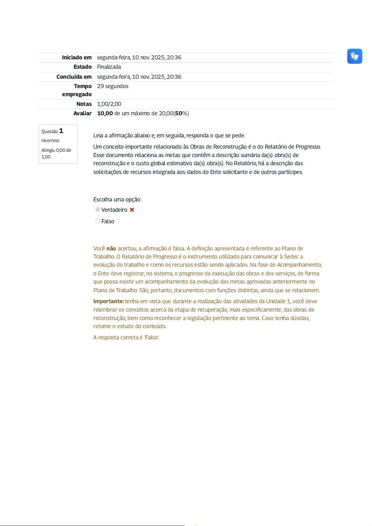 Questão 1 Incorreto Atingiu 0,00 de 1,00 Iniciado em segunda-feira, 10 nov. 2025, 20:36 Estado Finalizada Concluída em segunda-feira, 10 nov. 2025, 20:36 Tempo empregado 29 segundos Notas 1,00/2,00 Avaliar 10,00 de um máximo de 20,00(50%) Leia a afirmação abaixo e, em seguida, responda o que se pede. Um conceito importante relacionado às Obras de Reconstrução é o do Relatório de Progresso. Esse documento relaciona as metas que contêm a descrição sumária da(s) obra(s) de reconstrução e o custo global estimativo da(s) obra(s). No Relatório, há a descrição das solicitações de recursos integrada aos dados do Ente solicitante e de outros partícipes. Escolha uma opção: Verdadeiro Falso Você não acertou, a afirmação é falsa. A definição apresentada é referente ao Plano de Trabalho. O Relatório de Progresso é o instrumento utilizado para comunicar à Sedec a evolução do trabalho e como os recursos estão sendo aplicados. Na fase de Acompanhamento, o Ente deve registrar, no sistema, o progresso da execução das obras e dos serviços, de forma que possa existir um acompanhamento da evolução das metas aprovadas anteriormente no Plano de Trabalho. São, portanto, documentos com funções distintas, ainda que se relacionem. Importante: tenha em vista que durante a realização das atividades da Unidade 1, você deve relembrar os conceitos acerca da etapa de recuperação, mais especificamente, das obras de reconstrução, bem como reconhecer a legislação pertinente ao tema. Caso tenha dúvidas, retome o estudo do conteúdo. A resposta correta é 'Falso'. Questão 2 Correto Atingiu 1,00 de 1,00 Relacione a legislação apresentada com seu escopo. a. Lei n° 12.983, de 2 de junho de 2014. b. Decreto n° 10.593, de 24 de dezembro de 2020. c. Portaria MDR n° 3.033, de 4 de dezembro de 2020. Altera a Lei nº 12.340 para dispor sobre as transferências de recursos para a execução de ações de prevenção em áreas de risco e de resposta e recuperação em áreas atingidas por desastres. Define ações de reconstrução como medidas desenvolvidas após a ocorrência do desastre destinadas a restabelecer a normalidade social, que abrangem a reconstrução de infraestrutura danificada ou destruída e a recuperação do meio ambiente e da economia. Entre outras determinações, estabelece que os Entes federados deverão preencher Plano de Trabalho e Relatório de Diagnóstico, no prazo de 90 (noventa) dias da ocorrência do desastre, assinados pela autoridade competente e pelo responsável técnico do S2ID. a b c Parabéns! Você acertou a relação entre as colunas. A Lei n° 12.983, de 2 de junho de 2014, altera a Lei nº 12.340 para dispor sobre as transferências de recursos para a execução de ações de prevenção em áreas de risco e de resposta e recuperação em áreas atingidas por desastres. O Decreto n° 10.593, de 24 de dezembro de 2020, define ações de reconstrução como medidas desenvolvidas após a ocorrência do desastre, destinadas a restabelecer a normalidade social, que abrangem a reconstrução de infraestrutura danificada ou destruída e a recuperação do meio ambiente e da economia. Já a Portaria MDR n° 3.033, de 4 de dezembro de 2020, entre outras determinações, estabelece que os Entes federados deverão preencher Plano de Trabalho e Relatório de Diagnóstico, no prazo de 90 (noventa) dias da ocorrência do desastre, assinados pela autoridade competente e pelo responsável técnico do S2ID. Importante: tenha em vista que durante a realização das atividades da Unidade 1, você deve relembrar os conceitos acerca da etapa de recuperação, mais especificamente, das obras de reconstrução, bem como reconhecer a legislação pertinente ao tema. Caso tenha dúvidas, retome o estudo do conteúdo. A resposta correta é: Altera a Lei nº 12.340 para dispor sobre as transferências de recursos para a execução de ações de prevenção em áreas de risco e de resposta e recuperação em áreas atingidas por desastres. → a, Define ações de reconstrução como medidas desenvolvidas após a ocorrência do desastre destinadas a restabelecer a normalidade social, que abrangem a reconstrução de infraestrutura danificada ou destruída e a recuperação do meio ambiente e da economia. → b, Entre outras determinações, estabelece que os Entes federados deverão preencher Plano de Trabalho e Relatório de Diagnóstico, no prazo de 90 (noventa) dias da ocorrência do desastre, assinados pela autoridade competente e pelo responsável técnico do S2ID. → c.