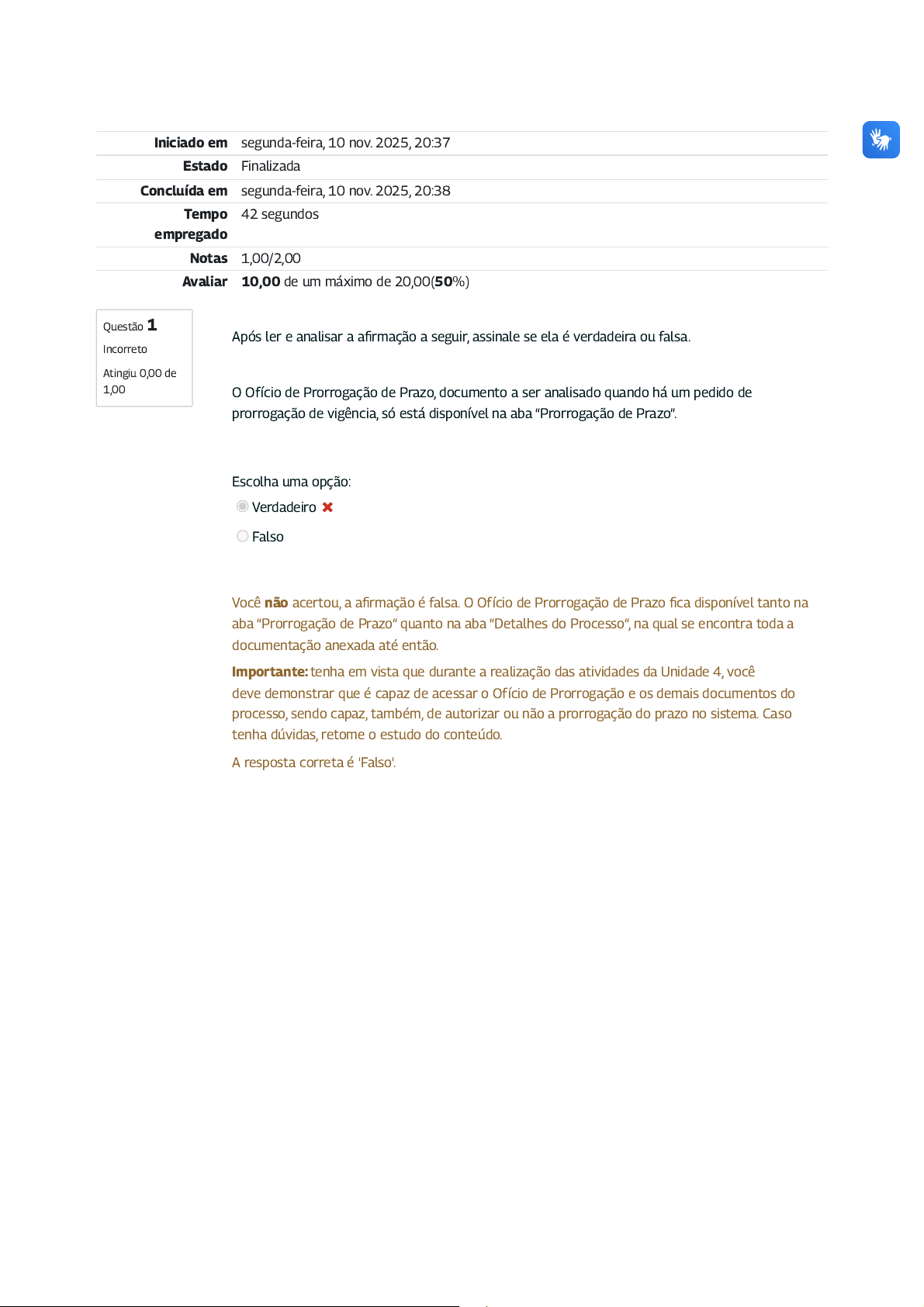 Questão 1 Incorreto Atingiu 0,00 de 1,00 Iniciado em segunda-feira, 10 nov. 2025, 20:37 Estado Finalizada Concluída em segunda-feira, 10 nov. 2025, 20:38 Tempo empregado 42 segundos Notas 1,00/2,00 Avaliar 10,00 de um máximo de 20,00(50%) Após ler e analisar a afirmação a seguir, assinale se ela é verdadeira ou falsa. O Ofício de Prorrogação de Prazo, documento a ser analisado quando há um pedido de prorrogação de vigência, só está disponível na aba “Prorrogação de Prazo”. Escolha uma opção: Verdadeiro Falso Você não acertou, a afirmação é falsa. O Ofício de Prorrogação de Prazo fica disponível tanto na aba “Prorrogação de Prazo” quanto na aba “Detalhes do Processo”, na qual se encontra toda a documentação anexada até então. Importante: tenha em vista que durante a realização das atividades da Unidade 4, você deve demonstrar que é capaz de acessar o Ofício de Prorrogação e os demais documentos do processo, sendo capaz, também, de autorizar ou não a prorrogação do prazo no sistema. Caso tenha dúvidas, retome o estudo do conteúdo. A resposta correta é 'Falso'. Questão 2 Correto Atingiu 1,00 de 1,00 Após ler e analisar a afirmação a seguir, assinale se ela é verdadeira ou falsa. O fluxo de análise da solicitação da prorrogação de prazo encerra-se com o Secretário. No momento em que ele decide prorrogar, o processo segue para o perfil “Analista DAG”, que deve registrar a nova data da vigência, sob o status “ACOMPANHAMENTO – REGISTRAR A PRORROGAÇÃO DA VIGÊNCIA”. Nos casos em que o Secretário opta por não prorrogar a vigência, o processo retorna para o status “ACOMPANHAMENTO – RECURSO TRANSFERIDO”. Escolha uma opção: Verdadeiro Falso Parabéns! Você acertou, a afirmação é verdadeira. Quando o Secretário opta por prorrogar a vigência, atendendo à solicitação, o analista DAG recebe o processo com o status “ACOMPANHAMENTO – REGISTRAR A PRORROGAÇÃO DA VIGÊNCIA”. Em contrapartida, se o Secretário não prorrogar a vigência, o status retorna para “ACOMPANHAMENTO – RECURSO TRANSFERIDO”. Importante: tenha em vista que durante a realização das atividades da Unidade 4, você deve demonstrar que é capaz de acessar o Ofício de Prorrogação e os demais documentos do processo, sendo capaz, também, de autorizar ou não a prorrogação do prazo no sistema. Caso tenha dúvidas, retome o estudo do conteúdo. A resposta correta é 'Verdadeiro'.