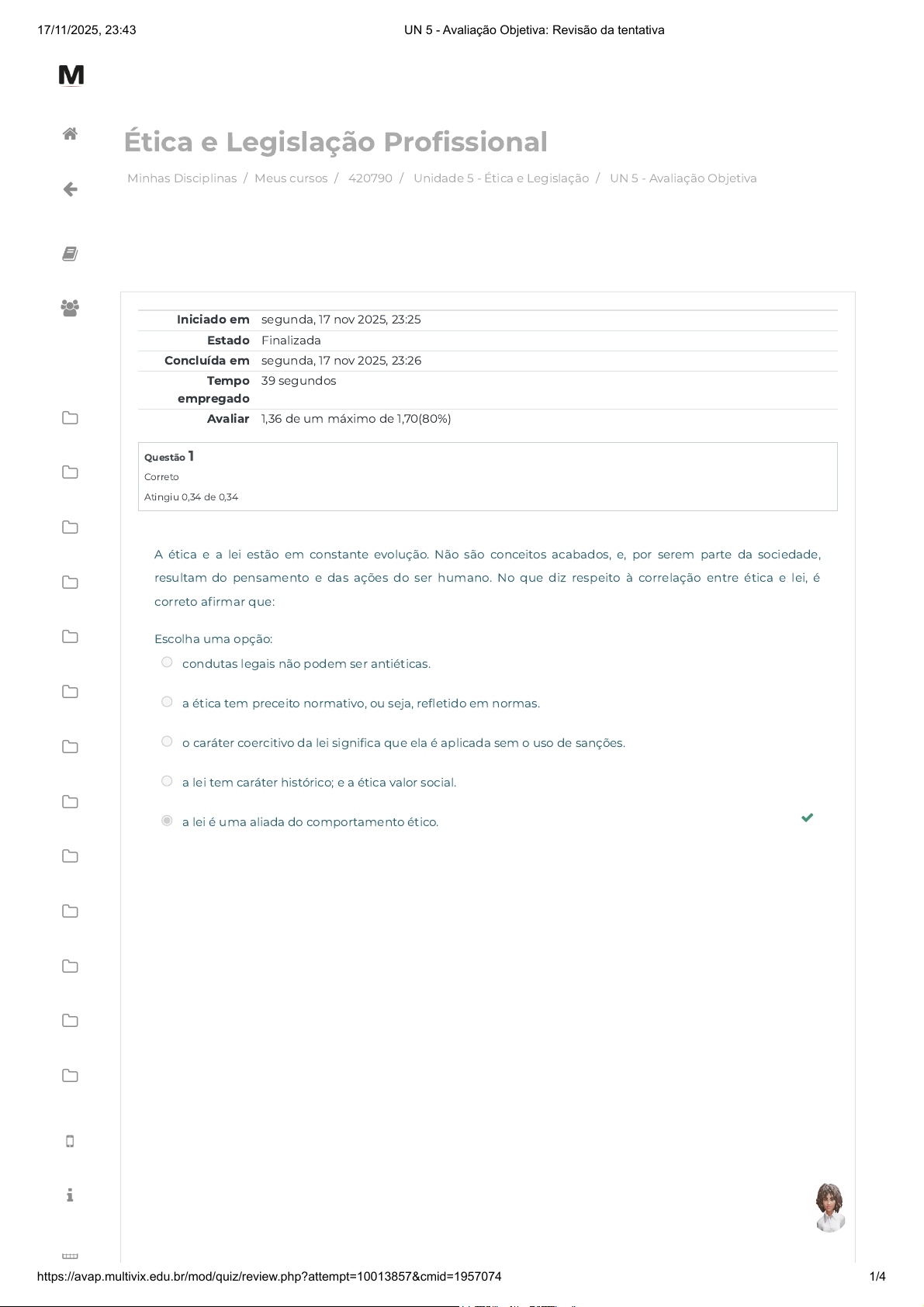 Minhas Disciplinas / Meus cursos / 420790 / Unidade 5 - Ética e Legislação / UN 5 - Avaliação Objetiva Ética e Legislação Profissional Iniciado em segunda, 17 nov 2025, 23:25 Estado Finalizada Concluída em segunda, 17 nov 2025, 23:26 Tempo empregado 39 segundos Avaliar 1,36 de um máximo de 1,70(80%) Questão 1 Correto Atingiu 0,34 de 0,34 A ética e a lei estão em constante evolução. Não são conceitos acabados, e, por serem parte da sociedade, resultam do pensamento e das ações do ser humano. No que diz respeito à correlação entre ética e lei, é correto afirmar que: Escolha uma opção: condutas legais não podem ser antiéticas. a ética tem preceito normativo, ou seja, refletido em normas. o caráter coercitivo da lei significa que ela é aplicada sem o uso de sanções. a lei tem caráter histórico; e a ética valor social. a lei é uma aliada do comportamento ético. 17/11/2025, 23:43 UN 5 - Avaliação Objetiva: Revisão da tentativa https://avap.multivix.edu.br/mod/quiz/review.php?attempt=10013857&cmid=1957074 1/4 https://avap.multivix.edu.br/my/ https://avap.multivix.edu.br/course/view.php?id=36092 https://avap.multivix.edu.br/course/view.php?id=36092§ion=6 https://avap.multivix.edu.br/mod/quiz/view.php?id=1957074 https://avap.multivix.edu.br/my/ https://avap.multivix.edu.br/course/view.php?id=36092 https://avap.multivix.edu.br/user/index.php?id=36092 https://avap.multivix.edu.br/course/view.php?id=36092§ion=1 https://avap.multivix.edu.br/course/view.php?id=36092§ion=2 https://avap.multivix.edu.br/course/view.php?id=36092§ion=3 https://avap.multivix.edu.br/course/view.php?id=36092§ion=4 https://avap.multivix.edu.br/course/view.php?id=36092§ion=5 https://avap.multivix.edu.br/course/view.php?id=36092§ion=6 https://avap.multivix.edu.br/course/view.php?id=36092§ion=7 https://avap.multivix.edu.br/course/view.php?id=36092§ion=8 https://avap.multivix.edu.br/course/view.php?id=36092§ion=9 https://avap.multivix.edu.br/course/view.php?id=36092§ion=10 https://avap.multivix.edu.br/course/view.php?id=36092§ion=11 https://avap.multivix.edu.br/course/view.php?id=36092§ion=12 https://avap.multivix.edu.br/course/view.php?id=36092§ion=13 https://avap.multivix.edu.br/hooks/portal/ https://avap.multivix.edu.br/mod/page/view.php?id=1252%2F%22%20target%3D%22_blank https://avap.multivix.edu.br/calendar/view.php/ https://avap.multivix.edu.br/ https://avap.multivix.edu.br/ https://avap.multivix.edu.br/ https://avap.multivix.edu.br/ https://avap.multivix.edu.br/ Questão 2 Incorreto Atingiu 0,00 de 0,34 Questão 3 Correto Atingiu 0,34 de 0,34 No final dos anos 90, grandes empresas do mercado americano, como Enron e Worldcom, foram responsáveis pela derrocada do mercado de ações mundial, em razão da verificação de fraudes contábeis. A resposta legislativa à perda de credibilidade devido às praticadas por grandes corporações como essas foi a criação da Lei SOX, sobre a qual é correto afirmar que: Escolha uma opção: a lei se preocupa somente com a questão contábil das empresas. o descumprimento das regras da SOX acarreta somente multas. a auditoria das empresas é realizada por órgãos internos e externos. a lei foi criada pelo senador americano Paul Sarbanes. o monitoramento e a eficácia dos controles internos das empresas cabem aos auditores. A ética passou a fazer parte da realidade do brasileiro e das empresas nacionais. Medidas de integridade, que antes poderiam ser consideradas optativas ou até mesmo diferenciais, hoje são obrigatórias, segundo a legislação. A Lei n. 12.846 trata sobre a responsabilidade administrativa e civil de pessoas jurídicas pela prática de atos contra a administração pública, nacional ou estrangeira. O termo utilizado na lei sobre a possibilidade de a empresa colaborar nas investigações de processo, para obtenção de documentos e informações que comprovem a infração, é chamado de: Escolha uma opção: Denúncia. Acordo de leniência. Colaboração premiada. Delação premiada. Acordo de cessação. 17/11/2025, 23:43 UN 5 - Avaliação Objetiva: Revisão da tentativa https://avap.multivix.edu.br/mod/quiz/review.php?attempt=10013857&cmid=1957074 2/4 https://avap.multivix.edu.br/my/ https://avap.multivix.edu.br/course/view.php?id=36092 https://avap.multivix.edu.br/user/index.php?id=36092 https://avap.multivix.edu.br/course/view.php?id=36092§ion=1 https://avap.multivix.edu.br/course/view.php?id=36092§ion=2 https://avap.multivix.edu.br/course/view.php?id=36092§ion=3 https://avap.multivix.edu.br/course/view.php?id=36092§ion=4 https://avap.multivix.edu.br/course/view.php?id=36092§ion=5 https://avap.multivix.edu.br/course/view.php?id=36092§ion=6 https://avap.multivix.edu.br/course/view.php?id=36092§ion=7 https://avap.multivix.edu.br/course/view.php?id=36092§ion=8 https://avap.multivix.edu.br/course/view.php?id=36092§ion=9 https://avap.multivix.edu.br/course/view.php?id=36092§ion=10 https://avap.multivix.edu.br/course/view.php?id=36092§ion=11 https://avap.multivix.edu.br/course/view.php?id=36092§ion=12 https://avap.multivix.edu.br/course/view.php?id=36092§ion=13 https://avap.multivix.edu.br/hooks/portal/ https://avap.multivix.edu.br/mod/page/view.php?id=1252%2F%22%20target%3D%22_blank https://avap.multivix.edu.br/calendar/view.php/ https://avap.multivix.edu.br/ https://avap.multivix.edu.br/ https://avap.multivix.edu.br/ https://avap.multivix.edu.br/ https://avap.multivix.edu.br/ Questão 4 Correto Atingiu 0,34 de 0,34 Questão 5 Correto Atingiu 0,34 de 0,34 Em 2014, a Polícia Federal brasileira deflagrou uma operação com repercussão nos cenários político, judicial e empresarial, realizando mandados de busca e apreensão, procedimentos de quebras de sigilos de dados (telemático), prisões em flagrante, dentre outras ações. Essa operação ficou conhecida como: Escolha uma opção: Lava Jato. Gestão Plena. Planador. Águia. Mandrake. A criação da imprensa na Europa do século XV, por Gutembe