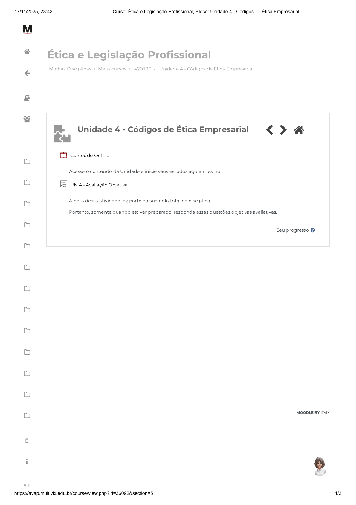 Minhas Disciplinas / Meus cursos / 420790 / Unidade 4 - Códigos de Ética Empresarial Ética e Legislação Profissional Seu progresso Conteúdo Online Acesse o conteúdo da Unidade e inicie seus estudos agora mesmo! UN 4 - Avaliação Objetiva A nota dessa atividade faz parte da sua nota total da disciplina. Portanto, somente quando estiver preparado, responda essas questões objetivas avaliativas. MOODLE BY ITVIX Unidade 4 - Códigos de Ética Empresarial 17/11/2025, 23:43 Curso: Ética e Legislação Profissional, Bloco: Unidade 4 - Códigos de Ética Empresarial https://avap.multivix.edu.br/course/view.php?id=36092§ion=5 1/2 https://avap.multivix.edu.br/my/ https://avap.multivix.edu.br/course/view.php?id=36092 https://avap.multivix.edu.br/course/view.php?id=36092§ion=5 https://avap.multivix.edu.br/course/view.php?id=36092§ion=4&singlesec=4 https://avap.multivix.edu.br/course/view.php?id=36092§ion=6&singlesec=6 https://avap.multivix.edu.br/course/view.php?id=36092 https://avap.multivix.edu.br/mod/scorm/view.php?id=1957071 https://avap.multivix.edu.br/mod/quiz/view.php?id=1957072 https://itvix.com.br/ https://avap.multivix.edu.br/my/ https://avap.multivix.edu.br/course/view.php?id=36092 https://avap.multivix.edu.br/user/index.php?id=36092 https://avap.multivix.edu.br/course/view.php?id=36092§ion=1 https://avap.multivix.edu.br/course/view.php?id=36092§ion=2 https://avap.multivix.edu.br/course/view.php?id=36092§ion=3 https://avap.multivix.edu.br/course/view.php?id=36092§ion=4 https://avap.multivix.edu.br/course/view.php?id=36092§ion=5 https://avap.multivix.edu.br/course/view.php?id=36092§ion=6 https://avap.multivix.edu.br/course/view.php?id=36092§ion=7 https://avap.multivix.edu.br/course/view.php?id=36092§ion=8 https://avap.multivix.edu.br/course/view.php?id=36092§ion=9 https://avap.multivix.edu.br/course/view.php?id=36092§ion=10 https://avap.multivix.edu.br/course/view.php?id=36092§ion=11 https://avap.multivix.edu.br/course/view.php?id=36092§ion=12 https://avap.multivix.edu.br/course/view.php?id=36092§ion=13 https://avap.multivix.edu.br/hooks/portal/ https://avap.multivix.edu.br/mod/page/view.php?id=1252%2F%22%20target%3D%22_blank https://avap.multivix.edu.br/calendar/view.php/ https://avap.multivix.edu.br/ https://avap.multivix.edu.br/ https://avap.multivix.edu.br/ 17/11/2025, 23:43 Curso: Ética e Legislação Profissional, Bloco: Unidade 4 - Códigos de Ética Empresarial https://avap.multivix.edu.br/course/view.php?id=36092§ion=5 2/2 https://avap.multivix.edu.br/my/ https://avap.multivix.edu.br/course/view.php?id=36092 https://avap.multivix.edu.br/user/index.php?id=36092 https://avap.multivix.edu.br/course/view.php?id=36092§ion=1 https://avap.multivix.edu.br/course/view.php?id=36092§ion=2 https://avap.multivix.edu.br/course/view.php?id=36092§ion=3 https://avap.multivix.edu.br/course/view.php?id=36092§ion=4 https://avap.multivix.edu.br/course/view.php?id=36092§ion=5 https://avap.multivix.edu.br/course/view.php?id=36092§ion=6 https://avap.multivix.edu.br/course/view.php?id=36092§ion=7 https://avap.multivix.edu.br/course/view.php?id=36092§ion=8 https://avap.multivix.edu.br/course/view.php?id=36092§ion=9 https://avap.multivix.edu.br/course/view.php?id=36092§ion=10 https://avap.multivix.edu.br/course/view.php?id=36092§ion=11 https://avap.multivix.edu.br/course/view.php?id=36092§ion=12 https://avap.multivix.edu.br/course/view.php?id=36092§ion=13 https://avap.multivix.edu.br/hooks/portal/ https://avap.multivix.edu.br/mod/page/view.php?id=1252%2F%22%20target%3D%22_blank https://avap.multivix.edu.br/calendar/view.php/ https://avap.multivix.edu.br/ https://avap.multivix.edu.br/ https://avap.multivix.edu.br/