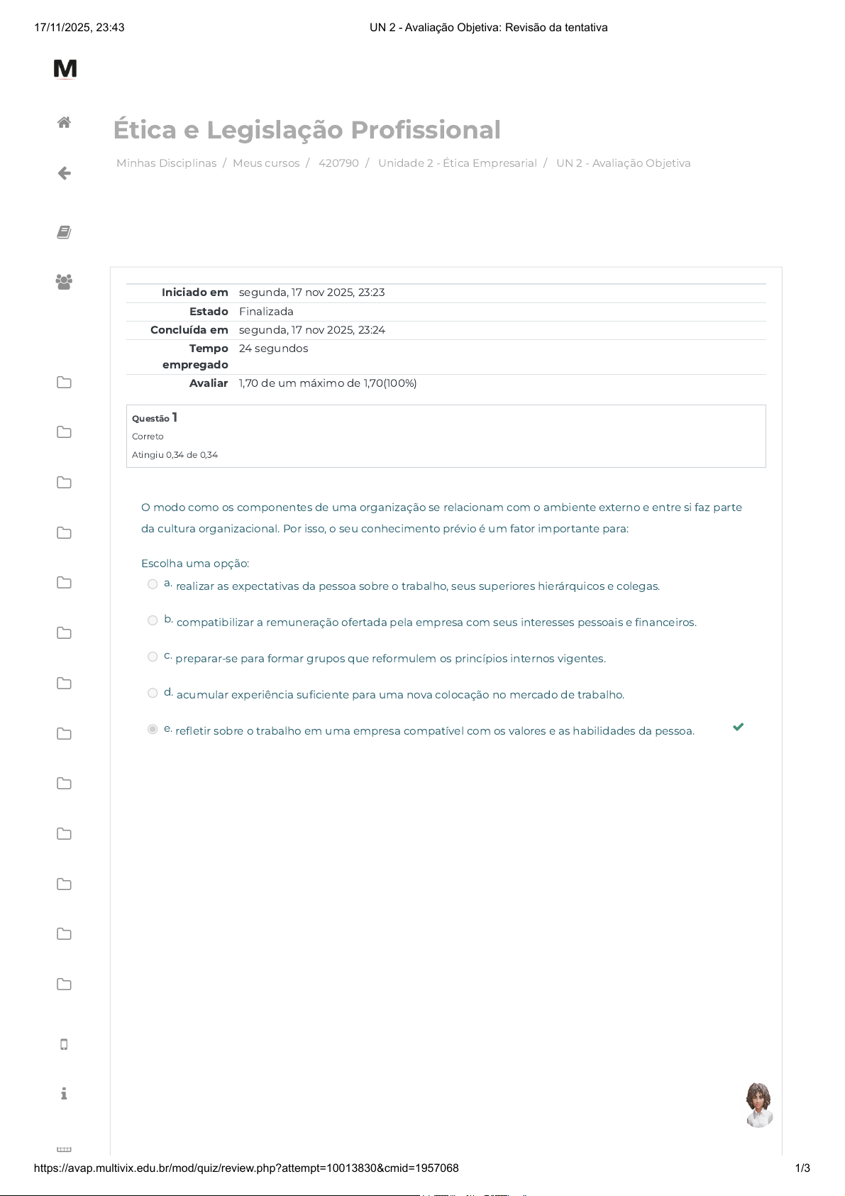 Minhas Disciplinas / Meus cursos / 420790 / Unidade 2 - Ética Empresarial / UN 2 - Avaliação Objetiva Ética e Legislação Profissional Iniciado em segunda, 17 nov 2025, 23:23 Estado Finalizada Concluída em segunda, 17 nov 2025, 23:24 Tempo empregado 24 segundos Avaliar 1,70 de um máximo de 1,70(100%) Questão 1 Correto Atingiu 0,34 de 0,34 O modo como os componentes de uma organização se relacionam com o ambiente externo e entre si faz parte da cultura organizacional. Por isso, o seu conhecimento prévio é um fator importante para: Escolha uma opção: a. realizar as expectativas da pessoa sobre o trabalho, seus superiores hierárquicos e colegas. b. compatibilizar a remuneração ofertada pela empresa com seus interesses pessoais e financeiros. c. preparar-se para formar grupos que reformulem os princípios internos vigentes. d. acumular experiência suficiente para uma nova colocação no mercado de trabalho. e. refletir sobre o trabalho em uma empresa compatível com os valores e as habilidades da pessoa. 17/11/2025, 23:43 UN 2 - Avaliação Objetiva: Revisão da tentativa https://avap.multivix.edu.br/mod/quiz/review.php?attempt=10013830&cmid=1957068 1/3 https://avap.multivix.edu.br/my/ https://avap.multivix.edu.br/course/view.php?id=36092 https://avap.multivix.edu.br/course/view.php?id=36092§ion=3 https://avap.multivix.edu.br/mod/quiz/view.php?id=1957068 https://avap.multivix.edu.br/my/ https://avap.multivix.edu.br/course/view.php?id=36092 https://avap.multivix.edu.br/user/index.php?id=36092 https://avap.multivix.edu.br/course/view.php?id=36092§ion=1 https://avap.multivix.edu.br/course/view.php?id=36092§ion=2 https://avap.multivix.edu.br/course/view.php?id=36092§ion=3 https://avap.multivix.edu.br/course/view.php?id=36092§ion=4 https://avap.multivix.edu.br/course/view.php?id=36092§ion=5 https://avap.multivix.edu.br/course/view.php?id=36092§ion=6 https://avap.multivix.edu.br/course/view.php?id=36092§ion=7 https://avap.multivix.edu.br/course/view.php?id=36092§ion=8 https://avap.multivix.edu.br/course/view.php?id=36092§ion=9 https://avap.multivix.edu.br/course/view.php?id=36092§ion=10 https://avap.multivix.edu.br/course/view.php?id=36092§ion=11 https://avap.multivix.edu.br/course/view.php?id=36092§ion=12 https://avap.multivix.edu.br/course/view.php?id=36092§ion=13 https://avap.multivix.edu.br/hooks/portal/ https://avap.multivix.edu.br/mod/page/view.php?id=1252%2F%22%20target%3D%22_blank https://avap.multivix.edu.br/calendar/view.php/ https://avap.multivix.edu.br/ https://avap.multivix.edu.br/ https://avap.multivix.edu.br/ https://avap.multivix.edu.br/ Questão 2 Correto Atingiu 0,34 de 0,34 Questão 3 Correto Atingiu 0,34 de 0,34 Quando existem barreiras de comunicação, a mensagem enviada pelo locutor pode ser recebida de maneira diversa pelo receptor. Considerando essa afirmação e o comportamento organizacional, pode-se afirmar que: Escolha uma opção: a. nas conversas com a equipe, deve-se utilizar mensagens e meios de comunicação informais. b. o profissional que possui comportamento ético adequado se utiliza de mensagens confidenciais em benefício próprio, tirando vantagens em situações determinadas. c. as relações interpessoais no âmbito de trabalho se tornam dificultosas quando o receptor da mensagem se julga conhecedor de muitos ou todos os assuntos. d. a comunicação constante dos objetivos da organização é facultativa, uma vez que as mudanças não geram insegurança nas pessoas. e. as novas tecnologias de informação e comunicação afetam minimamente as estruturas da organização e dos indivíduos que a compõem. O comportamento organizacional investiga os impactos que os indivíduos, os grupos e a estrutura têm no comportamento dentro de uma organização e, em seguida, utiliza esse conhecimento para ajudar as empresas a trabalharem com maior eficácia, pois o indivíduo possui necessidades que motivam seu comportamento na organização. Segundo a hierarquia das necessidades de Maslow, a necessidade que está no topo da pirâmide é: Escolha uma opção: a. Segurança. b. Estima. c. Autorrealização. d. Social. e. Ordem fisiológica. 17/11/2025, 23:43 UN 2 - Avaliação Objetiva: Revisão da tentativa https://avap.multivix.edu.br/mod/quiz/review.php?attempt=10013830&cmid=1957068 2/3 https://avap.multivix.edu.br/my/ https://avap.multivix.edu.br/course/view.php?id=36092 https://avap.multivix.edu.br/user/index.php?id=36092 https://avap.multivix.edu.br/course/view.php?id=36092§ion=1 https://avap.multivix.edu.br/course/view.php?id=36092§ion=2 https://avap.multivix.edu.br/course/view.php?id=36092§ion=3 https://avap.multivix.edu.br/course/view.php?id=36092§ion=4 https://avap.multivix.edu.br/course/view.php?id=36092§ion=5 https://avap.multivix.edu.br/course/view.php?id=36092§ion=6 https://avap.multivix.edu.br/course/view.php?id=36092§ion=7 https://avap.multivix.edu.br/course/view.php?id=36092§ion=8 https://avap.multivix.edu.br/course/view.php?id=36092§ion=9 https://avap.multivix.edu.br/course/view.php?id=36092§ion=10 https://avap.multivix.edu.br/course/view.php?id=36092§ion=11 https://avap.multivix.edu.br/course/view.php?id=36092§ion=12 https://avap.multivix.edu.br/course/view.php?id=36092§ion=13 https://avap.multivix.edu.br/hooks/portal/ https://avap.multivix.edu.br/mod/page/view.php?id=1252%2F%22%20target%3D%22_blank https://avap.multivix.edu.br/calendar/view.php/ https://avap.multivix.edu.br/ https://avap.multivix.edu.br/ https://avap.multivix.edu.br/ https://avap.multivix.edu.br/ Questão 4 Correto Atingiu 0,34 de 0,34 Questão 5 Correto Atingiu 0,34 de 0,34 Comportamento organizacional é o estudo sistemático de como as pessoas se portam no ambiente organizacional e é realizado a partir dos seguintes elementos: Escolha uma opção: a. indivíduo, hierarquia, grupo. b. hierarquia, grupo, estrutura. c. indivíduo, estrutura, grupo. d. estrutura, ambiente externo e indivíduo. e. grupo, hierarquia, ambiente externo. Os in